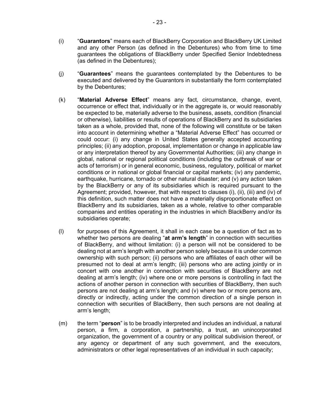 - 23 - (i) “Guarantors” means each of BlackBerry Corporation and BlackBerry UK Limited and any other Person (as defined in the Debentures) who from time to time guarantees the obligations of BlackBerry under Specified Senior Indebtedness (as defined in the Debentures); (j) “Guarantees” means the guarantees contemplated by the Debentures to be executed and delivered by the Guarantors in substantially the form contemplated by the Debentures; (k) “Material Adverse Effect” means any fact, circumstance, change, event, occurrence or effect that, individually or in the aggregate is, or would reasonably be expected to be, materially adverse to the business, assets, condition (financial or otherwise), liabilities or results of operations of BlackBerry and its subsidiaries taken as a whole, provided that, none of the following will constitute or be taken into account in determining whether a “Material Adverse Effect” has occurred or could occur: (i) any change in United States generally accepted accounting principles; (ii) any adoption, proposal, implementation or change in applicable law or any interpretation thereof by any Governmental Authorities; (iii) any change in global, national or regional political conditions (including the outbreak of war or acts of terrorism) or in general economic, business, regulatory, political or market conditions or in national or global financial or capital markets; (iv) any pandemic, earthquake, hurricane, tornado or other natural disaster; and (v) any action taken by the BlackBerry or any of its subsidiaries which is required pursuant to the Agreement; provided, however, that with respect to clauses (i), (ii), (iii) and (iv) of this definition, such matter does not have a materially disproportionate effect on BlackBerry and its subsidiaries, taken as a whole, relative to other comparable companies and entities operating in the industries in which BlackBerry and/or its subsidiaries operate; (l) for purposes of this Agreement, it shall in each case be a question of fact as to whether two persons are dealing “at arm’s length” in connection with securities of BlackBerry, and without limitation: (i) a person will not be considered to be dealing not at arm’s length with another person solely because it is under common ownership with such person; (ii) persons who are affiliates of each other will be presumed not to deal at arm’s length; (iii) persons who are acting jointly or in concert with one another in connection with securities of BlackBerry are not dealing at arm’s length; (iv) where one or more persons is controlling in fact the actions of another person in connection with securities of BlackBerry, then such persons are not dealing at arm’s length; and (v) where two or more persons are, directly or indirectly, acting under the common direction of a single person in connection with securities of BlackBerry, then such persons are not dealing at arm’s length; (m) the term “person” is to be broadly interpreted and includes an individual, a natural person, a firm, a corporation, a partnership, a trust, an unincorporated organization, the government of a country or any political subdivision thereof, or any agency or department of any such government, and the executors, administrators or other legal representatives of an individual in such capacity;