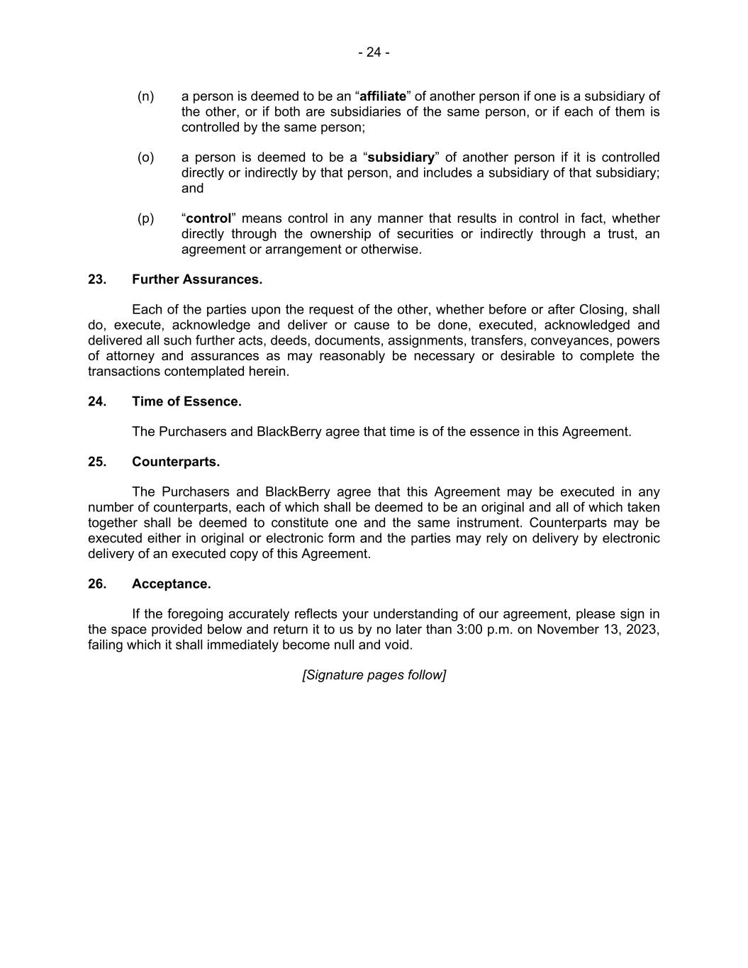 - 24 - (n) a person is deemed to be an “affiliate” of another person if one is a subsidiary of the other, or if both are subsidiaries of the same person, or if each of them is controlled by the same person; (o) a person is deemed to be a “subsidiary” of another person if it is controlled directly or indirectly by that person, and includes a subsidiary of that subsidiary; and (p) “control” means control in any manner that results in control in fact, whether directly through the ownership of securities or indirectly through a trust, an agreement or arrangement or otherwise. 23. Further Assurances. Each of the parties upon the request of the other, whether before or after Closing, shall do, execute, acknowledge and deliver or cause to be done, executed, acknowledged and delivered all such further acts, deeds, documents, assignments, transfers, conveyances, powers of attorney and assurances as may reasonably be necessary or desirable to complete the transactions contemplated herein. 24. Time of Essence. The Purchasers and BlackBerry agree that time is of the essence in this Agreement. 25. Counterparts. The Purchasers and BlackBerry agree that this Agreement may be executed in any number of counterparts, each of which shall be deemed to be an original and all of which taken together shall be deemed to constitute one and the same instrument. Counterparts may be executed either in original or electronic form and the parties may rely on delivery by electronic delivery of an executed copy of this Agreement. 26. Acceptance. If the foregoing accurately reflects your understanding of our agreement, please sign in the space provided below and return it to us by no later than 3:00 p.m. on November 13, 2023, failing which it shall immediately become null and void. [Signature pages follow]