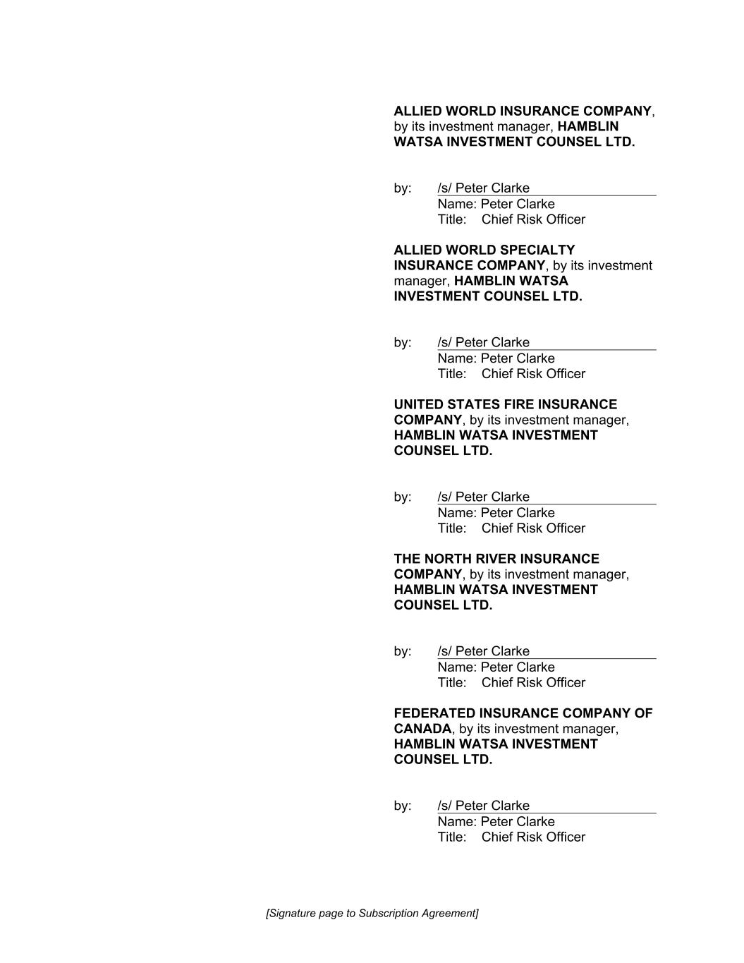 [Signature page to Subscription Agreement] ALLIED WORLD INSURANCE COMPANY, by its investment manager, HAMBLIN WATSA INVESTMENT COUNSEL LTD. by: /s/ Peter Clarke Name: Peter Clarke Title: Chief Risk Officer ALLIED WORLD SPECIALTY INSURANCE COMPANY, by its investment manager, HAMBLIN WATSA INVESTMENT COUNSEL LTD. by: /s/ Peter Clarke Name: Peter Clarke Title: Chief Risk Officer UNITED STATES FIRE INSURANCE COMPANY, by its investment manager, HAMBLIN WATSA INVESTMENT COUNSEL LTD. by: /s/ Peter Clarke Name: Peter Clarke Title: Chief Risk Officer THE NORTH RIVER INSURANCE COMPANY, by its investment manager, HAMBLIN WATSA INVESTMENT COUNSEL LTD. by: /s/ Peter Clarke Name: Peter Clarke Title: Chief Risk Officer FEDERATED INSURANCE COMPANY OF CANADA, by its investment manager, HAMBLIN WATSA INVESTMENT COUNSEL LTD. by: /s/ Peter Clarke Name: Peter Clarke Title: Chief Risk Officer