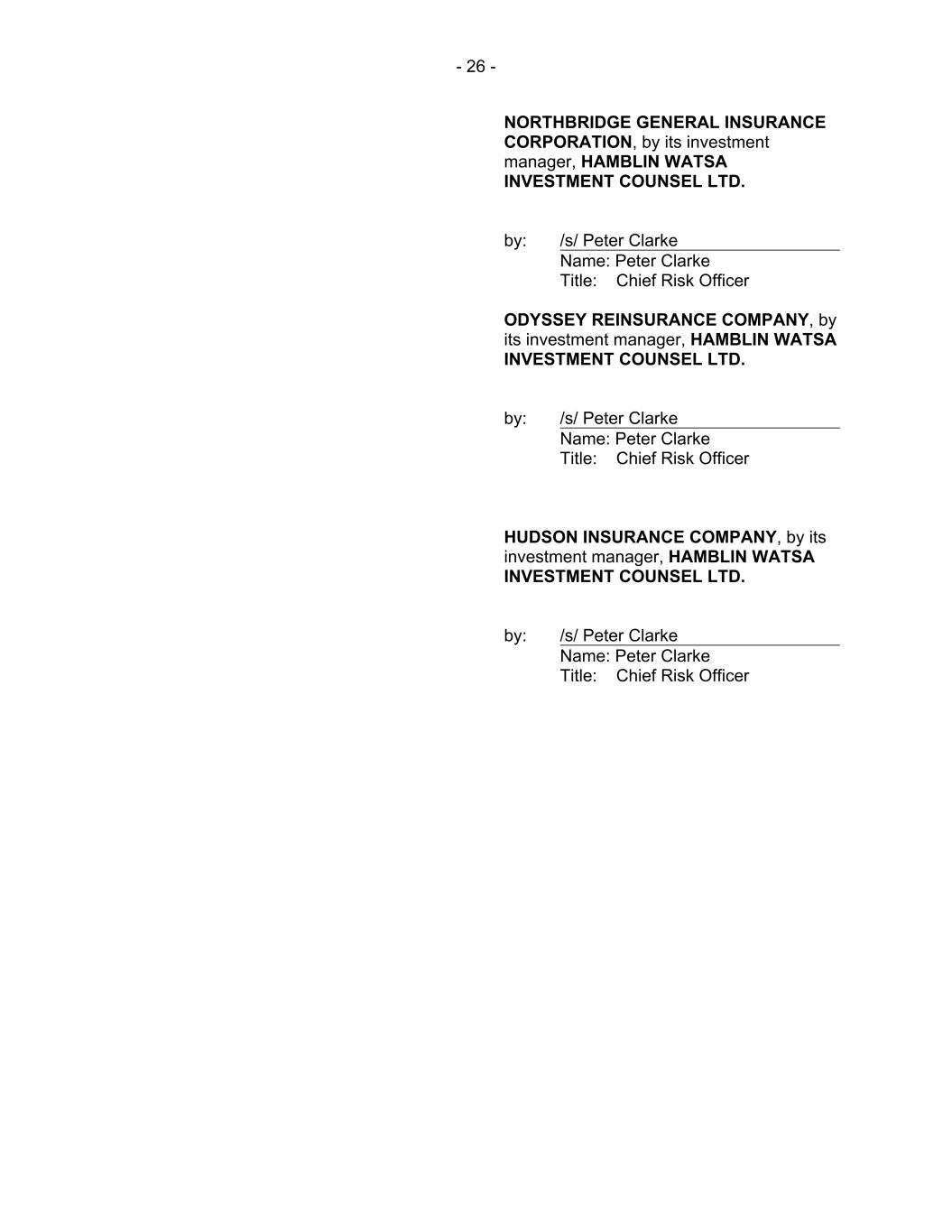 - 26 - NORTHBRIDGE GENERAL INSURANCE CORPORATION, by its investment manager, HAMBLIN WATSA INVESTMENT COUNSEL LTD. by: /s/ Peter Clarke Name: Peter Clarke Title: Chief Risk Officer ODYSSEY REINSURANCE COMPANY, by its investment manager, HAMBLIN WATSA INVESTMENT COUNSEL LTD. by: /s/ Peter Clarke Name: Peter Clarke Title: Chief Risk Officer HUDSON INSURANCE COMPANY, by its investment manager, HAMBLIN WATSA INVESTMENT COUNSEL LTD. by: /s/ Peter Clarke Name: Peter Clarke Title: Chief Risk Officer