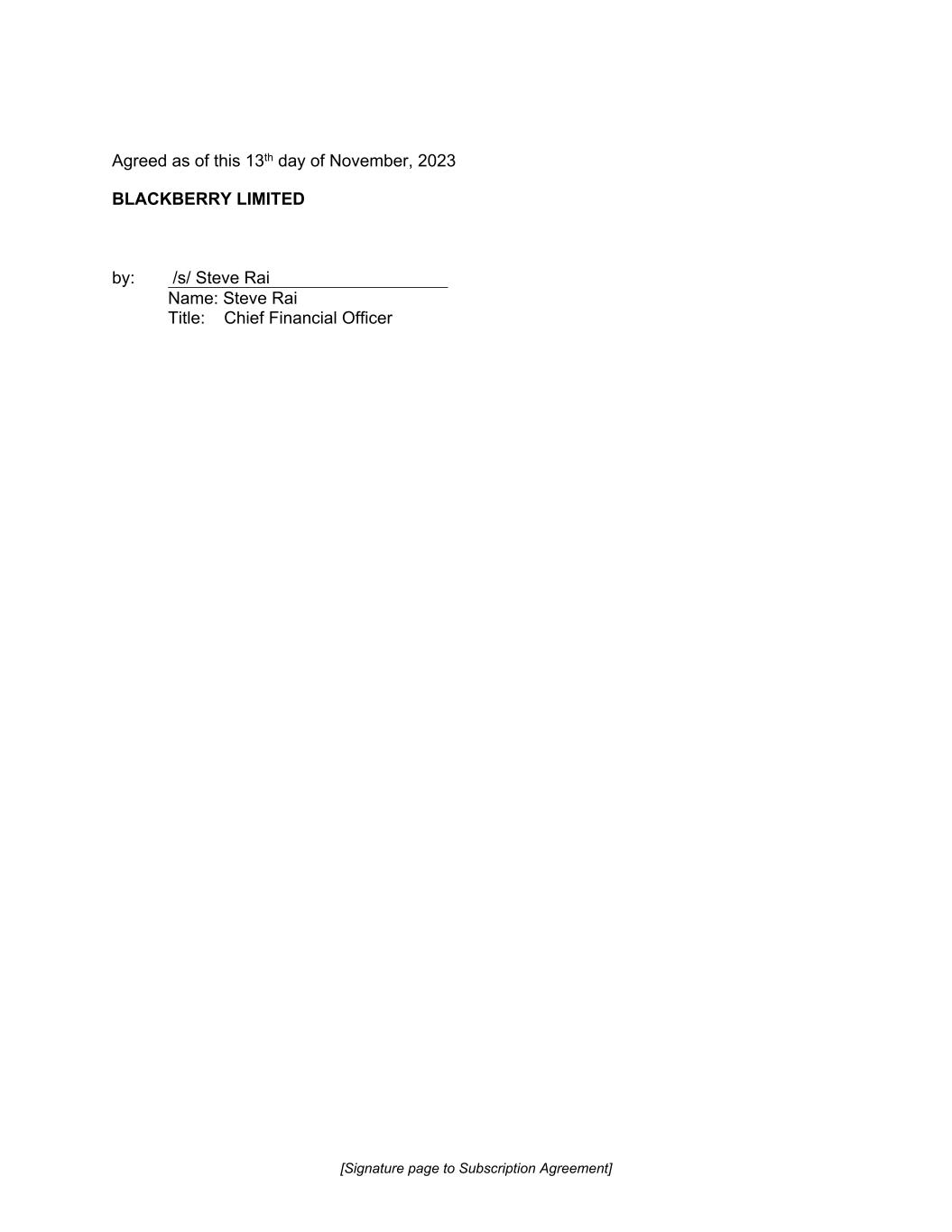 [Signature page to Subscription Agreement] Agreed as of this 13th day of November, 2023 BLACKBERRY LIMITED by: /s/ Steve Rai Name: Steve Rai Title: Chief Financial Officer