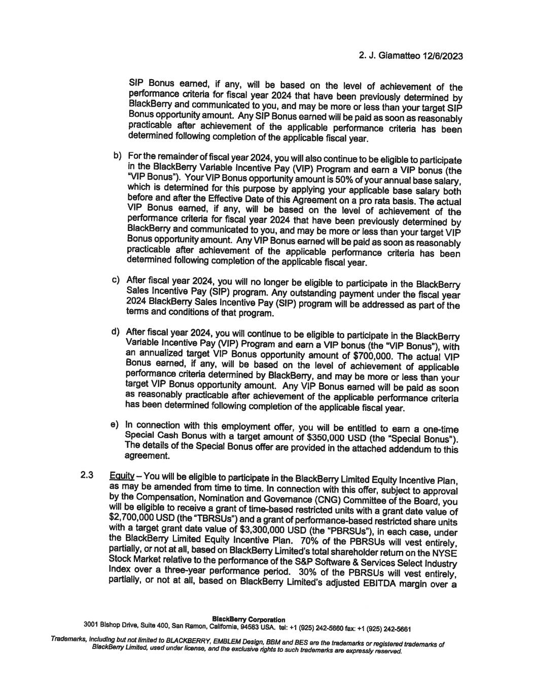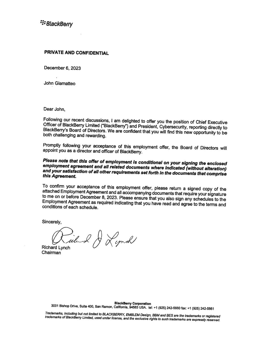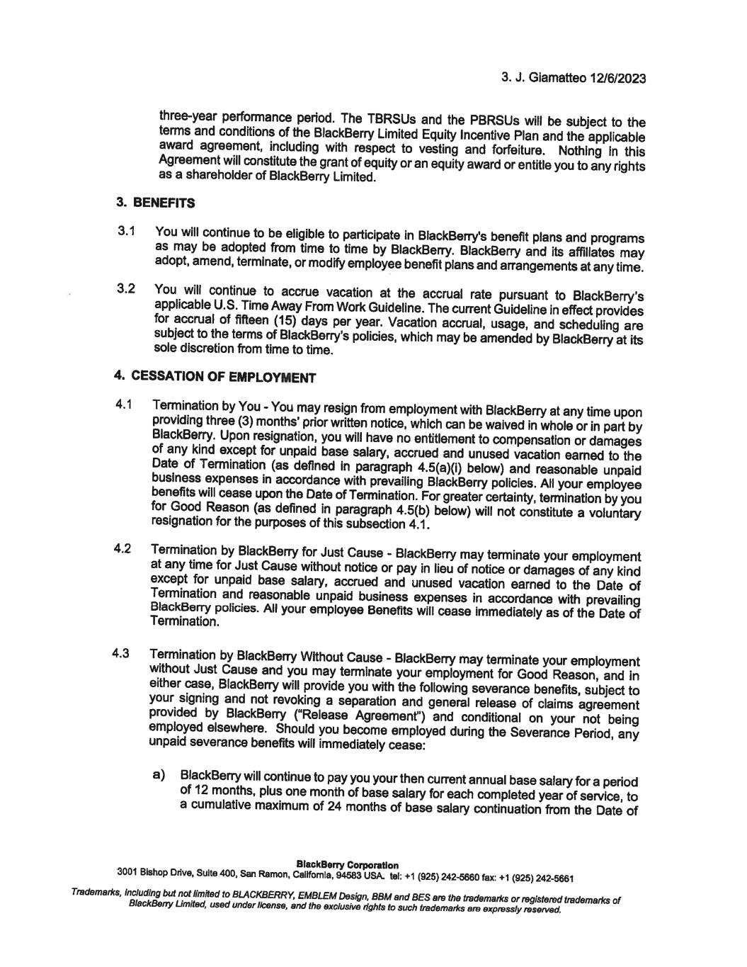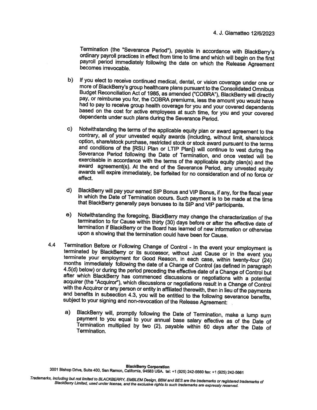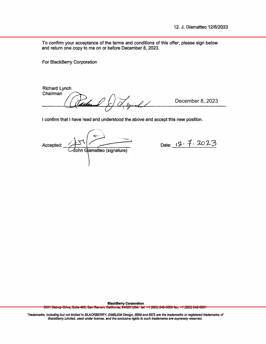 12. J. Giamatteo 12/6/2023 To confirm your acceptance of the terms and conditions of this offer, please sign below and return one copy to me on or before December 8, 2023. For BlackBerry Corporation Richard Lynch Chainnan @�# � av'r---L/ I confirm that I have read and understood the above and accept this new position. BlackBerry Corporation Date: I 'J. ' ·t · 7.01-. 3 3001 Bishop Drive, Suite 400, San Ramon, Callfomla, 94583 USA. tel: +1 (925) 242-5660 fax: +1 (925) 242-5661 Trademarl<s, including but not limited to BLACKBERRY, EMBLEM Design, BBM and BES are the trademarl<s or registered trademarl<s of BlackBerry Limited, used under license, end the exclusive rights to such trademarl<s are expressly reserved. December 8, 2023