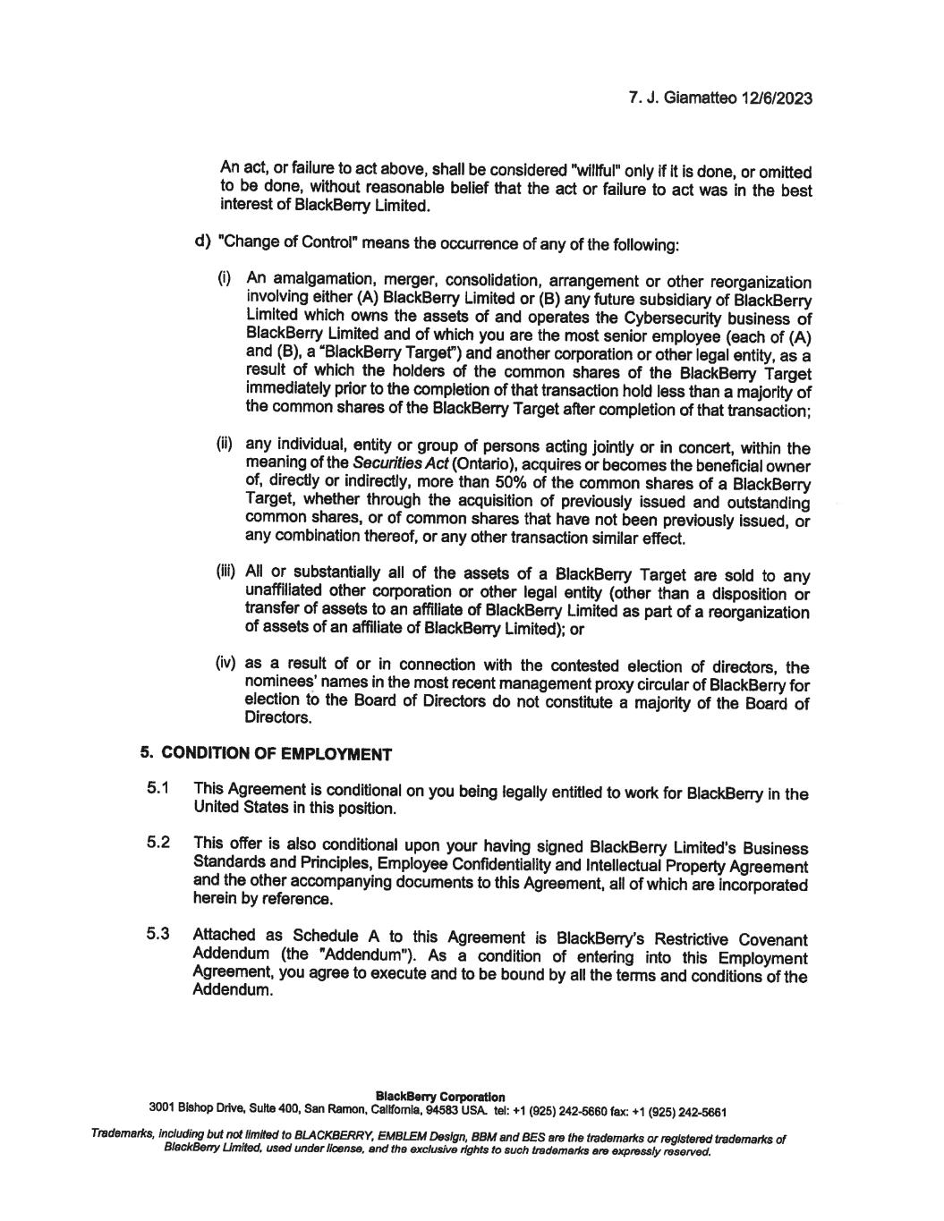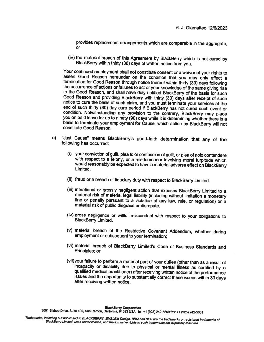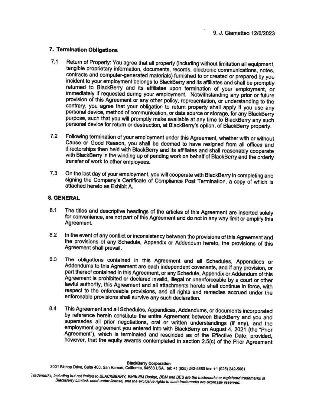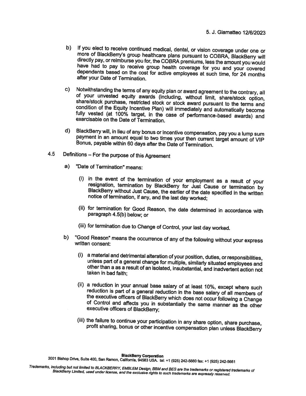 12. J. Giamatteo 12/6/2023 To confirm your acceptance of the terms and conditions of this offer, please sign below and return one copy to me on or before December 8, 2023. For BlackBerry Corporation Richard Lynch Chainnan @�# � av'r---L/ I confirm that I have read and understood the above and accept this new position. BlackBerry Corporation Date: I 'J. ' ·t · 7.01-. 3 3001 Bishop Drive, Suite 400, San Ramon, Callfomla, 94583 USA. tel: +1 (925) 242-5660 fax: +1 (925) 242-5661 Trademarl<s, including but not limited to BLACKBERRY, EMBLEM Design, BBM and BES are the trademarl<s or registered trademarl<s of BlackBerry Limited, used under license, end the exclusive rights to such trademarl<s are expressly reserved. December 8, 2023