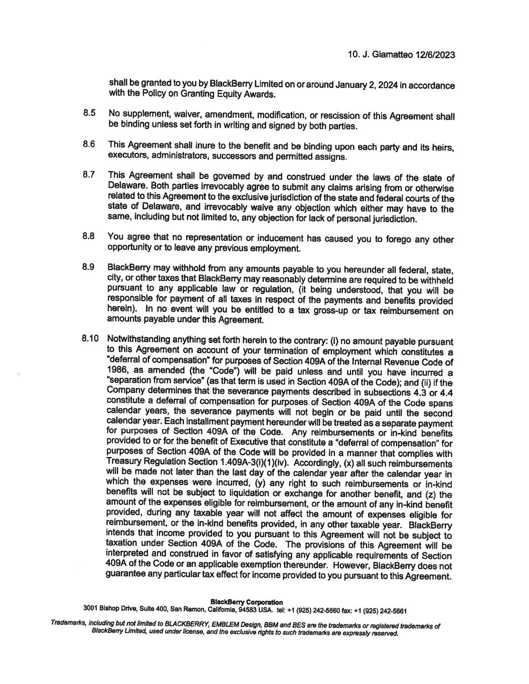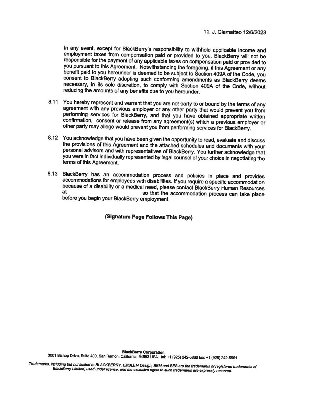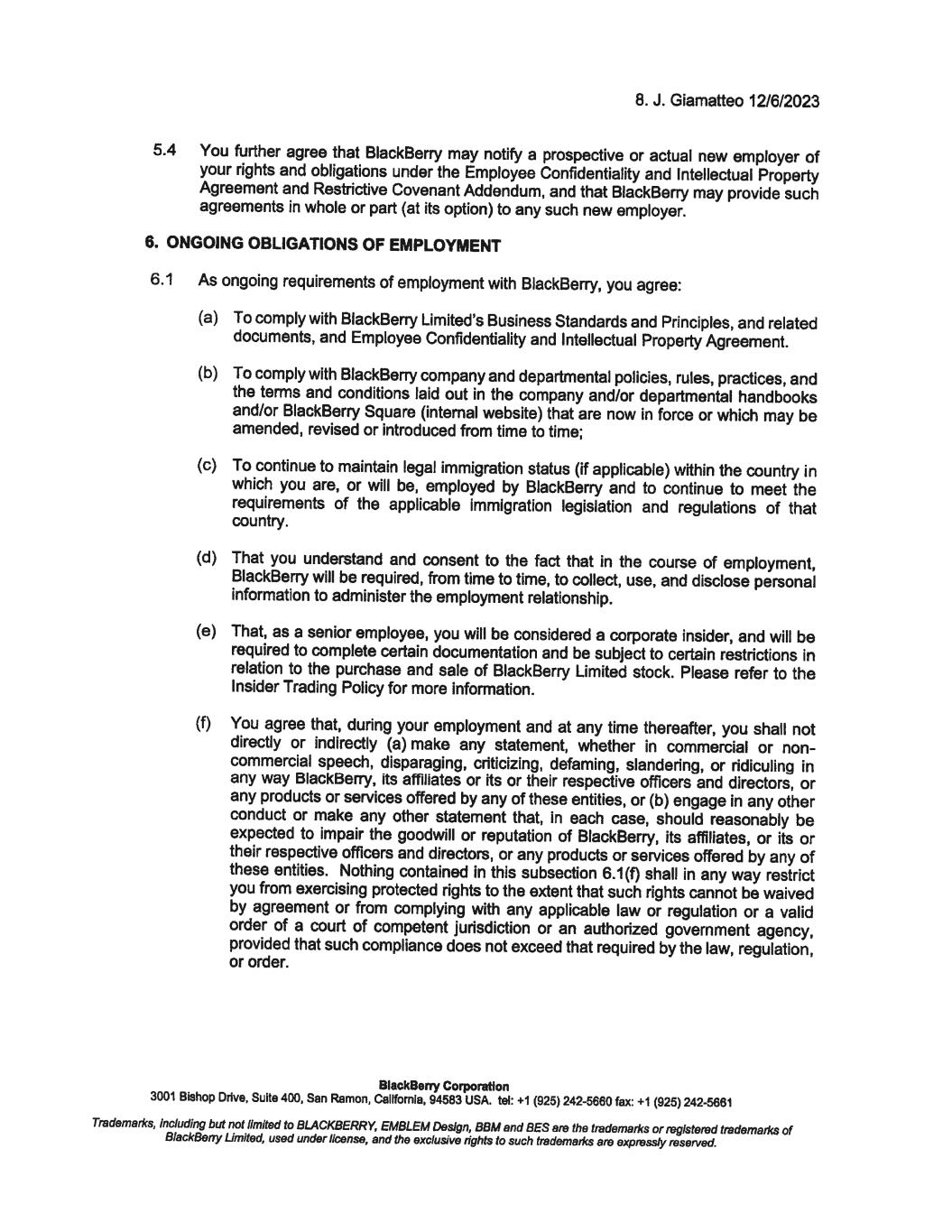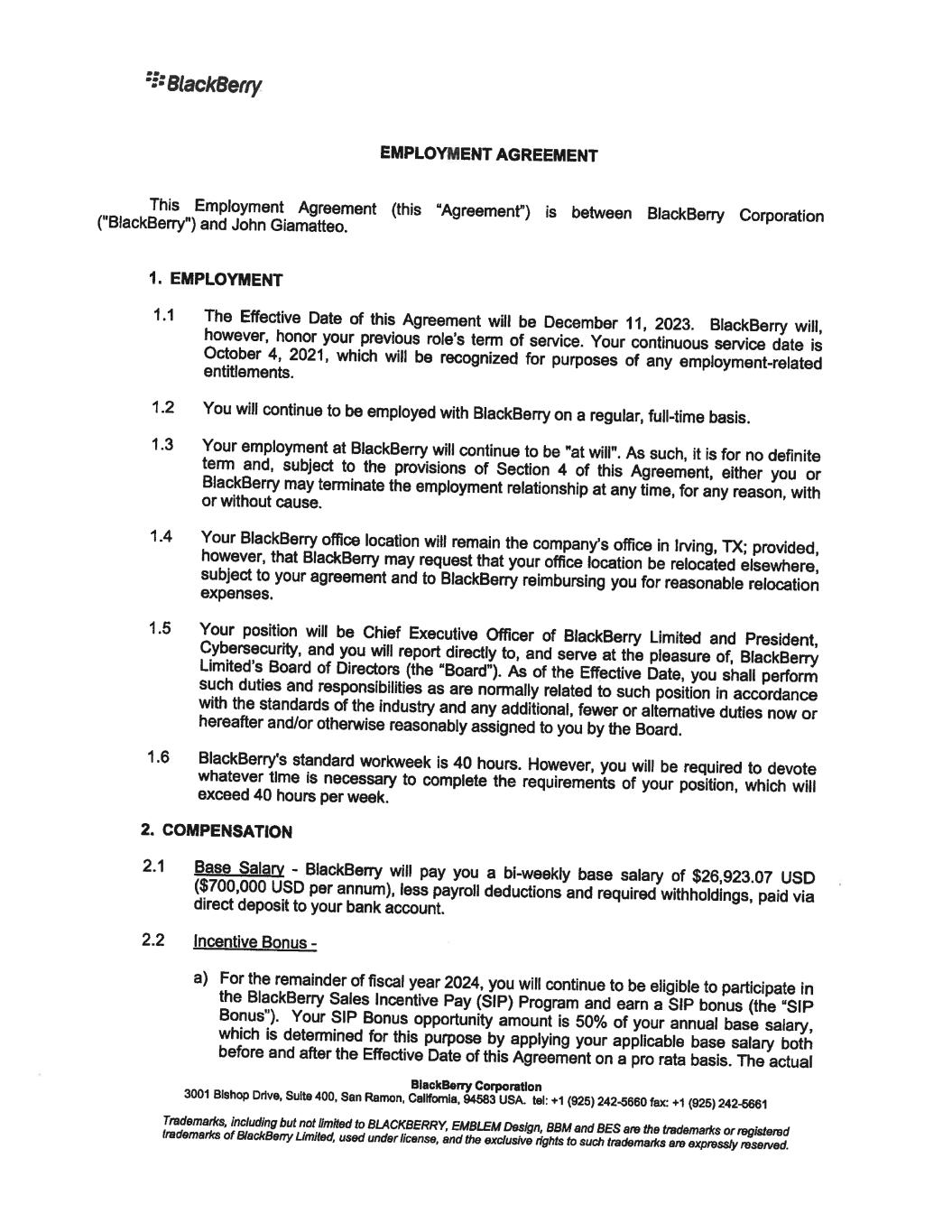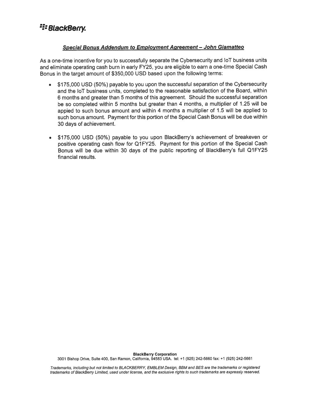 12. J. Giamatteo 12/6/2023 To confirm your acceptance of the terms and conditions of this offer, please sign below and return one copy to me on or before December 8, 2023. For BlackBerry Corporation Richard Lynch Chainnan @�# � av'r---L/ I confirm that I have read and understood the above and accept this new position. BlackBerry Corporation Date: I 'J. ' ·t · 7.01-. 3 3001 Bishop Drive, Suite 400, San Ramon, Callfomla, 94583 USA. tel: +1 (925) 242-5660 fax: +1 (925) 242-5661 Trademarl<s, including but not limited to BLACKBERRY, EMBLEM Design, BBM and BES are the trademarl<s or registered trademarl<s of BlackBerry Limited, used under license, end the exclusive rights to such trademarl<s are expressly reserved. December 8, 2023