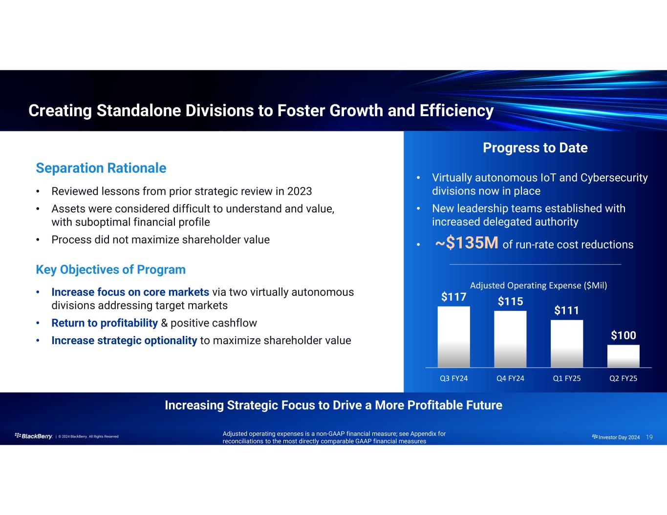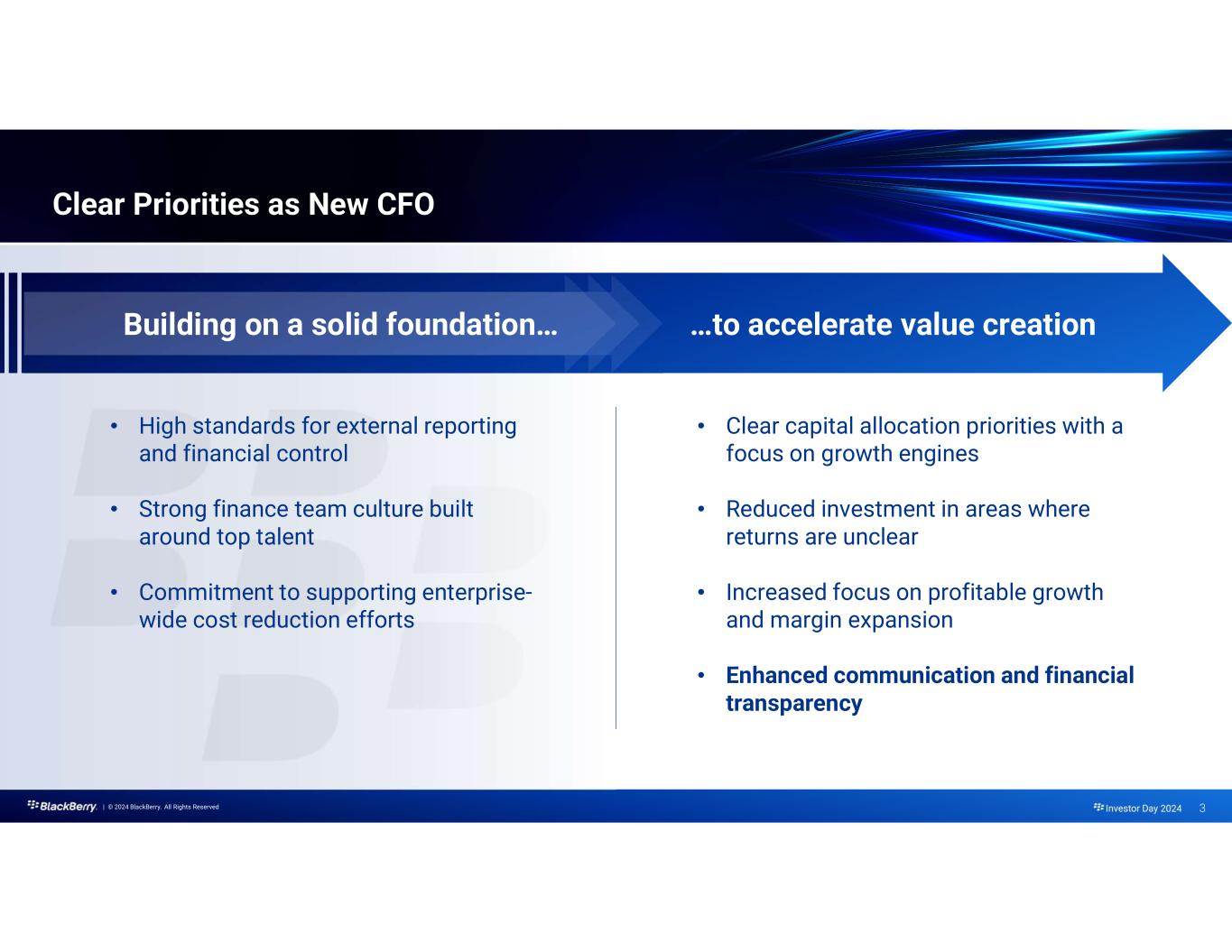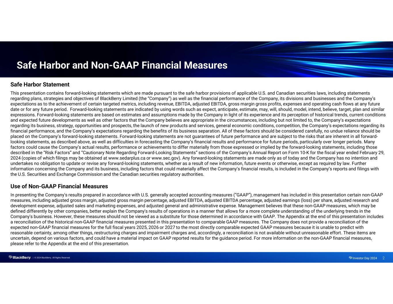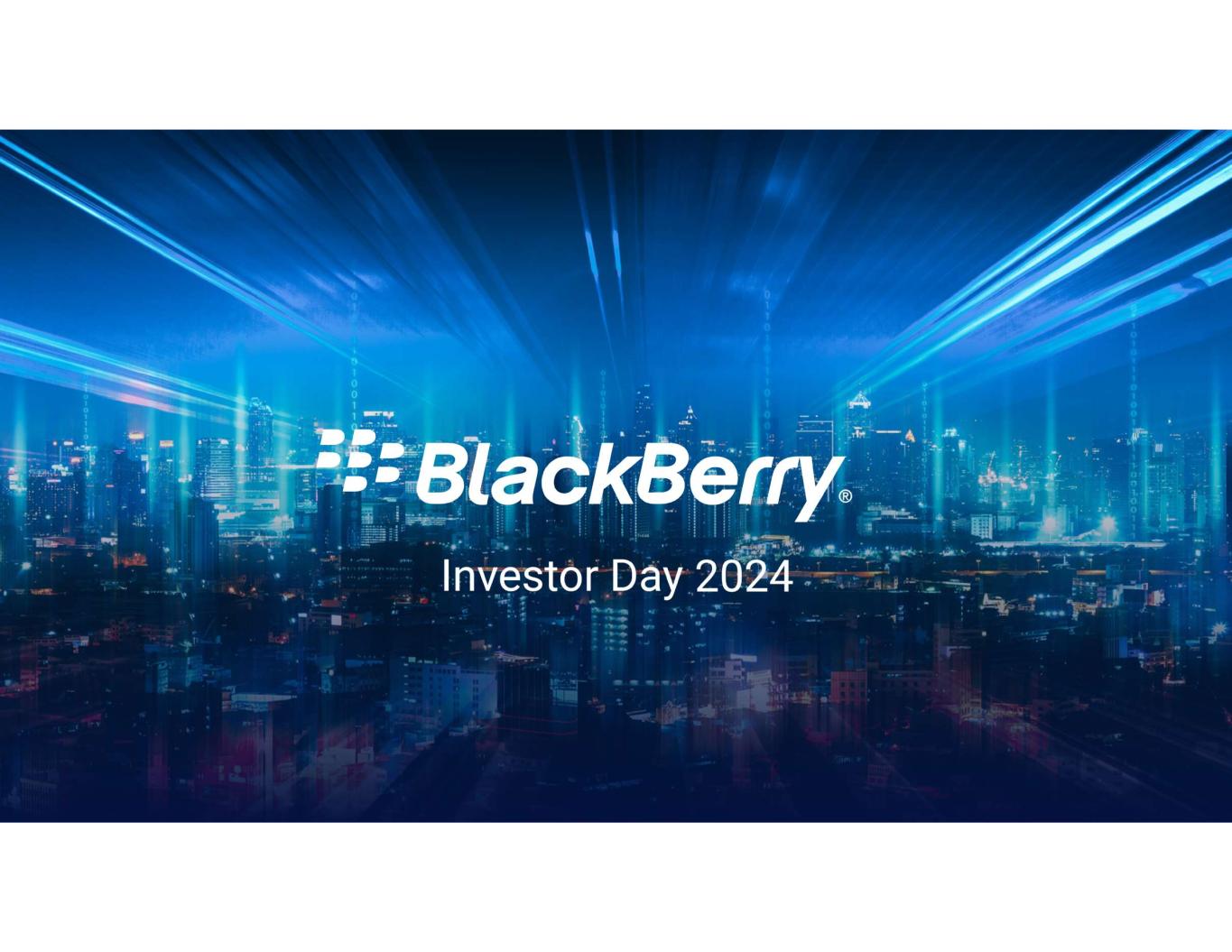 © 2024 BlackBerry. All Rights Reserved 2 Safe Harbor and Non-GAAP Financial Measures Safe Harbor Statement This presentation contains forward-looking statements which are made pursuant to the safe harbor provisions of applicable U.S. and Canadian securities laws, including statements regarding plans, strategies and objectives of BlackBerry Limited (the “Company”) as well as the financial performance of the Company, its divisions and businesses and the Company’s expectations as to the achievement of certain targeted metrics, including revenue, EBITDA, adjusted EBITDA, gross margin gross profits, expenses and operating cash flows at any future date or for any future period. Forward-looking statements are indicated by using words such as expect, anticipate, estimate, may, will, should, model, intend, believe, target, plan and similar expressions. Forward-looking statements are based on estimates and assumptions made by the Company in light of its experience and its perception of historical trends, current conditions and expected future developments as well as other factors that the Company believes are appropriate in the circumstances, including but not limited to, the Company’s expectations regarding its business, strategy, opportunities and prospects, the launch of new products and services, general economic conditions, competition, the Company’s expectations regarding its financial performance, and the Company’s expectations regarding the benefits of its business separation. All of these factors should be considered carefully, no undue reliance should be placed on the Company’s forward-looking statements. Forward-looking statements are not guarantees of future performance and are subject to the risks that are inherent in all forward- looking statements, as described above, as well as difficulties in forecasting the Company’s financial results and performance for future periods, particularly over longer periods. Many factors could cause the Company’s actual results, performance or achievements to differ materially from those expressed or implied by the forward-looking statements, including those described in the “Risk Factors” and “Cautionary Note Regarding Forward-Looking Statements” sections of the Company’s Annual Report on Form 10-K for the fiscal year ended February 29, 2024 (copies of which filings may be obtained at www.sedarplus.ca or www.sec.gov). Any forward-looking statements are made only as of today and the Company has no intention and undertakes no obligation to update or revise any forward-looking statements, whether as a result of new information, future events or otherwise, except as required by law. Further information concerning the Company and its business, including factors that could materially affect the Company’s financial results, is included in the Company’s reports and filings with the U.S. Securities and Exchange Commission and the Canadian securities regulatory authorities. Use of Non-GAAP Financial Measures In presenting the Company's results prepared in accordance with U.S. generally accepted accounting measures (“GAAP”), management has included in this presentation certain non-GAAP measures, including adjusted gross margin, adjusted gross margin percentage, adjusted EBITDA, adjusted EBITDA percentage, adjusted earnings (loss) per share, adjusted research and development expense, adjusted sales and marketing expenses, and adjusted general and administrative expense. Management believes that these non-GAAP measures, which may be defined differently by other companies, better explain the Company's results of operations in a manner that allows for a more complete understanding of the underlying trends in the Company's business. However, these measures should not be viewed as a substitute for those determined in accordance with GAAP. The Appendix at the end of this presentation includes a reconciliation of the historical non-GAAP financial measures presented in this presentation to comparable GAAP measures. The Company does not provide a reconciliation of the expected non-GAAP financial measures for the full fiscal years 2025, 2026 or 2027 to the most directly comparable expected GAAP measures because it is unable to predict with reasonable certainty, among other things, restructuring charges and impairment charges and, accordingly, a reconciliation is not available without unreasonable effort. These items are uncertain, depend on various factors, and could have a material impact on GAAP reported results for the guidance period. For more information on the non-GAAP financial measures, please refer to the Appendix at the end of this presentation.
