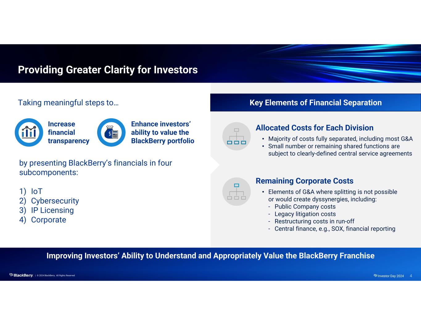 © 2024 BlackBerry. All Rights Reserved 3 Clear Priorities as New CFO • High standards for external reporting and financial control • Strong finance team culture built around top talent • Commitment to supporting enterprise- wide cost reduction efforts • Clear capital allocation priorities with a focus on growth engines • Reduced investment in areas where returns are unclear • Increased focus on profitable growth and margin expansion • Enhanced communication and financial transparency Building on a solid foundation… …to accelerate value creation