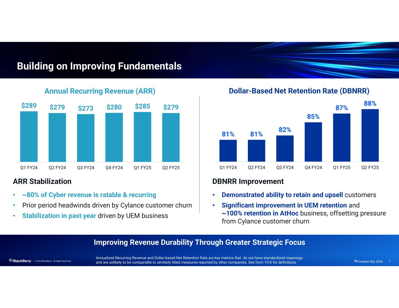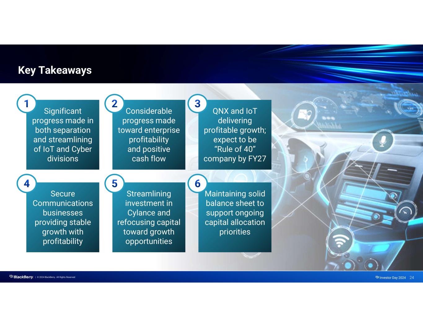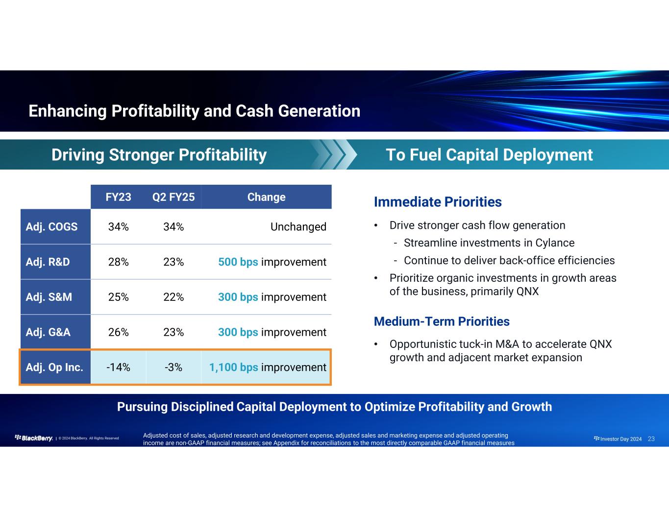 © 2024 BlackBerry. All Rights Reserved 23 Enhancing Profitability and Cash Generation ChangeQ2 FY25FY23 Unchanged34%34%Adj. COGS 500 bps improvement23%28%Adj. R&D 300 bps improvement22%25%Adj. S&M 300 bps improvement23%26%Adj. G&A 1,100 bps improvement-3%-14%Adj. Op Inc. Pursuing Disciplined Capital Deployment to Optimize Profitability and Growth Immediate Priorities • Drive stronger cash flow generation - Streamline investments in Cylance - Continue to deliver back-office efficiencies • Prioritize organic investments in growth areas of the business, primarily QNX Medium-Term Priorities • Opportunistic tuck-in M&A to accelerate QNX growth and adjacent market expansion Driving Stronger Profitability To Fuel Capital Deployment Adjusted cost of sales, adjusted research and development expense, adjusted sales and marketing expense and adjusted operating income are non-GAAP financial measures; see Appendix for reconciliations to the most directly comparable GAAP financial measures