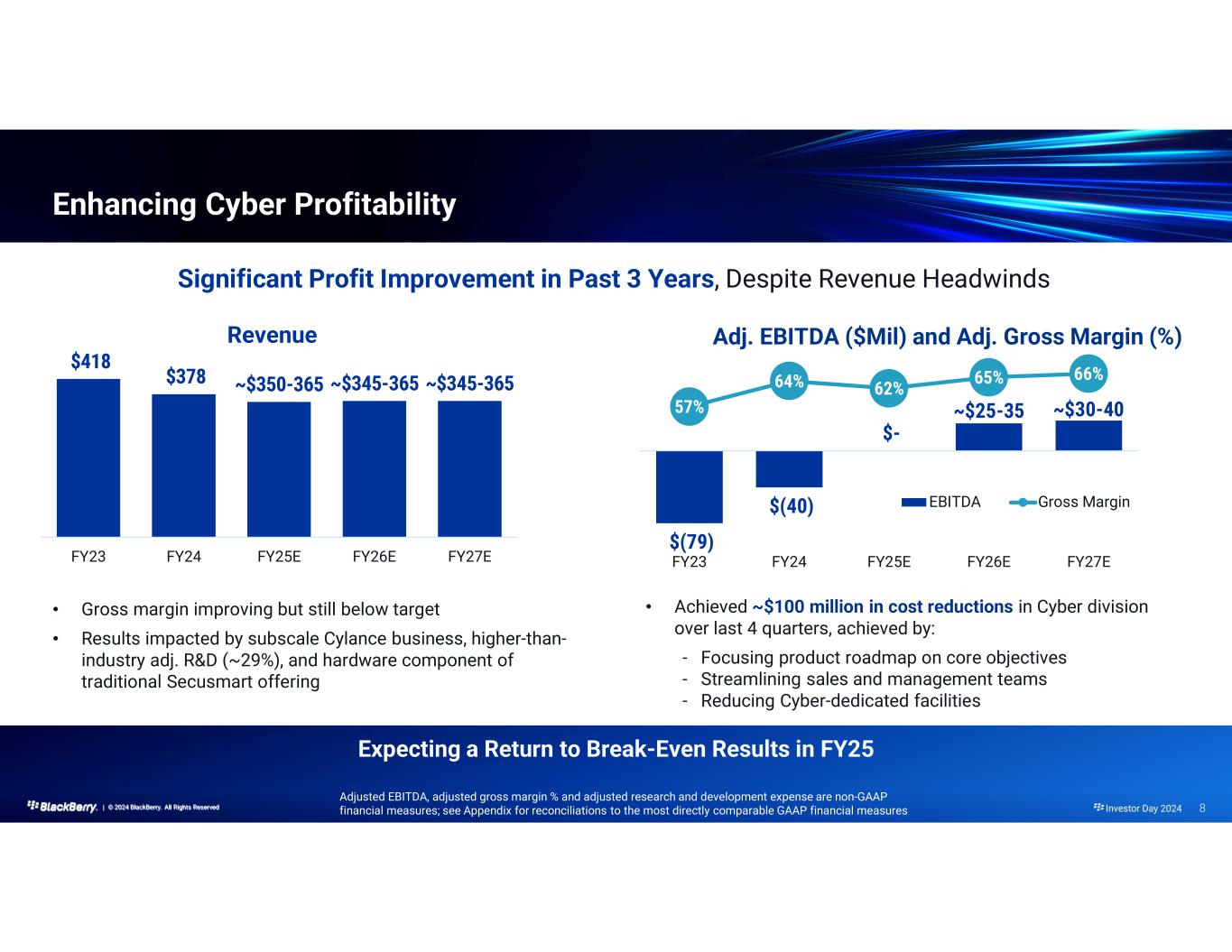 © 2024 BlackBerry. All Rights Reserved 7 ARR Stabilization • ~80% of Cyber revenue is ratable & recurring • Prior period headwinds driven by Cylance customer churn • Stabilization in past year driven by UEM business DBNRR Improvement • Demonstrated ability to retain and upsell customers • Significant improvement in UEM retention and ~100% retention in AtHoc business, offsetting pressure from Cylance customer churn $289 $279 $273 $280 $285 $279 Q1 FY24 Q2 FY24 Q3 FY24 Q4 FY24 Q1 FY25 Q2 FY25 Annual Recurring Revenue (ARR) 81% 81% 82% 85% 87% 88% Q1 FY24 Q2 FY24 Q3 FY24 Q4 FY24 Q1 FY25 Q2 FY25 Dollar-Based Net Retention Rate (DBNRR) Building on Improving Fundamentals Improving Revenue Durability Through Greater Strategic Focus Annualized Recurring Revenue and Dollar-based Net Retention Rate are key metrics that do not have standardized meanings and are unlikely to be comparable to similarly titled measures reported by other companies. See form 10-K for definitions.