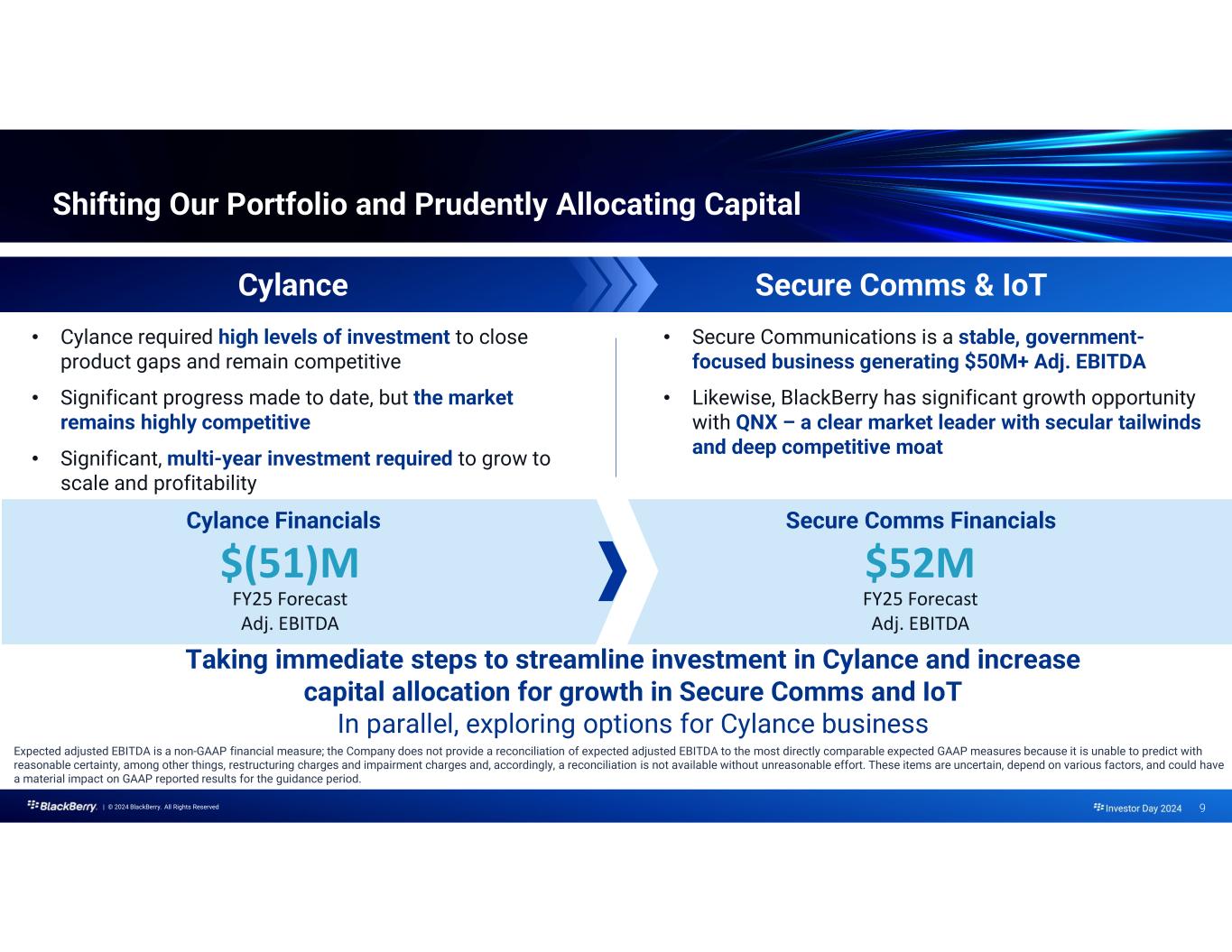 © 2024 BlackBerry. All Rights Reserved 8 l rr . ll i t r Enhancing Cyber Profitability • Gross margin improving but still below target • Results impacted by subscale Cylance business, higher-than- industry adj. R&D (~29%), and hardware component of traditional Secusmart offering • Achieved ~$100 million in cost reductions in Cyber division over last 4 quarters, achieved by: - Focusing product roadmap on core objectives - Streamlining sales and management teams - Reducing Cyber-dedicated facilities Expecting a Return to Break-Even Results in FY25 $418 $378 ~$350-365 ~$345-365 ~$345-365 FY23 FY24 FY25E FY26E FY27E Revenue $(79) $(40) $- ~$25-35 ~$30-4057% 64% 62% 65% 66% 20% 30% 40% 50% 60% 70% $(100) $(50) $- $50 $100 FY23 FY24 FY25E FY26E FY27E Adj. EBITDA ($Mil) and Adj. Gross Margin (%) EBITDA Gross Margin Significant Profit Improvement in Past 3 Years, Despite Revenue Headwinds Adjusted EBITDA, adjusted gross margin % and adjusted research and development expense are non-GAAP financial measures; see Appendix for reconciliations to the most directly comparable GAAP financial measures