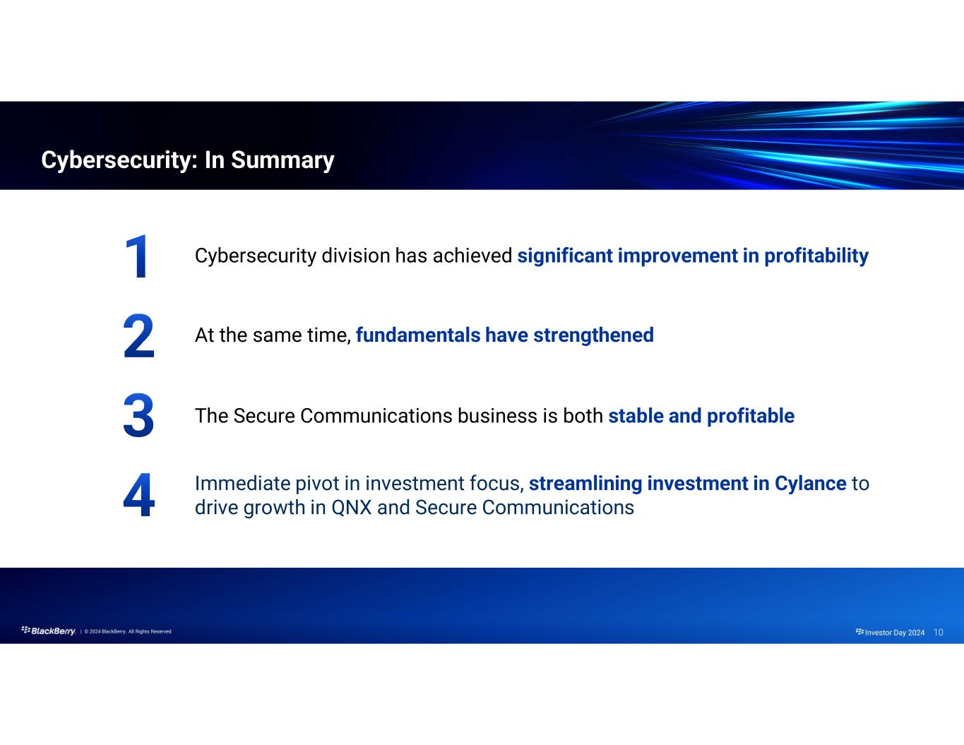 © 2024 BlackBerry. All Rights Reserved 9 Shifting Our Portfolio and Prudently Allocating Capital • Secure Communications is a stable, government- focused business generating $50M+ Adj. EBITDA • Likewise, BlackBerry has significant growth opportunity with QNX – a clear market leader with secular tailwinds and deep competitive moat • Cylance required high levels of investment to close product gaps and remain competitive • Significant progress made to date, but the market remains highly competitive • Significant, multi-year investment required to grow to scale and profitability Cylance Secure Comms & IoT Taking immediate steps to streamline investment in Cylance and increase capital allocation for growth in Secure Comms and IoT In parallel, exploring options for Cylance business $(51)M FY25 Forecast Adj. EBITDA $52M FY25 Forecast Adj. EBITDA Cylance Financials Secure Comms Financials Expected adjusted EBITDA is a non-GAAP financial measure; the Company does not provide a reconciliation of expected adjusted EBITDA to the most directly comparable expected GAAP measures because it is unable to predict with reasonable certainty, among other things, restructuring charges and impairment charges and, accordingly, a reconciliation is not available without unreasonable effort. These items are uncertain, depend on various factors, and could have a material impact on GAAP reported results for the guidance period.