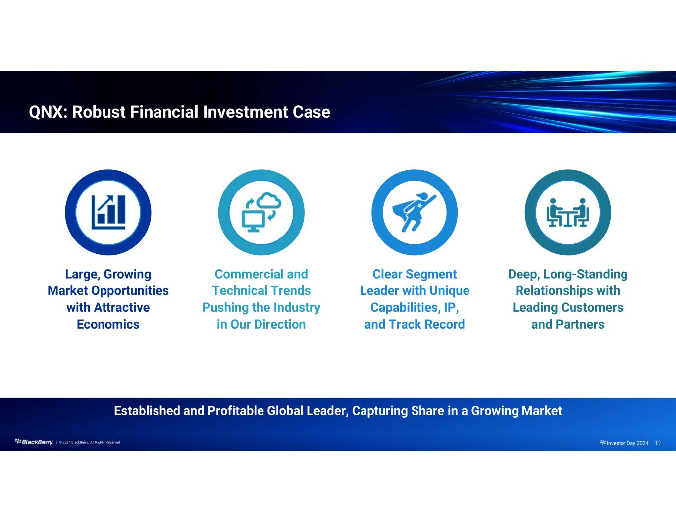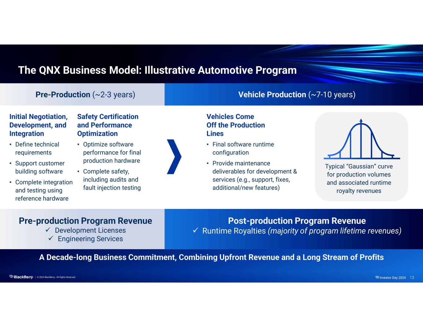 © 2024 BlackBerry. All Rights Reserved 12 QNX: Robust Financial Investment Case Established and Profitable Global Leader, Capturing Share in a Growing Market Large, Growing Market Opportunities with Attractive Economics Commercial and Technical Trends Pushing the Industry in Our Direction Clear Segment Leader with Unique Capabilities, IP, and Track Record Deep, Long-Standing Relationships with Leading Customers and Partners