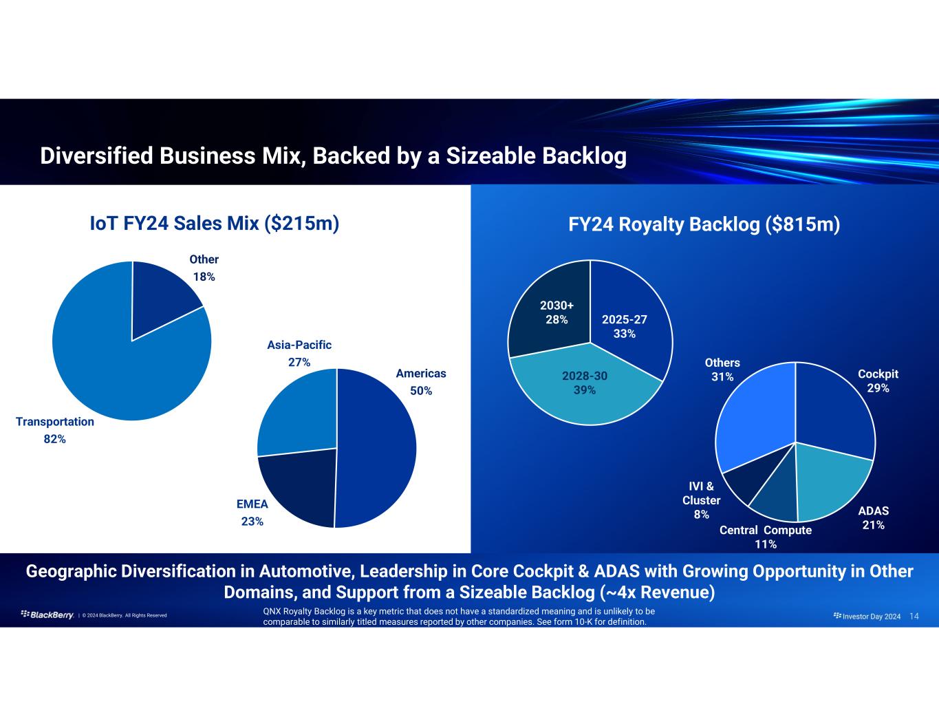 © 2024 BlackBerry. All Rights Reserved 13 The QNX Business Model: Illustrative Automotive Program Initial Negotiation, Development, and Integration • Define technical requirements • Support customer building software • Complete integration and testing using reference hardware Pre-production Program Revenue  Development Licenses  Engineering Services A Decade-long Business Commitment, Combining Upfront Revenue and a Long Stream of Profits Pre-Production (~2-3 years) Vehicles Come Off the Production Lines • Final software runtime configuration • Provide maintenance deliverables for development & services (e.g., support, fixes, additional/new features) Vehicle Production (~ 7-10 years) Vehicle Production (~7-10 years) Typical “Gaussian” curve for production volumes and associated runtime royalty revenues Post-production Program Revenue  Runtime Royalties (majority of program lifetime revenues) Safety Certification and Performance Optimization • Optimize software performance for final production hardware • Complete safety, including audits and fault injection testing
