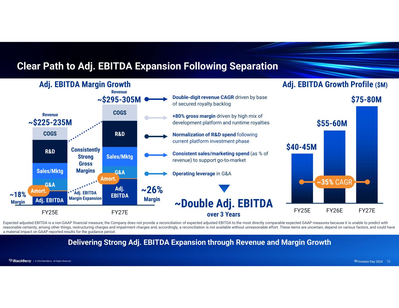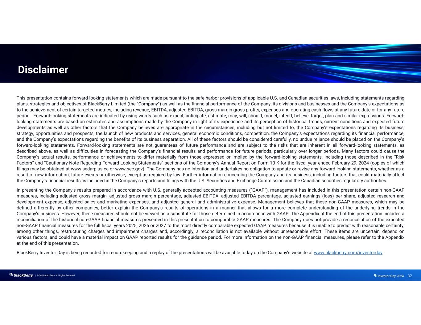 © 2024 BlackBerry. All Rights Reserved 32 Disclaimer This presentation contains forward-looking statements which are made pursuant to the safe harbor provisions of applicable U.S. and Canadian securities laws, including statements regarding plans, strategies and objectives of BlackBerry Limited (the “Company”) as well as the financial performance of the Company, its divisions and businesses and the Company’s expectations as to the achievement of certain targeted metrics, including revenue, EBITDA, adjusted EBITDA, gross margin gross profits, expenses and operating cash flows at any future date or for any future period. Forward-looking statements are indicated by using words such as expect, anticipate, estimate, may, will, should, model, intend, believe, target, plan and similar expressions. Forward- looking statements are based on estimates and assumptions made by the Company in light of its experience and its perception of historical trends, current conditions and expected future developments as well as other factors that the Company believes are appropriate in the circumstances, including but not limited to, the Company’s expectations regarding its business, strategy, opportunities and prospects, the launch of new products and services, general economic conditions, competition, the Company’s expectations regarding its financial performance, and the Company’s expectations regarding the benefits of its business separation. All of these factors should be considered carefully, no undue reliance should be placed on the Company’s forward-looking statements. Forward-looking statements are not guarantees of future performance and are subject to the risks that are inherent in all forward-looking statements, as described above, as well as difficulties in forecasting the Company’s financial results and performance for future periods, particularly over longer periods. Many factors could cause the Company’s actual results, performance or achievements to differ materially from those expressed or implied by the forward-looking statements, including those described in the “Risk Factors” and “Cautionary Note Regarding Forward-Looking Statements” sections of the Company’s Annual Report on Form 10-K for the fiscal year ended February 29, 2024 (copies of which filings may be obtained at www.sedarplus.ca or www.sec.gov). The Company has no intention and undertakes no obligation to update or revise any forward-looking statements, whether as a result of new information, future events or otherwise, except as required by law. Further information concerning the Company and its business, including factors that could materially affect the Company’s financial results, is included in the Company’s reports and filings with the U.S. Securities and Exchange Commission and the Canadian securities regulatory authorities. In presenting the Company's results prepared in accordance with U.S. generally accepted accounting measures (“GAAP”), management has included in this presentation certain non-GAAP measures, including adjusted gross margin, adjusted gross margin percentage, adjusted EBITDA, adjusted EBITDA percentage, adjusted earnings (loss) per share, adjusted research and development expense, adjusted sales and marketing expenses, and adjusted general and administrative expense. Management believes that these non-GAAP measures, which may be defined differently by other companies, better explain the Company's results of operations in a manner that allows for a more complete understanding of the underlying trends in the Company's business. However, these measures should not be viewed as a substitute for those determined in accordance with GAAP. The Appendix at the end of this presentation includes a reconciliation of the historical non-GAAP financial measures presented in this presentation to comparable GAAP measures. The Company does not provide a reconciliation of the expected non-GAAP financial measures for the full fiscal years 2025, 2026 or 2027 to the most directly comparable expected GAAP measures because it is unable to predict with reasonable certainty, among other things, restructuring charges and impairment charges and, accordingly, a reconciliation is not available without unreasonable effort. These items are uncertain, depend on various factors, and could have a material impact on GAAP reported results for the guidance period. For more information on the non-GAAP financial measures, please refer to the Appendix at the end of this presentation. BlackBerry Investor Day is being recorded for recordkeeping and a replay of the presentations will be available today on the Company’s website at www.blackberry.com/investorday.