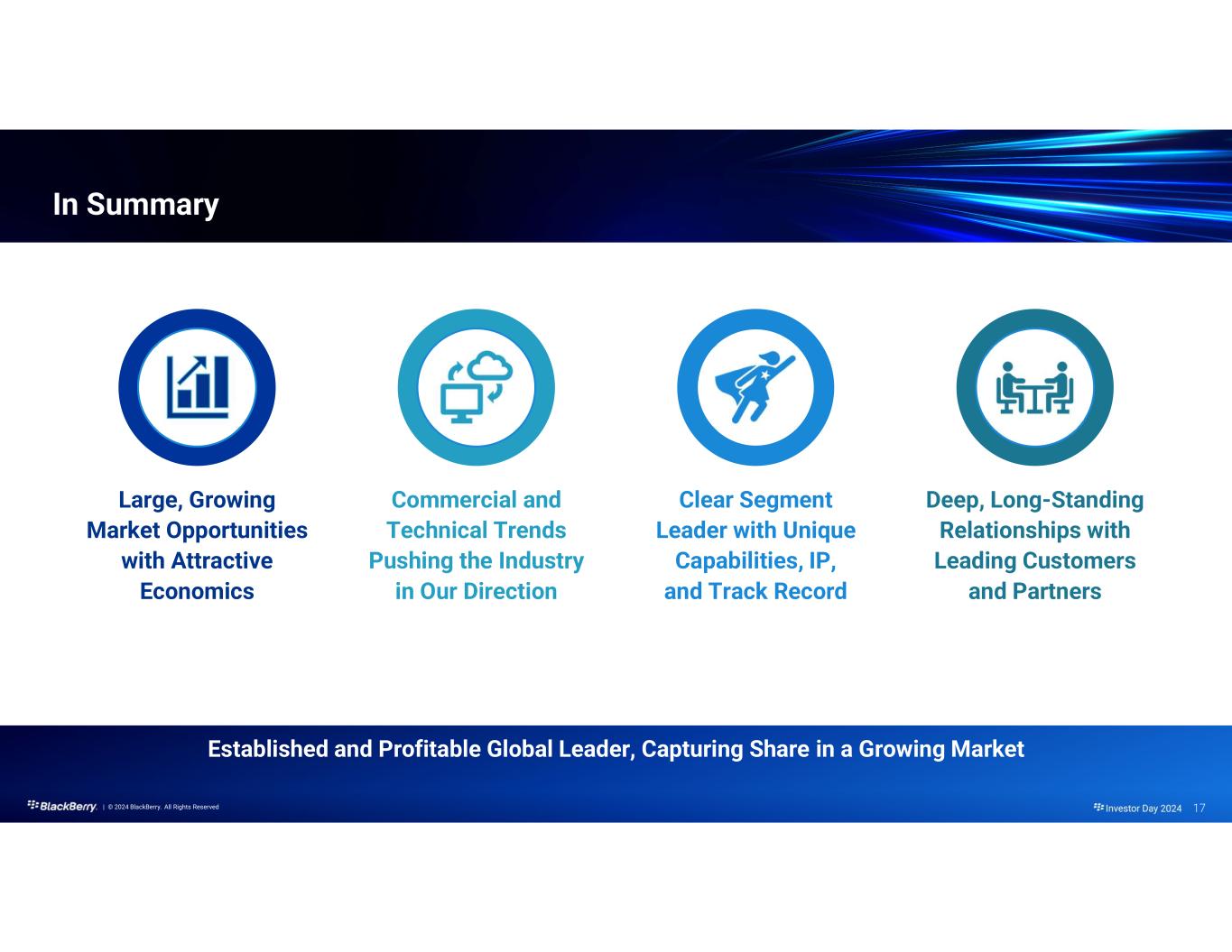 © 2024 BlackBerry. All Rights Reserved 16 Clear Path to Adj. EBITDA Expansion Following Separation Adj. EBITDA Margin Growth ~Double Adj. EBITDA over 3 Years Delivering Strong Adj. EBITDA Expansion through Revenue and Margin Growth Adj. EBITDA Adj. EBITDA Amort. Amort. G&A G&ASales/Mktg Sales/Mktg R&D R&DCOGS COGS FY25E FY27E Revenue ~$225-235M Revenue ~$295-305M Consistently Strong Gross Margins Adj. EBITDA Margin Expansion ~18% Margin ~26% Margin Double-digit revenue CAGR driven by base of secured royalty backlog +80% gross margin driven by high mix of development platform and runtime royalties Normalization of R&D spend following current platform investment phase Operating leverage in G&A Consistent sales/marketing spend (as % of revenue) to support go-to-market FY25E FY26E FY27E Adj. EBITDA Growth Profile ($M) ~35% CAGR $40-45M $75-80M $55-60M Expected adjusted EBITDA is a non-GAAP financial measure; the Company does not provide a reconciliation of expected adjusted EBITDA to the most directly comparable expected GAAP measures because it is unable to predict with reasonable certainty, among other things, restructuring charges and impairment charges and, accordingly, a reconciliation is not available without unreasonable effort. These items are uncertain, depend on various factors, and could have a material impact on GAAP reported results for the guidance period.