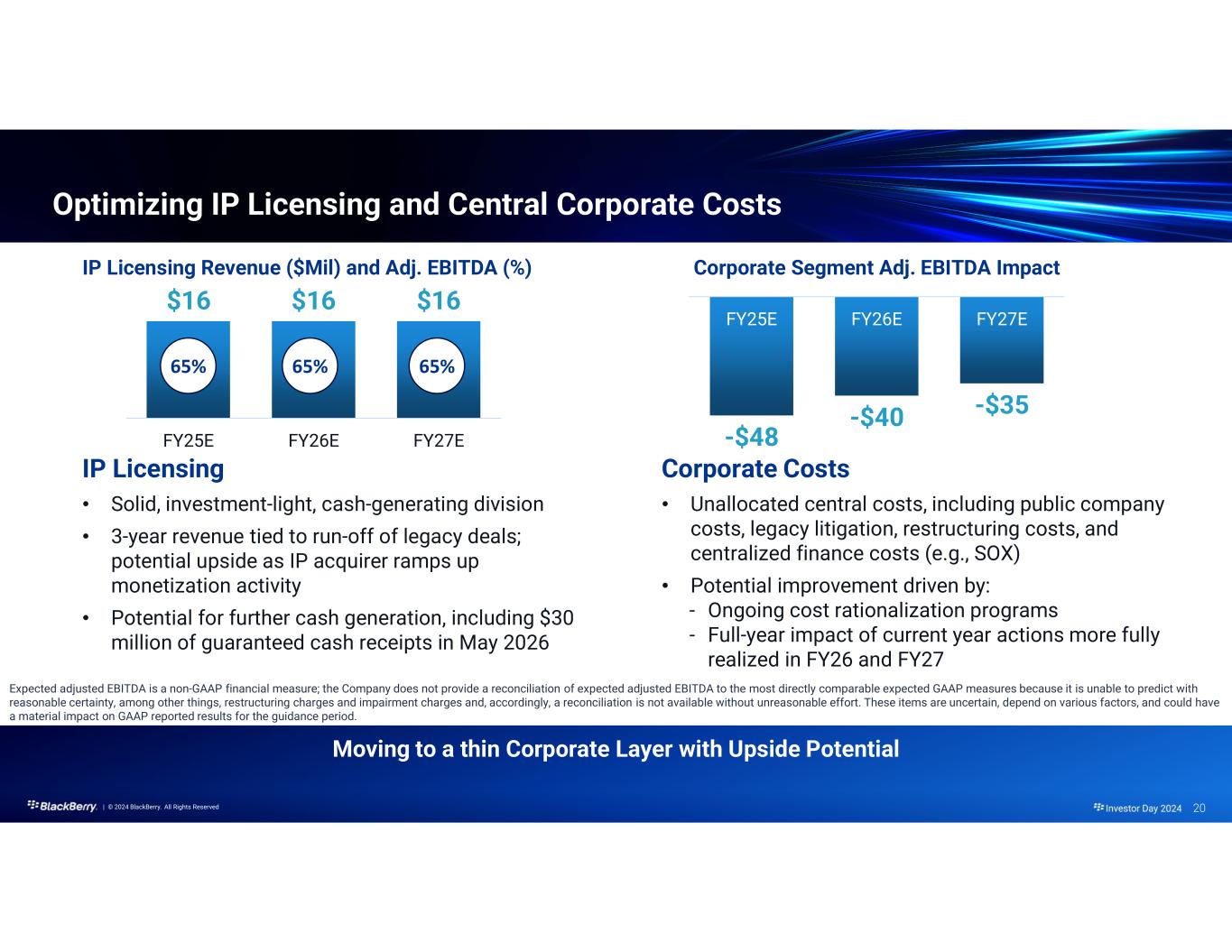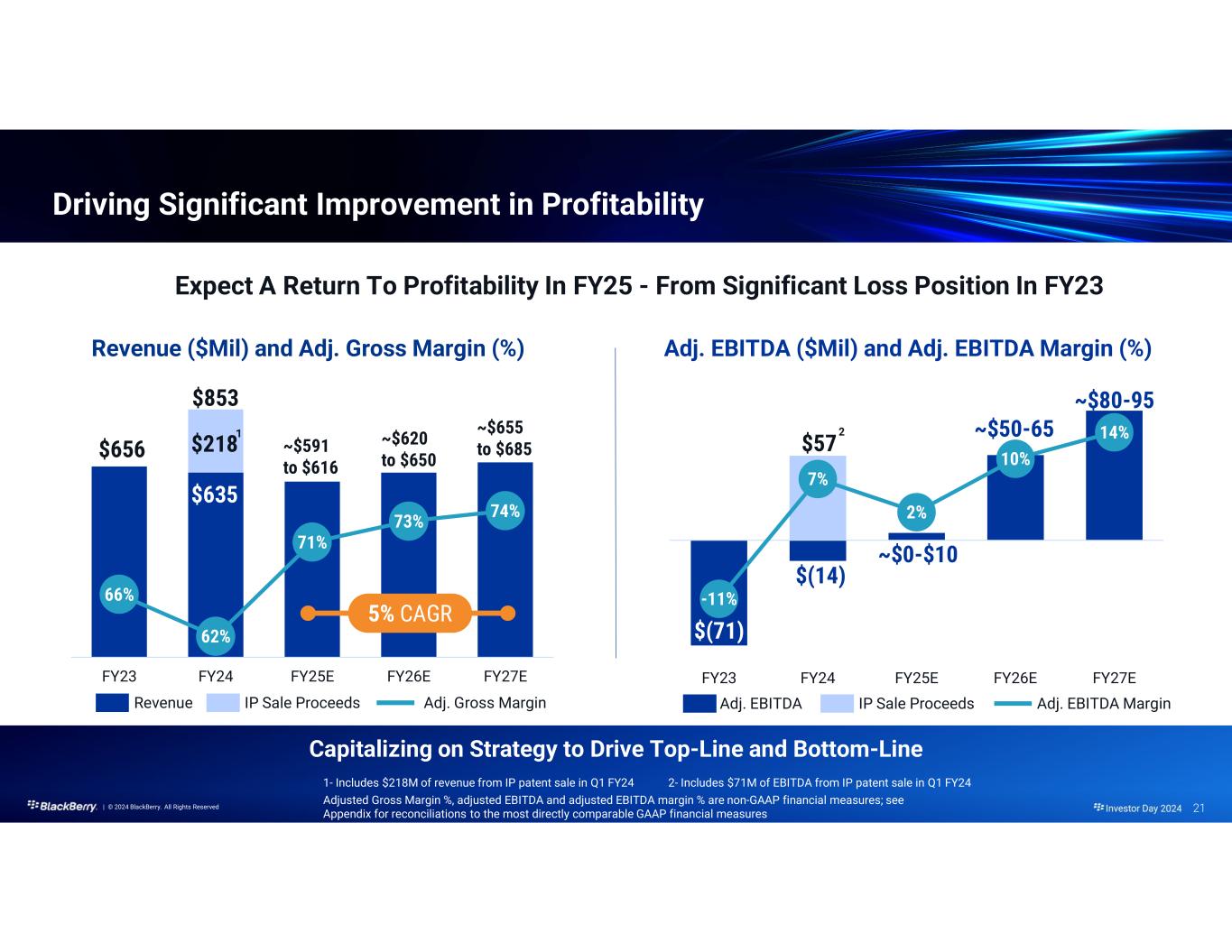 © 2024 BlackBerry. All Rights Reserved 20 IP Licensing • Solid, investment-light, cash-generating division • 3-year revenue tied to run-off of legacy deals; potential upside as IP acquirer ramps up monetization activity • Potential for further cash generation, including $30 million of guaranteed cash receipts in May 2026 Optimizing IP Licensing and Central Corporate Costs Corporate Costs • Unallocated central costs, including public company costs, legacy litigation, restructuring costs, and centralized finance costs (e.g., SOX) • Potential improvement driven by: - Ongoing cost rationalization programs - Full-year impact of current year actions more fully realized in FY26 and FY27 Moving to a thin Corporate Layer with Upside Potential $16 $16 $16 FY25E FY26E FY27E 65% IP Licensing Revenue ($Mil) and Adj. EBITDA (%) 65% 65% -$48 -$40 -$35 FY25E FY26E FY27E Corporate Segment Adj. EBITDA Impact Expected adjusted EBITDA is a non-GAAP financial measure; the Company does not provide a reconciliation of expected adjusted EBITDA to the most directly comparable expected GAAP measures because it is unable to predict with reasonable certainty, among other things, restructuring charges and impairment charges and, accordingly, a reconciliation is not available without unreasonable effort. These items are uncertain, depend on various factors, and could have a material impact on GAAP reported results for the guidance period.