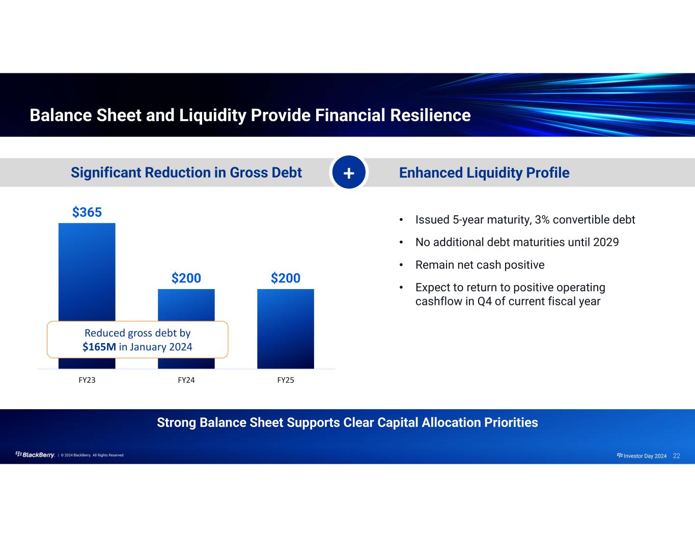 © 2024 BlackBerry. All Rights Reserved 21 $656 $635 $218 66% 62% 71% 73% 74% 60% 65% 70% 75% 80% 85% $- $100 $200 $300 $400 $500 $600 $700 $800 $900 FY23 FY24 FY25E FY26E FY27E Revenue ($Mil) and Adj. Gross Margin (%) Expect A Return To Profitability In FY25 - From Significant Loss Position In FY23 Driving Significant Improvement in Profitability $(71) $(14) ~$0-$10 ~$50-65 ~$80-95 $57 -11% 7% 2% 10% 14% -20% -15% -10% -5% 0% 5% 10% 15% 20% $(80) $(60) $(40) $(20) $- $20 $40 $60 $80 $100 FY23 FY24 FY25E FY26E FY27E Adj. EBITDA ($Mil) and Adj. EBITDA Margin (%) ² Capitalizing on Strategy to Drive Top-Line and Bottom-Line 1- Includes $218M of revenue from IP patent sale in Q1 FY24 2- Includes $71M of EBITDA from IP patent sale in Q1 FY24 5% CAGR ¹ Revenue Adj. Gross Margin Adj. EBITDA Adj. EBITDA Margin ~$591 to $616 ~$620 to $650 ~$655 to $685 $853 Adjusted Gross Margin %, adjusted EBITDA and adjusted EBITDA margin % are non-GAAP financial measures; see Appendix for reconciliations to the most directly comparable GAAP financial measures IP Sale Proceeds IP Sale Proceeds