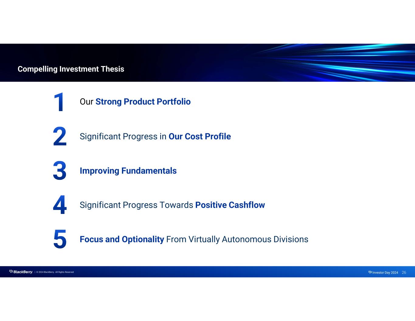 © 2024 BlackBerry. All Rights Reserved 26 Our Strong Product Portfolio Significant Progress in Our Cost Profile Improving Fundamentals Significant Progress Towards Positive Cashflow Focus and Optionality From Virtually Autonomous Divisions Compelling Investment Thesis