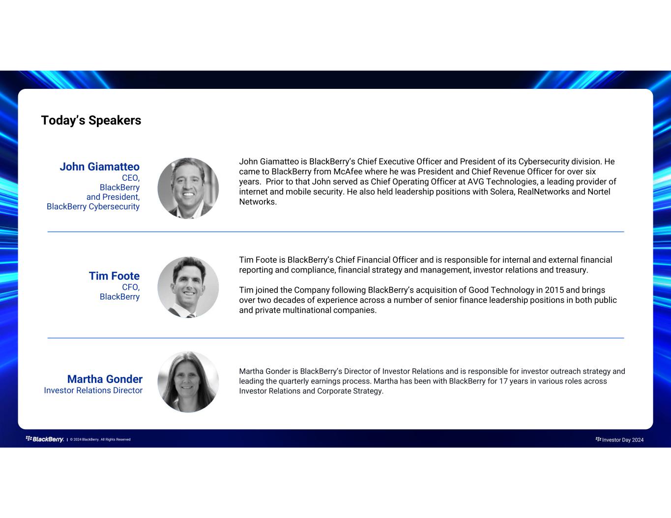 © 2024 BlackBerry. All Rights Reserved© 2024 BlackBerry. All ights Reserved John Giamatteo is BlackBerry’s Chief Executive Officer and President of its Cybersecurity division. He came to BlackBerry from McAfee where he was President and Chief Revenue Officer for over six years. Prior to that John served as Chief Operating Officer at AVG Technologies, a leading provider of internet and mobile security. He also held leadership positions with Solera, RealNetworks and Nortel Networks. Martha Gonder is BlackBerry’s Director of Investor Relations and is responsible for investor outreach strategy and leading the quarterly earnings process. Martha has been with BlackBerry for 17 years in various roles across Investor Relations and Corporate Strategy. Today’s Speakers Tim Foote is BlackBerry’s Chief Financial Officer and is responsible for internal and external financial reporting and compliance, financial strategy and management, investor relations and treasury. Tim joined the Company following BlackBerry’s acquisition of Good Technology in 2015 and brings over two decades of experience across a number of senior finance leadership positions in both public and private multinational companies. John Giamatteo CEO, BlackBerry and President, BlackBerry Cybersecurity Tim Foote CFO, BlackBerry Martha Gonder Investor Relations Director