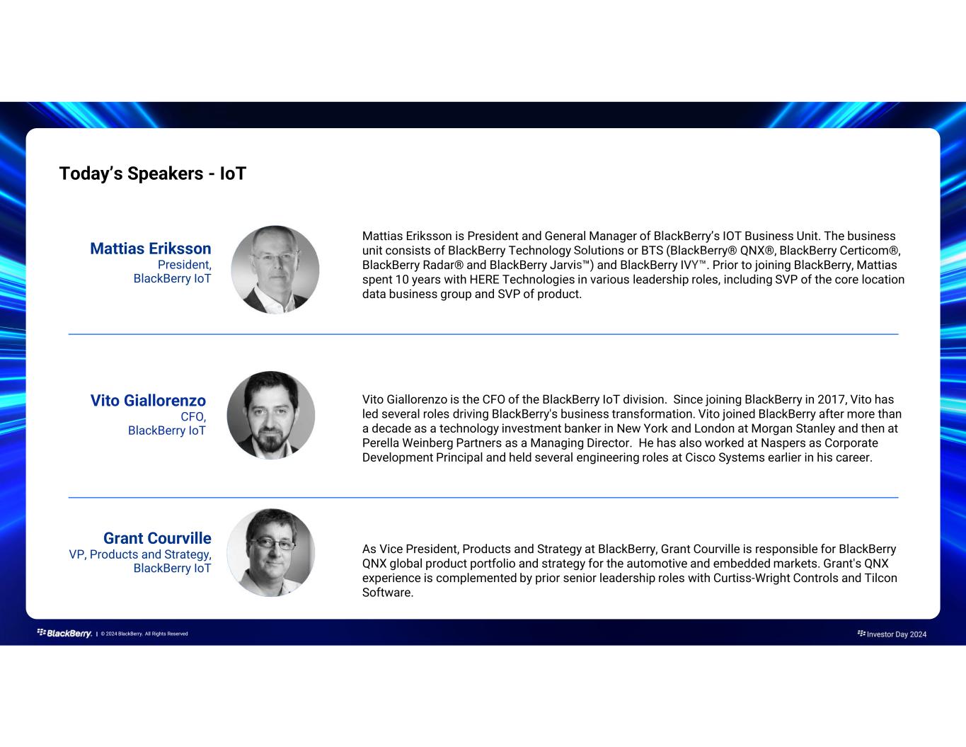 © 2024 BlackBerry. All Rights Reserved© 2024 BlackBerry. All ights Reserved Mattias Eriksson President, BlackBerry IoT Mattias Eriksson is President and General Manager of BlackBerry’s IOT Business Unit. The business unit consists of BlackBerry Technology Solutions or BTS (BlackBerry® QNX®, BlackBerry Certicom®, BlackBerry Radar® and BlackBerry Jarvis ) and BlackBerry IVY . Prior to joining BlackBerry, Mattias spent 10 years with HERE Technologies in various leadership roles, including SVP of the core location data business group and SVP of product. Grant Courville VP, Products and Strategy, BlackBerry IoT Today’s Speakers - IoT Vito Giallorenzo CFO, BlackBerry IoT Vito Giallorenzo is the CFO of the BlackBerry IoT division. Since joining BlackBerry in 2017, Vito has led several roles driving BlackBerry's business transformation. Vito joined BlackBerry after more than a decade as a technology investment banker in New York and London at Morgan Stanley and then at Perella Weinberg Partners as a Managing Director. He has also worked at Naspers as Corporate Development Principal and held several engineering roles at Cisco Systems earlier in his career. As Vice President, Products and Strategy at BlackBerry, Grant Courville is responsible for BlackBerry QNX global product portfolio and strategy for the automotive and embedded markets. Grant's QNX experience is complemented by prior senior leadership roles with Curtiss-Wright Controls and Tilcon Software.