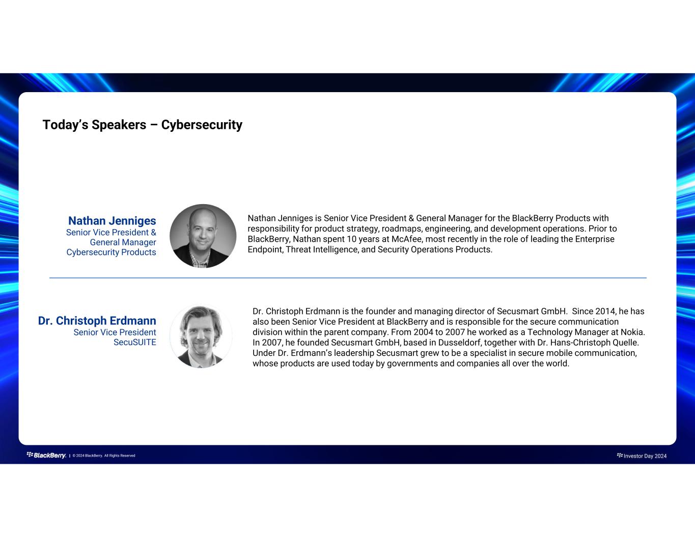 © 2024 BlackBerry. All Rights Reserved© 2024 BlackBerry. All ights Reserved Today’s Speakers – Cybersecurity Nathan Jenniges Senior Vice President & General Manager Cybersecurity Products Nathan Jenniges is Senior Vice President & General Manager for the BlackBerry Products with responsibility for product strategy, roadmaps, engineering, and development operations. Prior to BlackBerry, Nathan spent 10 years at McAfee, most recently in the role of leading the Enterprise Endpoint, Threat Intelligence, and Security Operations Products. Dr. Christoph Erdmann Senior Vice President SecuSUITE Dr. Christoph Erdmann is the founder and managing director of Secusmart GmbH. Since 2014, he has also been Senior Vice President at BlackBerry and is responsible for the secure communication division within the parent company. From 2004 to 2007 he worked as a Technology Manager at Nokia. In 2007, he founded Secusmart GmbH, based in Dusseldorf, together with Dr. Hans-Christoph Quelle. Under Dr. Erdmann’s leadership Secusmart grew to be a specialist in secure mobile communication, whose products are used today by governments and companies all over the world.