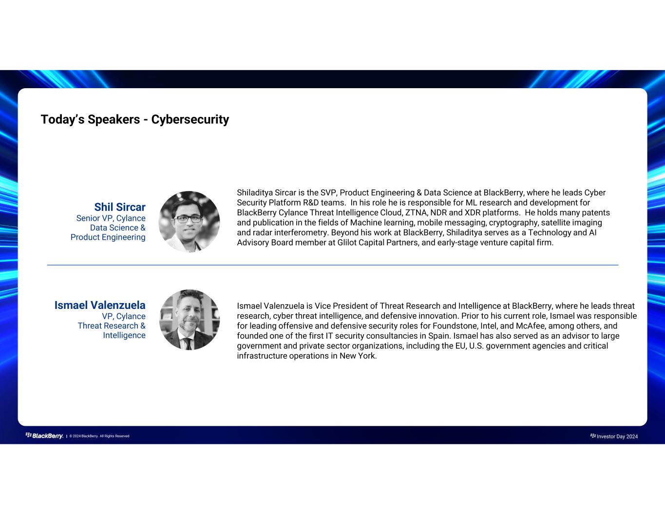 © 2024 BlackBerry. All Rights Reserved© 2024 BlackBerry. All ights Reserved Shil Sircar Senior VP, Cylance Data Science & Product Engineering Ismael Valenzuela VP, Cylance Threat Research & Intelligence Today’s Speakers - Cybersecurity Shiladitya Sircar is the SVP, Product Engineering & Data Science at BlackBerry, where he leads Cyber Security Platform R&D teams. In his role he is responsible for ML research and development for BlackBerry Cylance Threat Intelligence Cloud, ZTNA, NDR and XDR platforms. He holds many patents and publication in the fields of Machine learning, mobile messaging, cryptography, satellite imaging and radar interferometry. Beyond his work at BlackBerry, Shiladitya serves as a Technology and AI Advisory Board member at Glilot Capital Partners, and early-stage venture capital firm. Ismael Valenzuela is Vice President of Threat Research and Intelligence at BlackBerry, where he leads threat research, cyber threat intelligence, and defensive innovation. Prior to his current role, Ismael was responsible for leading offensive and defensive security roles for Foundstone, Intel, and McAfee, among others, and founded one of the first IT security consultancies in Spain. Ismael has also served as an advisor to large government and private sector organizations, including the EU, U.S. government agencies and critical infrastructure operations in New York.