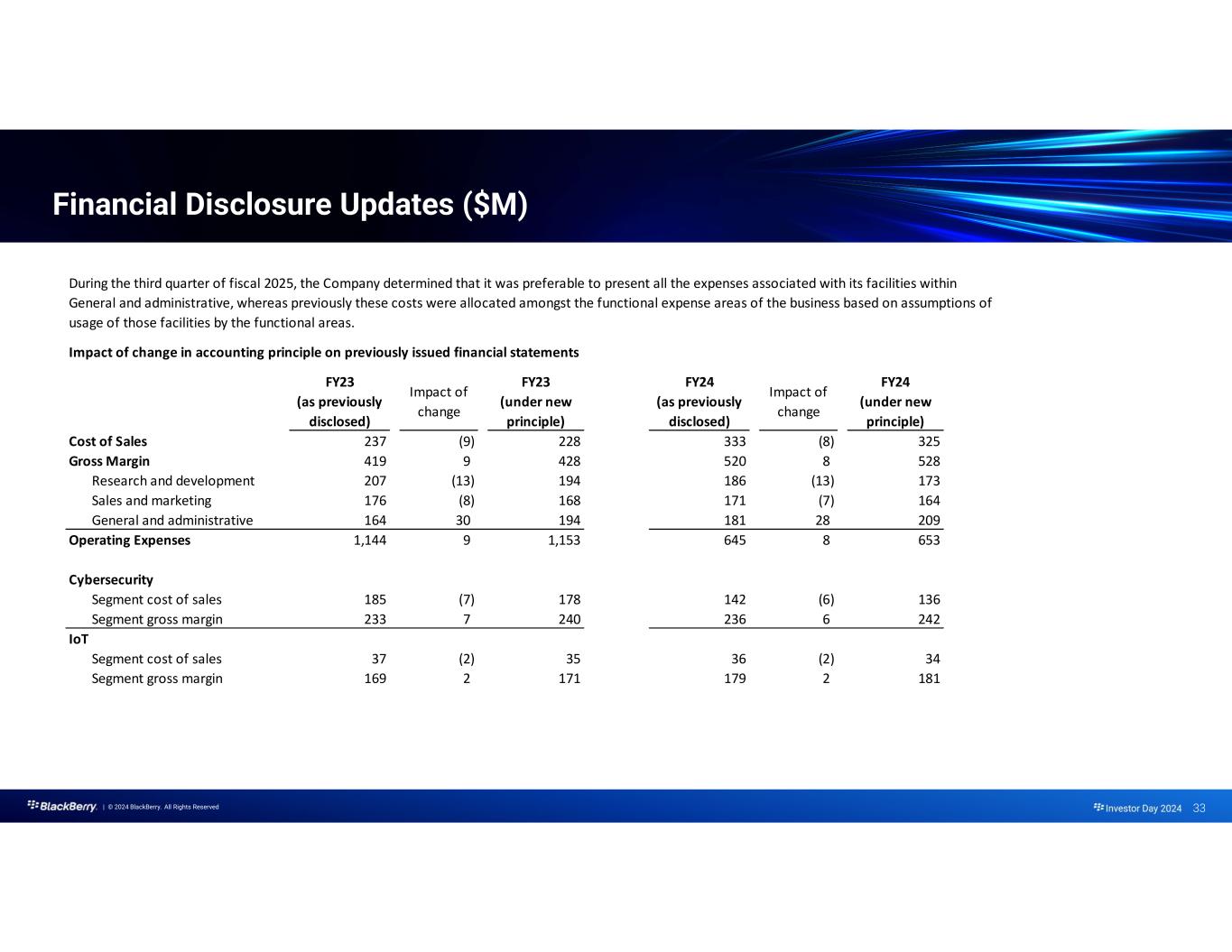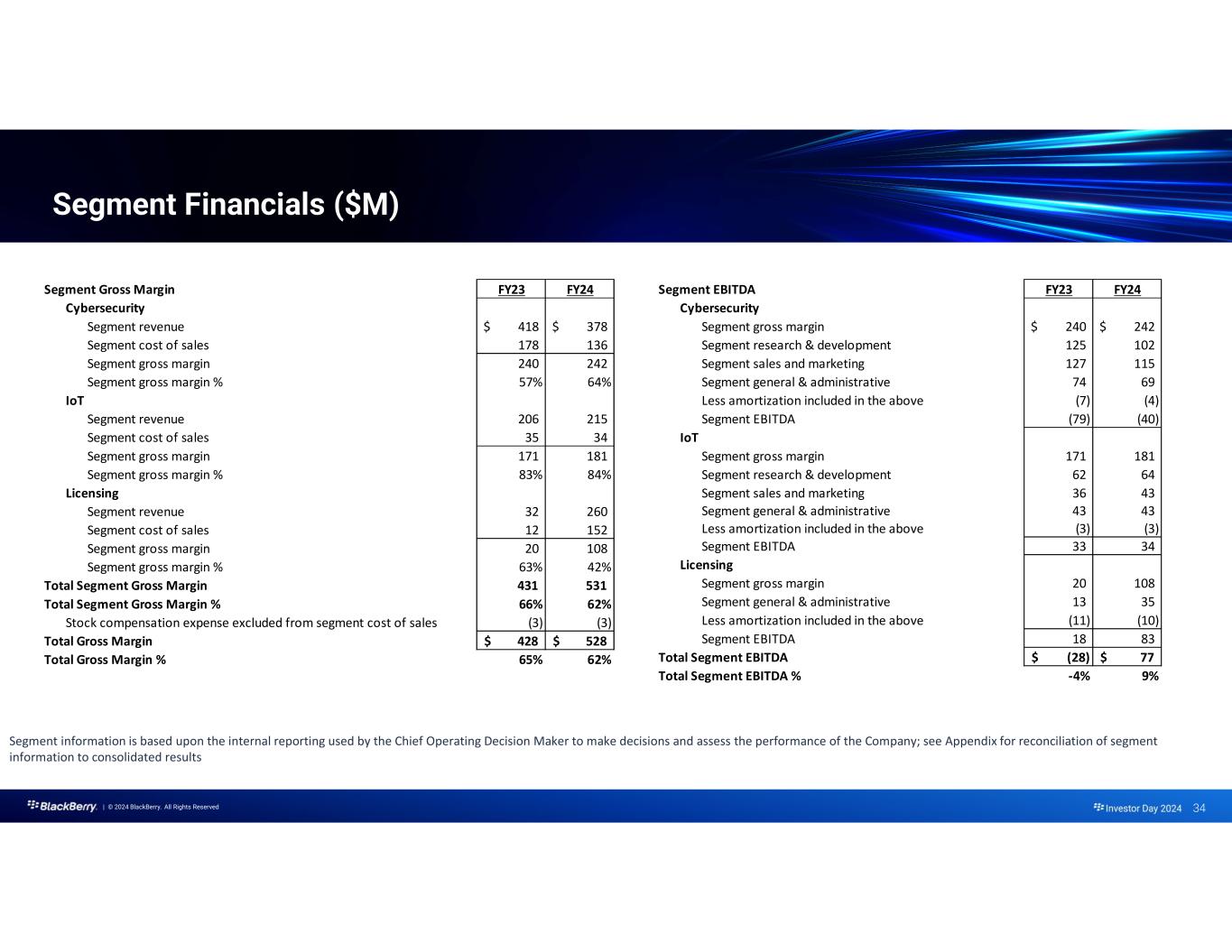 © 2024 BlackBerry. All Rights Reserved 33 Financial Disclosure Updates ($M) Impact of change in accounting principle on previously issued financial statements FY23 (as previously disclosed) Impact of change FY23 (under new principle) FY24 (as previously disclosed) Impact of change FY24 (under new principle) Cost of Sales 237 (9) 228 333 (8) 325 Gross Margin 419 9 428 520 8 528 Research and development 207 (13) 194 186 (13) 173 Sales and marketing 176 (8) 168 171 (7) 164 General and administrative 164 30 194 181 28 209 Operating Expenses 1,144 9 1,153 645 8 653 Cybersecurity Segment cost of sales 185 (7) 178 142 (6) 136 Segment gross margin 233 7 240 236 6 242 IoT Segment cost of sales 37 (2) 35 36 (2) 34 Segment gross margin 169 2 171 179 2 181 During the third quarter of fiscal 2025, the Company determined that it was preferable to present all the expenses associated with its facilities within General and administrative, whereas previously these costs were allocated amongst the functional expense areas of the business based on assumptions of usage of those facilities by the functional areas.