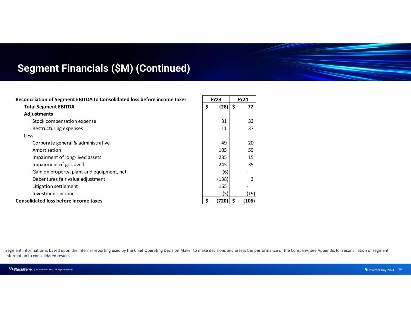 © 2024 BlackBerry. All Rights Reserved 35 Segment Financials ($M) (Continued) Segment information is based upon the internal reporting used by the Chief Operating Decision Maker to make decisions and assess the performance of the Company; see Appendix for reconciliation of segment information to consolidated results FY23 FY24 Total Segment EBITDA (28)$ 77$ Adjustments Stock compensation expense 31 33 Restructuring expenses 11 37 Less Corporate general & administrative 49 20 Amortization 105 59 Impairment of long-lived assets 235 15 Impairment of goodwill 245 35 Gain on property, plant and equipment, net (6) - Debentures fair value adjustment (138) 3 Litigation settlement 165 - Investment income (5) (19) Consolidated loss before income taxes (720)$ (106)$ Reconciliation of Segment EBITDA to Consolidated loss before income taxes