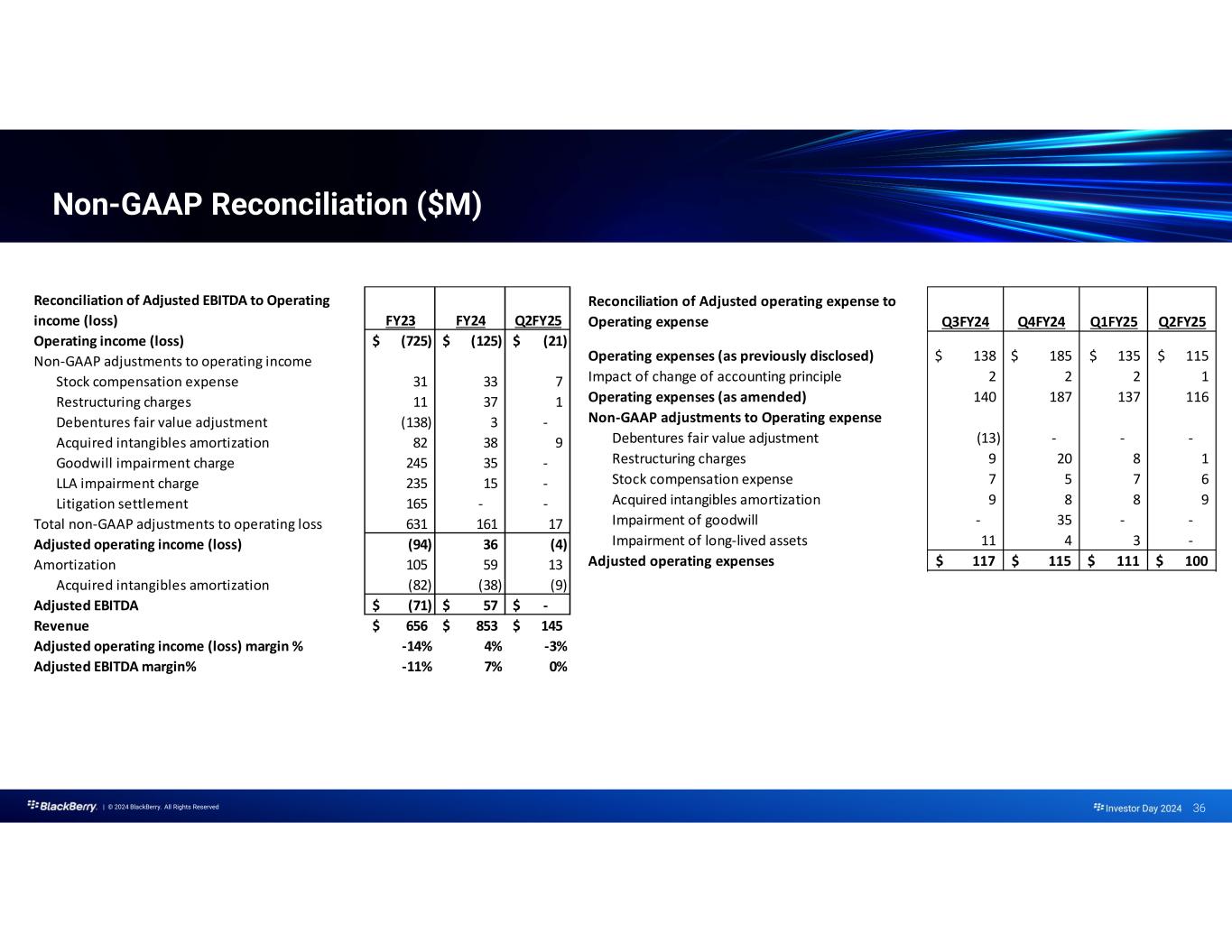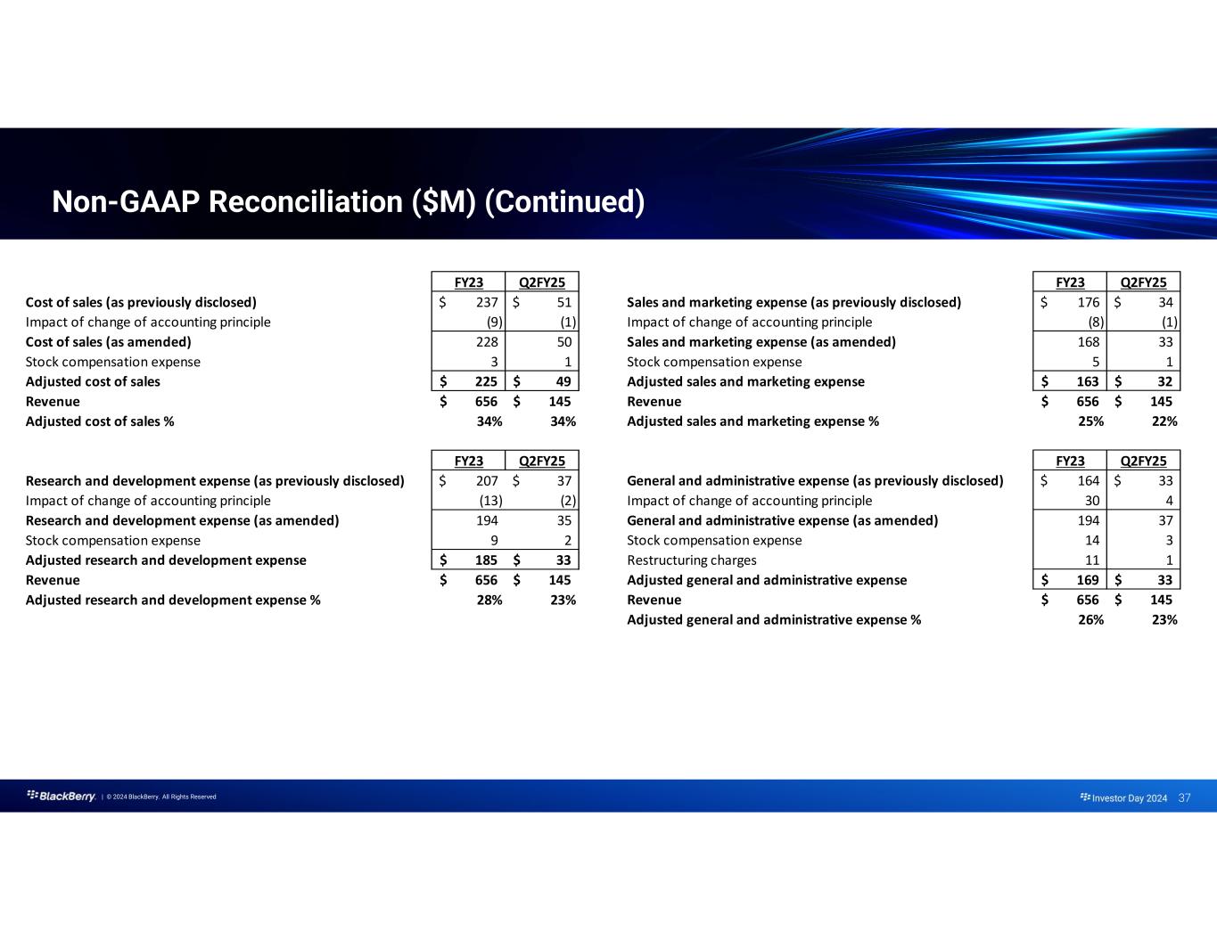 © 2024 BlackBerry. All Rights Reserved 36 Non-GAAP Reconciliation ($M) FY23 FY24 Q2FY25 Operating income (loss) (725)$ (125)$ (21)$ Non-GAAP adjustments to operating income Stock compensation expense 31 33 7 Restructuring charges 11 37 1 Debentures fair value adjustment (138) 3 - Acquired intangibles amortization 82 38 9 Goodwill impairment charge 245 35 - LLA impairment charge 235 15 - Litigation settlement 165 - - Total non-GAAP adjustments to operating loss 631 161 17 Adjusted operating income (loss) (94) 36 (4) Amortization 105 59 13 Acquired intangibles amortization (82) (38) (9) Adjusted EBITDA (71)$ 57$ -$ Revenue 656$ 853$ 145$ Adjusted operating income (loss) margin % -14% 4% -3% Adjusted EBITDA margin% -11% 7% 0% Reconciliation of Adjusted EBITDA to Operating income (loss) Q3FY24 Q4FY24 Q1FY25 Q2FY25 Operating expenses (as previously disclosed) 138$ 185$ 135$ 115$ Impact of change of accounting principle 2 2 2 1 Operating expenses (as amended) 140 187 137 116 Non-GAAP adjustments to Operating expense Debentures fair value adjustment (13) - - - Restructuring charges 9 20 8 1 Stock compensation expense 7 5 7 6 Acquired intangibles amortization 9 8 8 9 Impairment of goodwill - 35 - - Impairment of long-lived assets 11 4 3 - Adjusted operating expenses 117$ 115$ 111$ 100$ Reconciliation of Adjusted operating expense to Operating expense