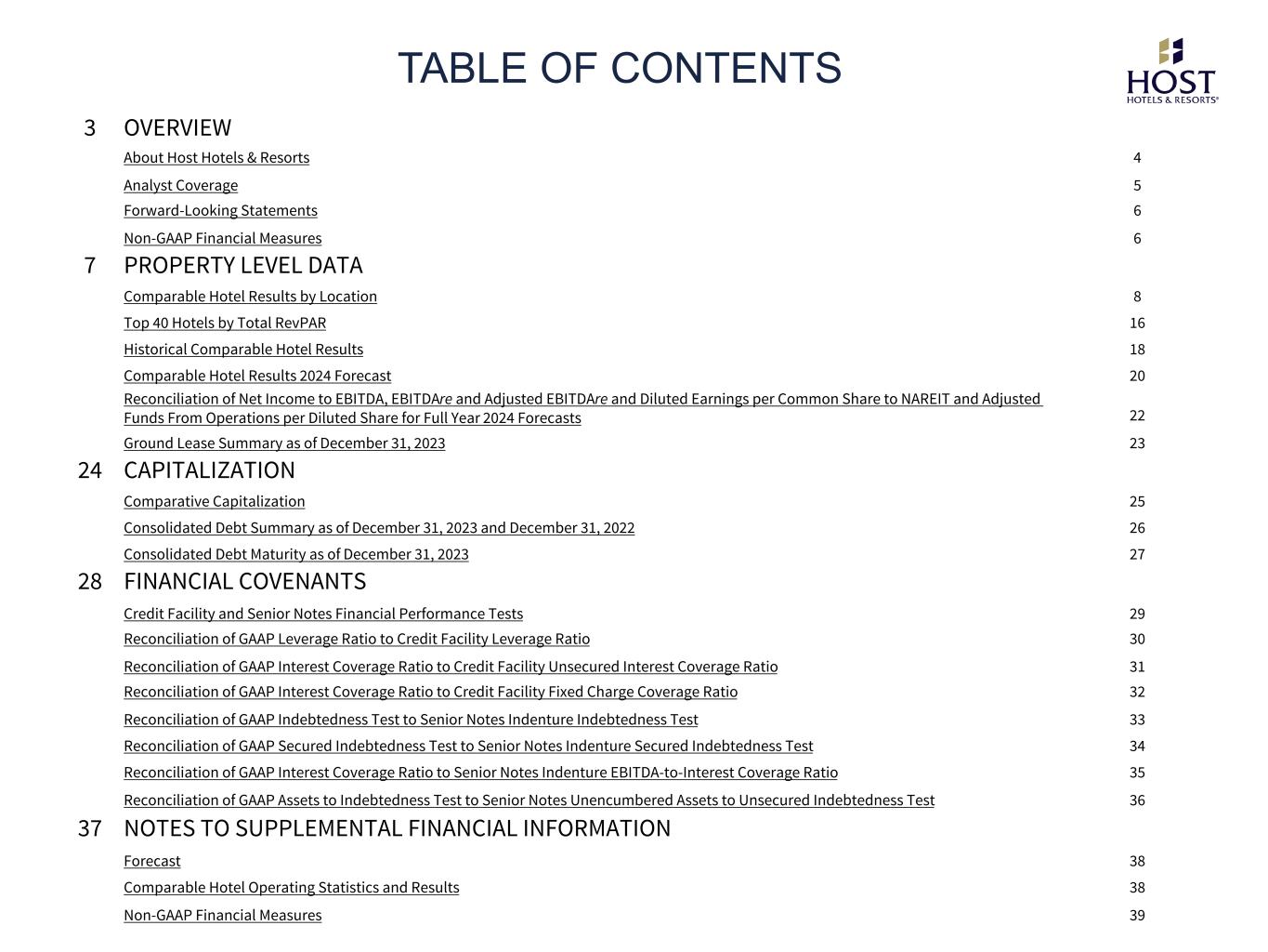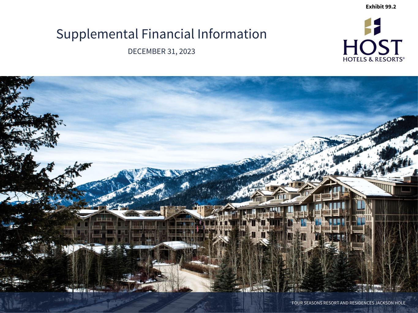 TABLE OF CONTENTS The Phoenician, a luxury collection resort PROPERTY LEVEL DATA CAPITALIZATION FINANCIAL COVENANTS NOTES TO SUPPLEMENTAL INFORMATION 3 OVERVIEW About Host Hotels & Resorts 4 Analyst Coverage 5 Forward-Looking Statements 6 Non-GAAP Financial Measures 6 7 PROPERTY LEVEL DATA Comparable Hotel Results by Location 8 Top 40 Hotels by Total RevPAR 16 Historical Comparable Hotel Results 18 Comparable Hotel Results 2024 Forecast 20 Reconciliation of Net Income to EBITDA, EBITDAre and Adjusted EBITDAre and Diluted Earnings per Common Share to NAREIT and Adjusted Funds From Operations per Diluted Share for Full Year 2024 Forecasts 22 Ground Lease Summary as of December 31, 2023 23 24 CAPITALIZATION Comparative Capitalization 25 Consolidated Debt Summary as of December 31, 2023 and December 31, 2022 26 Consolidated Debt Maturity as of December 31, 2023 27 28 FINANCIAL COVENANTS Credit Facility and Senior Notes Financial Performance Tests 29 Reconciliation of GAAP Leverage Ratio to Credit Facility Leverage Ratio 30 Reconciliation of GAAP Interest Coverage Ratio to Credit Facility Unsecured Interest Coverage Ratio 31 Reconciliation of GAAP Interest Coverage Ratio to Credit Facility Fixed Charge Coverage Ratio 32 Reconciliation of GAAP Indebtedness Test to Senior Notes Indenture Indebtedness Test 33 Reconciliation of GAAP Secured Indebtedness Test to Senior Notes Indenture Secured Indebtedness Test 34 Reconciliation of GAAP Interest Coverage Ratio to Senior Notes Indenture EBITDA-to-Interest Coverage Ratio 35 Reconciliation of GAAP Assets to Indebtedness Test to Senior Notes Unencumbered Assets to Unsecured Indebtedness Test 36 37 NOTES TO SUPPLEMENTAL FINANCIAL INFORMATION Forecast 38 Comparable Hotel Operating Statistics and Results 38 Non-GAAP Financial Measures 39