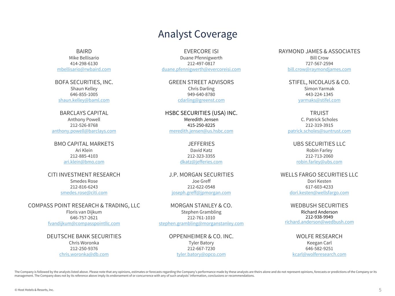 5© Host Hotels & Resorts, Inc. BAIRD Mike Bellisario 414-298-6130 mbellisario@rwbaird.com EVERCORE ISI Duane Pfennigwerth 212-497-0817 duane.pfennigwerth@evercoreisi.com RAYMOND JAMES & ASSOCIATES Bill Crow 727-567-2594 bill.crow@raymondjames.com BOFA SECURITIES, INC. Shaun Kelley 646-855-1005 shaun.kelley@baml.com GREEN STREET ADVISORS Chris Darling 949-640-8780 cdarling@greenst.com STIFEL, NICOLAUS & CO. Simon Yarmak 443-224-1345 yarmaks@stifel.com BARCLAYS CAPITAL Anthony Powell 212-526-8768 anthony.powell@barclays.com HSBC SECURITIES (USA) INC. Meredith Jensen 415-250-8225 meredith.jensen@us.hsbc.com TRUIST C. Patrick Scholes 212-319-3915 patrick.scholes@suntrust.com BMO CAPITAL MARKETS Ari Klein 212-885-4103 ari.klein@bmo.com JEFFERIES David Katz 212-323-3355 dkatz@jefferies.com UBS SECURITIES LLC Robin Farley 212-713-2060 robin.farley@ubs.com CITI INVESTMENT RESEARCH Smedes Rose 212-816-6243 smedes.rose@citi.com J.P. MORGAN SECURITIES Joe Greff 212-622-0548 joseph.greff@jpmorgan.com WELLS FARGO SECURITIES LLC Dori Kesten 617-603-4233 dori.kesten@wellsfargo.com COMPASS POINT RESEARCH & TRADING, LLC Floris van Dijkum 646-757-2621 fvandijkum@compasspointllc.com MORGAN STANLEY & CO. Stephen Grambling 212-761-1010 stephen.grambling@morganstanley.com WEDBUSH SECURITIES Richard Anderson 212-938-9949 richard.anderson@wedbush.com DEUTSCHE BANK SECURITIES Chris Woronka 212-250-9376 chris.woronka@db.com OPPENHEIMER & CO. INC. Tyler Batory 212-667-7230 tyler.batory@opco.com WOLFE RESEARCH Keegan Carl 646-582-9251 kcarl@wolferesearch.com Analyst Coverage The Company is followed by the analysts listed above. Please note that any opinions, estimates or forecasts regarding the Company’s performance made by these analysts are theirs alone and do not represent opinions, forecasts or predictions of the Company or its management. The Company does not by its reference above imply its endorsement of or concurrence with any of such analysts’ information, conclusions or recommendations.