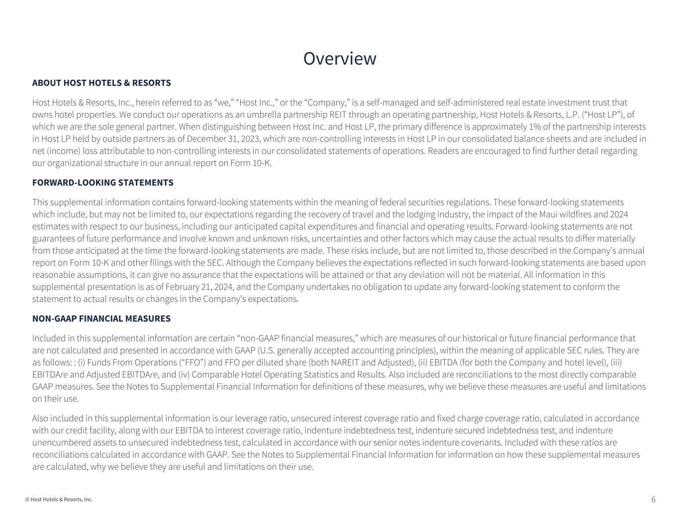 6© Host Hotels & Resorts, Inc. ABOUT HOST HOTELS & RESORTS Host Hotels & Resorts, Inc., herein referred to as “we,” “Host Inc.,” or the “Company,” is a self-managed and self-administered real estate investment trust that owns hotel properties. We conduct our operations as an umbrella partnership REIT through an operating partnership, Host Hotels & Resorts, L.P. (“Host LP”), of which we are the sole general partner. When distinguishing between Host Inc. and Host LP, the primary difference is approximately 1% of the partnership interests in Host LP held by outside partners as of December 31, 2023, which are non-controlling interests in Host LP in our consolidated balance sheets and are included in net (income) loss attributable to non-controlling interests in our consolidated statements of operations. Readers are encouraged to find further detail regarding our organizational structure in our annual report on Form 10-K. FORWARD-LOOKING STATEMENTS This supplemental information contains forward-looking statements within the meaning of federal securities regulations. These forward-looking statements which include, but may not be limited to, our expectations regarding the recovery of travel and the lodging industry, the impact of the Maui wildfires and 2024 estimates with respect to our business, including our anticipated capital expenditures and financial and operating results. Forward-looking statements are not guarantees of future performance and involve known and unknown risks, uncertainties and other factors which may cause the actual results to differ materially from those anticipated at the time the forward-looking statements are made. These risks include, but are not limited to, those described in the Company's annual report on Form 10-K and other filings with the SEC. Although the Company believes the expectations reflected in such forward-looking statements are based upon reasonable assumptions, it can give no assurance that the expectations will be attained or that any deviation will not be material. All information in this supplemental presentation is as of February 21, 2024, and the Company undertakes no obligation to update any forward-looking statement to conform the statement to actual results or changes in the Company’s expectations. NON-GAAP FINANCIAL MEASURES Included in this supplemental information are certain “non-GAAP financial measures,” which are measures of our historical or future financial performance that are not calculated and presented in accordance with GAAP (U.S. generally accepted accounting principles), within the meaning of applicable SEC rules. They are as follows: : (i) Funds From Operations (“FFO”) and FFO per diluted share (both NAREIT and Adjusted), (ii) EBITDA (for both the Company and hotel level), (iii) EBITDAre and Adjusted EBITDAre, and (iv) Comparable Hotel Operating Statistics and Results. Also included are reconciliations to the most directly comparable GAAP measures. See the Notes to Supplemental Financial Information for definitions of these measures, why we believe these measures are useful and limitations on their use. Also included in this supplemental information is our leverage ratio, unsecured interest coverage ratio and fixed charge coverage ratio, calculated in accordance with our credit facility, along with our EBITDA to interest coverage ratio, indenture indebtedness test, indenture secured indebtedness test, and indenture unencumbered assets to unsecured indebtedness test, calculated in accordance with our senior notes indenture covenants. Included with these ratios are reconciliations calculated in accordance with GAAP. See the Notes to Supplemental Financial Information for information on how these supplemental measures are calculated, why we believe they are useful and limitations on their use. Overview