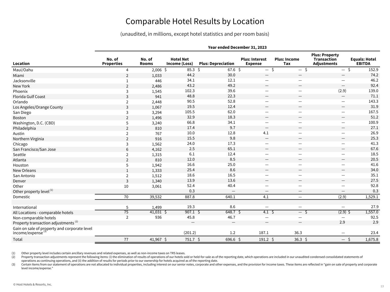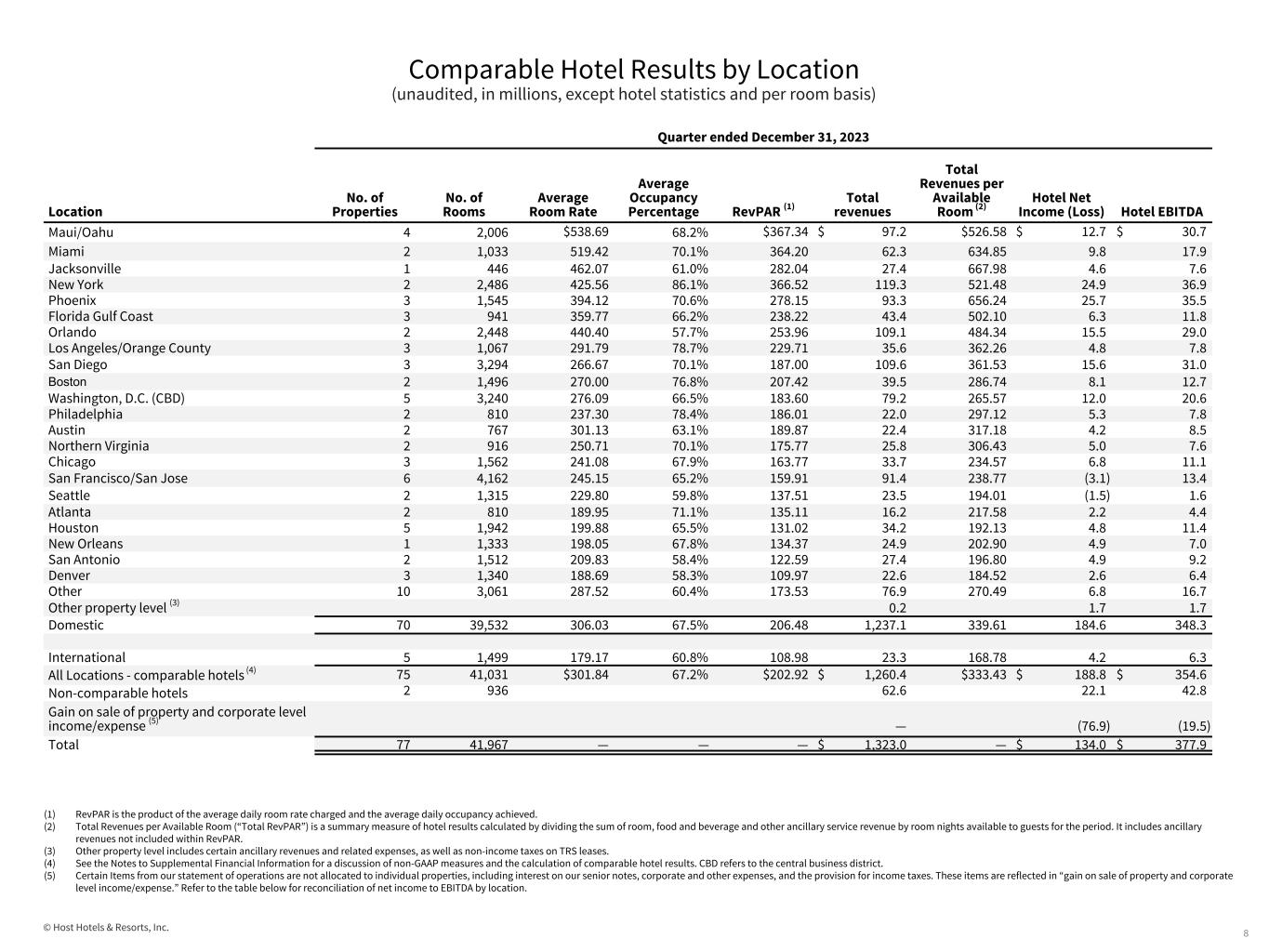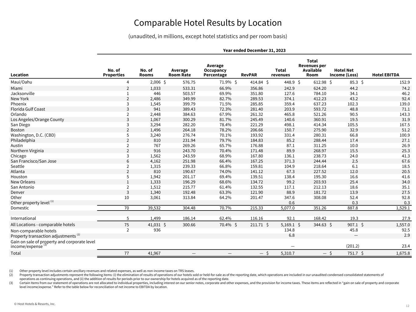 © Host Hotels & Resorts, Inc. Comparable Hotel Results by Location (unaudited, in millions, except hotel statistics and per room basis) 12 Year ended December 31, 2023 Location No. of Properties No. of Rooms Average Room Rate Average Occupancy Percentage RevPAR Total revenues Total Revenues per Available Room Hotel Net Income (Loss) Hotel EBITDA Maui/Oahu 4 2,006 $ 576.75 71.9% $ 414.84 $ 448.9 $ 612.98 $ 85.3 $ 152.9 Miami 2 1,033 533.31 66.9% 356.86 242.9 624.20 44.2 74.2 Jacksonville 1 446 503.57 69.9% 351.80 127.6 784.10 34.1 46.2 New York 2 2,486 349.99 82.7% 289.53 374.1 412.23 43.2 92.4 Phoenix 3 1,545 399.79 71.5% 285.85 359.4 637.23 102.3 139.0 Florida Gulf Coast 3 941 389.43 72.3% 281.40 203.9 593.72 48.8 71.1 Orlando 2 2,448 384.63 67.9% 261.32 465.8 521.26 90.5 143.3 Los Angeles/Orange County 3 1,067 300.29 81.7% 245.49 140.6 360.91 19.5 31.9 San Diego 3 3,294 282.20 78.4% 221.29 498.1 414.34 105.5 167.5 Boston 2 1,496 264.18 78.2% 206.66 150.7 275.90 32.9 51.2 Washington, D.C. (CBD) 5 3,240 276.74 70.1% 193.92 331.4 280.31 66.8 100.9 Philadelphia 2 810 231.94 79.7% 184.83 85.2 288.44 17.4 27.1 Austin 2 767 269.26 65.7% 176.88 87.1 311.25 10.0 26.9 Northern Virginia 2 916 243.70 70.4% 171.48 89.9 268.97 15.5 25.3 Chicago 3 1,562 243.59 68.9% 167.80 136.1 238.73 24.0 41.3 San Francisco/San Jose 6 4,162 251.98 66.4% 167.25 371.3 244.44 2.5 67.6 Seattle 2 1,315 239.33 66.8% 159.81 104.9 218.64 6.1 18.5 Atlanta 2 810 190.67 74.0% 141.12 67.3 227.52 12.0 20.5 Houston 5 1,942 201.17 69.4% 139.51 138.4 195.30 16.6 41.6 New Orleans 1 1,333 196.29 68.6% 134.72 99.2 203.93 25.4 34.0 San Antonio 2 1,512 215.77 61.4% 132.55 117.1 212.13 18.6 35.1 Denver 3 1,340 192.48 63.3% 121.90 88.9 181.72 13.9 27.5 Other 10 3,061 313.84 64.2% 201.47 347.6 308.08 52.4 92.8 Other property level (1) 0.6 0.3 0.3 Domestic 70 39,532 304.48 70.7% 215.33 5,077.0 351.26 887.8 1,529.1 International 5 1,499 186.14 62.4% 116.16 92.1 168.42 19.3 27.9 All Locations - comparable hotels 75 41,031 $ 300.66 70.4% $ 211.71 $ 5,169.1 $ 344.63 $ 907.1 $ 1,557.0 Non-comparable hotels 2 936 134.8 45.8 92.5 Property transaction adjustments (2) 6.8 — 2.9 Gain on sale of property and corporate level income/expense (3) — (201.2) 23.4 Total 77 41,967 — — — $ 5,310.7 — $ 751.7 $ 1,675.8 (1) Other property level includes certain ancillary revenues and related expenses, as well as non-income taxes on TRS leases. (2) Property transaction adjustments represent the following items: (i) the elimination of results of operations of our hotels sold or held-for-sale as of the reporting date, which operations are included in our unaudited condensed consolidated statements of operations as continuing operations, and (ii) the addition of results for periods prior to our ownership for hotels acquired as of the reporting date. (3) Certain Items from our statement of operations are not allocated to individual properties, including interest on our senior notes, corporate and other expenses, and the provision for income taxes. These items are reflected in “gain on sale of property and corporate level income/expense.” Refer to the table below for reconciliation of net income to EBITDA by location.