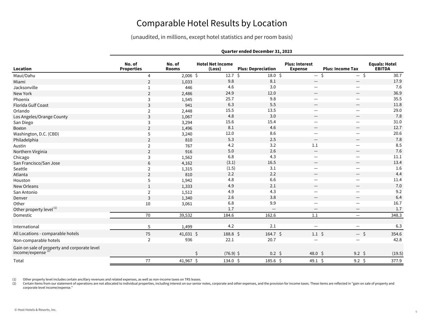 © Host Hotels & Resorts, Inc. Comparable Hotel Results by Location (unaudited, in millions, except hotel statistics and per room basis) (1) RevPAR is the product of the average daily room rate charged and the average daily occupancy achieved. (2) Total Revenues per Available Room (“Total RevPAR”) is a summary measure of hotel results calculated by dividing the sum of room, food and beverage and other ancillary service revenue by room nights available to guests for the period. It includes ancillary revenues not included within RevPAR. (3) Other property level includes certain ancillary revenues and related expenses, as well as non-income taxes on TRS leases. (4) See the Notes to Supplemental Financial Information for a discussion of non-GAAP measures and the calculation of comparable hotel results. CBD refers to the central business district. (5) Certain Items from our statement of operations are not allocated to individual properties, including interest on our senior notes, corporate and other expenses, and the provision for income taxes. These items are reflected in “gain on sale of property and corporate level income/expense.” Refer to the table below for reconciliation of net income to EBITDA by location. 8 Quarter ended December 31, 2023 Location No. of Properties No. of Rooms Average Room Rate Average Occupancy Percentage RevPAR (1) Total revenues Total Revenues per Available Room (2) Hotel Net Income (Loss) Hotel EBITDA Maui/Oahu 4 2,006 $538.69 68.2% $367.34 $ 97.2 $526.58 $ 12.7 $ 30.7 Miami 2 1,033 519.42 70.1% 364.20 62.3 634.85 9.8 17.9 Jacksonville 1 446 462.07 61.0% 282.04 27.4 667.98 4.6 7.6 New York 2 2,486 425.56 86.1% 366.52 119.3 521.48 24.9 36.9 Phoenix 3 1,545 394.12 70.6% 278.15 93.3 656.24 25.7 35.5 Florida Gulf Coast 3 941 359.77 66.2% 238.22 43.4 502.10 6.3 11.8 Orlando 2 2,448 440.40 57.7% 253.96 109.1 484.34 15.5 29.0 Los Angeles/Orange County 3 1,067 291.79 78.7% 229.71 35.6 362.26 4.8 7.8 San Diego 3 3,294 266.67 70.1% 187.00 109.6 361.53 15.6 31.0 Boston 2 1,496 270.00 76.8% 207.42 39.5 286.74 8.1 12.7 Washington, D.C. (CBD) 5 3,240 276.09 66.5% 183.60 79.2 265.57 12.0 20.6 Philadelphia 2 810 237.30 78.4% 186.01 22.0 297.12 5.3 7.8 Austin 2 767 301.13 63.1% 189.87 22.4 317.18 4.2 8.5 Northern Virginia 2 916 250.71 70.1% 175.77 25.8 306.43 5.0 7.6 Chicago 3 1,562 241.08 67.9% 163.77 33.7 234.57 6.8 11.1 San Francisco/San Jose 6 4,162 245.15 65.2% 159.91 91.4 238.77 (3.1) 13.4 Seattle 2 1,315 229.80 59.8% 137.51 23.5 194.01 (1.5) 1.6 Atlanta 2 810 189.95 71.1% 135.11 16.2 217.58 2.2 4.4 Houston 5 1,942 199.88 65.5% 131.02 34.2 192.13 4.8 11.4 New Orleans 1 1,333 198.05 67.8% 134.37 24.9 202.90 4.9 7.0 San Antonio 2 1,512 209.83 58.4% 122.59 27.4 196.80 4.9 9.2 Denver 3 1,340 188.69 58.3% 109.97 22.6 184.52 2.6 6.4 Other 10 3,061 287.52 60.4% 173.53 76.9 270.49 6.8 16.7 Other property level (3) 0.2 1.7 1.7 Domestic 70 39,532 306.03 67.5% 206.48 1,237.1 339.61 184.6 348.3 International 5 1,499 179.17 60.8% 108.98 23.3 168.78 4.2 6.3 All Locations - comparable hotels (4) 75 41,031 $301.84 67.2% $202.92 $ 1,260.4 $333.43 $ 188.8 $ 354.6 Non-comparable hotels 2 936 62.6 22.1 42.8 Gain on sale of property and corporate level income/expense (5) — (76.9) (19.5) Total 77 41,967 — — — $ 1,323.0 — $ 134.0 $ 377.9