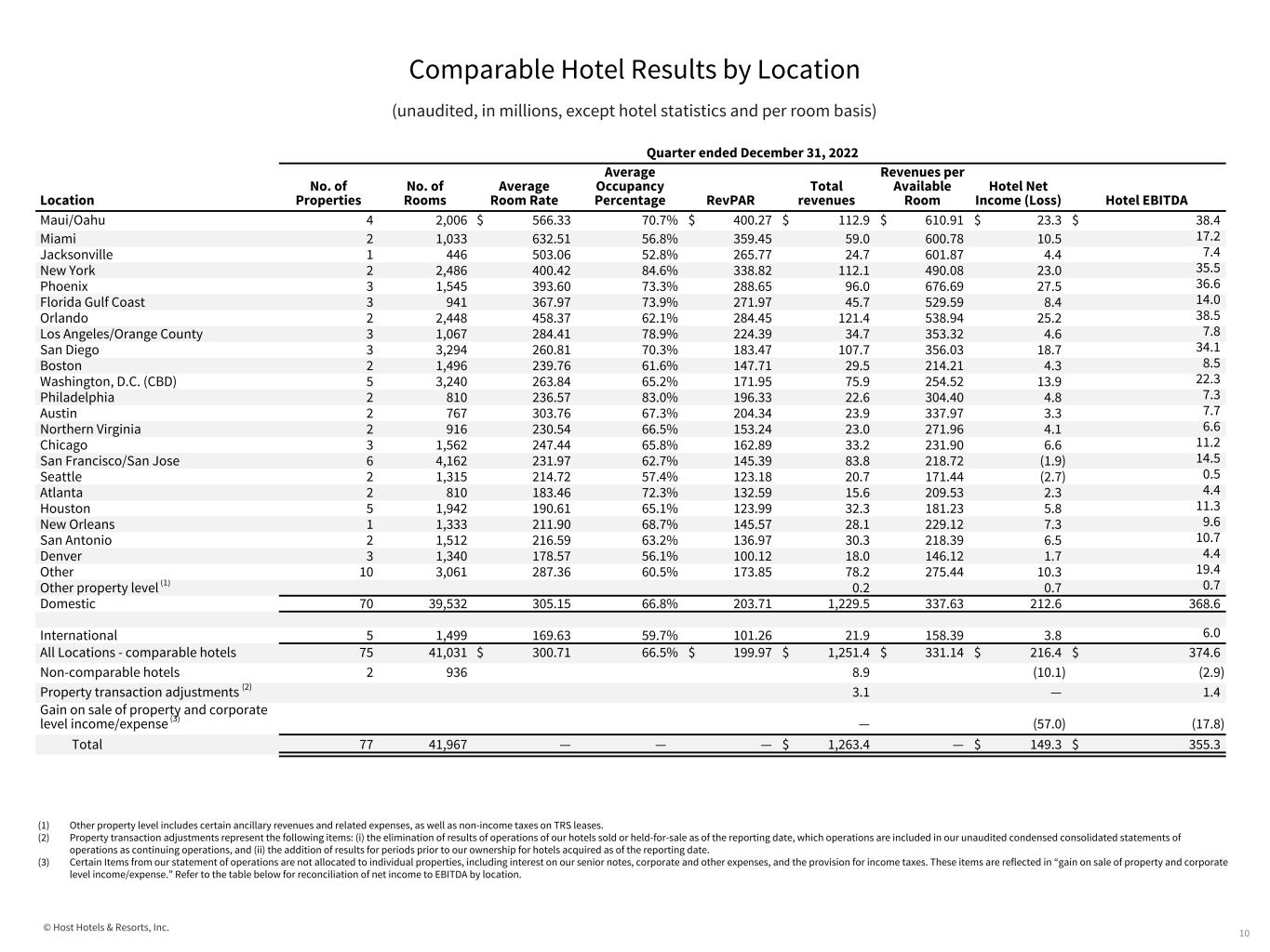 © Host Hotels & Resorts, Inc. Comparable Hotel Results by Location (unaudited, in millions, except hotel statistics and per room basis) 9 (1) Other property level includes certain ancillary revenues and related expenses, as well as non-income taxes on TRS leases. (2) Certain Items from our statement of operations are not allocated to individual properties, including interest on our senior notes, corporate and other expenses, and the provision for income taxes. These items are reflected in “gain on sale of property and corporate level income/expense.” Quarter ended December 31, 2023 Location No. of Properties No. of Rooms Hotel Net Income (Loss) Plus: Depreciation Plus: Interest Expense Plus: Income Tax Equals: Hotel EBITDA Maui/Oahu 4 2,006 $ 12.7 $ 18.0 $ — $ — $ 30.7 Miami 2 1,033 9.8 8.1 — — 17.9 Jacksonville 1 446 4.6 3.0 — — 7.6 New York 2 2,486 24.9 12.0 — — 36.9 Phoenix 3 1,545 25.7 9.8 — — 35.5 Florida Gulf Coast 3 941 6.3 5.5 — — 11.8 Orlando 2 2,448 15.5 13.5 — — 29.0 Los Angeles/Orange County 3 1,067 4.8 3.0 — — 7.8 San Diego 3 3,294 15.6 15.4 — — 31.0 Boston 2 1,496 8.1 4.6 — — 12.7 Washington, D.C. (CBD) 5 3,240 12.0 8.6 — — 20.6 Philadelphia 2 810 5.3 2.5 — — 7.8 Austin 2 767 4.2 3.2 1.1 — 8.5 Northern Virginia 2 916 5.0 2.6 — — 7.6 Chicago 3 1,562 6.8 4.3 — — 11.1 San Francisco/San Jose 6 4,162 (3.1) 16.5 — — 13.4 Seattle 2 1,315 (1.5) 3.1 — — 1.6 Atlanta 2 810 2.2 2.2 — — 4.4 Houston 5 1,942 4.8 6.6 — — 11.4 New Orleans 1 1,333 4.9 2.1 — — 7.0 San Antonio 2 1,512 4.9 4.3 — — 9.2 Denver 3 1,340 2.6 3.8 — — 6.4 Other 10 3,061 6.8 9.9 — — 16.7 Other property level (1) 1.7 — — — 1.7 Domestic 70 39,532 184.6 162.6 1.1 — 348.3 International 5 1,499 4.2 2.1 — — 6.3 All Locations - comparable hotels 75 41,031 $ 188.8 $ 164.7 $ 1.1 $ — $ 354.6 Non-comparable hotels 2 936 22.1 20.7 — — 42.8 Gain on sale of property and corporate level income/expense (2) $ (76.9) $ 0.2 $ 48.0 $ 9.2 $ (19.5) Total 77 41,967 $ 134.0 $ 185.6 $ 49.1 $ 9.2 $ 377.9