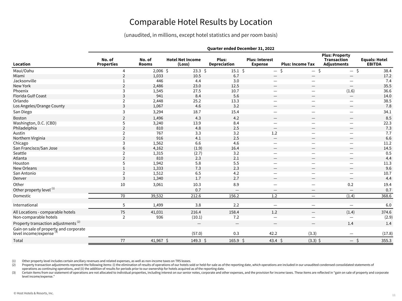 © Host Hotels & Resorts, Inc. Comparable Hotel Results by Location (unaudited, in millions, except hotel statistics and per room basis) (1) Other property level includes certain ancillary revenues and related expenses, as well as non-income taxes on TRS leases. (2) Property transaction adjustments represent the following items: (i) the elimination of results of operations of our hotels sold or held-for-sale as of the reporting date, which operations are included in our unaudited condensed consolidated statements of operations as continuing operations, and (ii) the addition of results for periods prior to our ownership for hotels acquired as of the reporting date. (3) Certain Items from our statement of operations are not allocated to individual properties, including interest on our senior notes, corporate and other expenses, and the provision for income taxes. These items are reflected in “gain on sale of property and corporate level income/expense.” Refer to the table below for reconciliation of net income to EBITDA by location. 10 Quarter ended December 31, 2022 Location No. of Properties No. of Rooms Average Room Rate Average Occupancy Percentage RevPAR Total revenues Total Revenues per Available Room Hotel Net Income (Loss) Hotel EBITDA Maui/Oahu 4 2,006 $ 566.33 70.7% $ 400.27 $ 112.9 $ 610.91 $ 23.3 $ 38.4 Miami 2 1,033 632.51 56.8% 359.45 59.0 600.78 10.5 17.2 Jacksonville 1 446 503.06 52.8% 265.77 24.7 601.87 4.4 7.4 New York 2 2,486 400.42 84.6% 338.82 112.1 490.08 23.0 35.5 Phoenix 3 1,545 393.60 73.3% 288.65 96.0 676.69 27.5 36.6 Florida Gulf Coast 3 941 367.97 73.9% 271.97 45.7 529.59 8.4 14.0 Orlando 2 2,448 458.37 62.1% 284.45 121.4 538.94 25.2 38.5 Los Angeles/Orange County 3 1,067 284.41 78.9% 224.39 34.7 353.32 4.6 7.8 San Diego 3 3,294 260.81 70.3% 183.47 107.7 356.03 18.7 34.1 Boston 2 1,496 239.76 61.6% 147.71 29.5 214.21 4.3 8.5 Washington, D.C. (CBD) 5 3,240 263.84 65.2% 171.95 75.9 254.52 13.9 22.3 Philadelphia 2 810 236.57 83.0% 196.33 22.6 304.40 4.8 7.3 Austin 2 767 303.76 67.3% 204.34 23.9 337.97 3.3 7.7 Northern Virginia 2 916 230.54 66.5% 153.24 23.0 271.96 4.1 6.6 Chicago 3 1,562 247.44 65.8% 162.89 33.2 231.90 6.6 11.2 San Francisco/San Jose 6 4,162 231.97 62.7% 145.39 83.8 218.72 (1.9) 14.5 Seattle 2 1,315 214.72 57.4% 123.18 20.7 171.44 (2.7) 0.5 Atlanta 2 810 183.46 72.3% 132.59 15.6 209.53 2.3 4.4 Houston 5 1,942 190.61 65.1% 123.99 32.3 181.23 5.8 11.3 New Orleans 1 1,333 211.90 68.7% 145.57 28.1 229.12 7.3 9.6 San Antonio 2 1,512 216.59 63.2% 136.97 30.3 218.39 6.5 10.7 Denver 3 1,340 178.57 56.1% 100.12 18.0 146.12 1.7 4.4 Other 10 3,061 287.36 60.5% 173.85 78.2 275.44 10.3 19.4 Other property level (1) 0.2 0.7 0.7 Domestic 70 39,532 305.15 66.8% 203.71 1,229.5 337.63 212.6 368.6 International 5 1,499 169.63 59.7% 101.26 21.9 158.39 3.8 6.0 All Locations - comparable hotels 75 41,031 $ 300.71 66.5% $ 199.97 $ 1,251.4 $ 331.14 $ 216.4 $ 374.6 Non-comparable hotels 2 936 8.9 (10.1) (2.9) Property transaction adjustments (2) 3.1 — 1.4 Gain on sale of property and corporate level income/expense (3) — (57.0) (17.8) Total 77 41,967 — — — $ 1,263.4 — $ 149.3 $ 355.3
