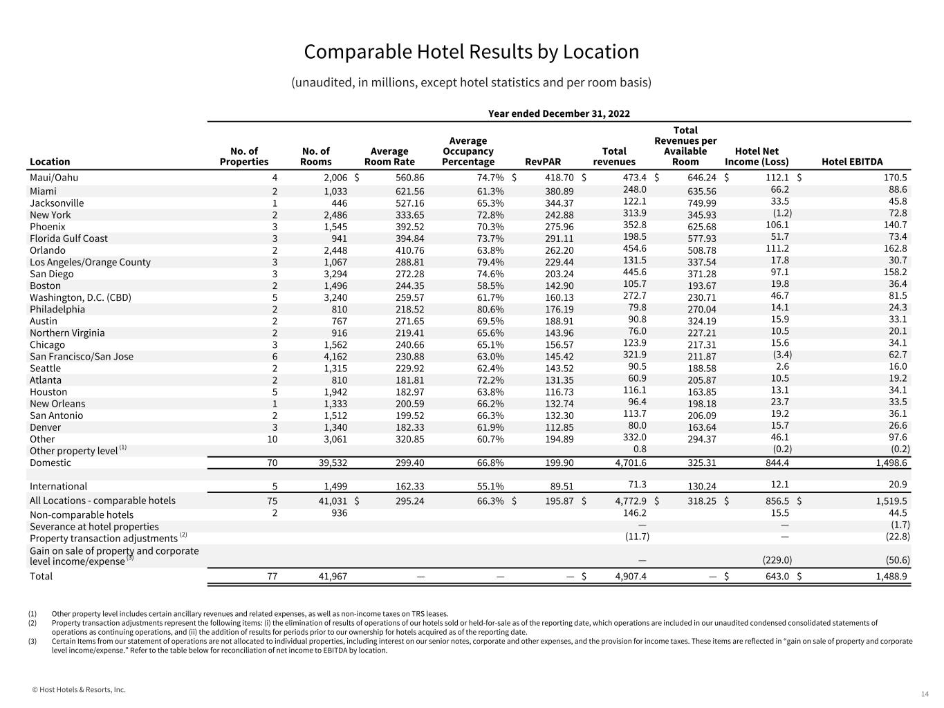 © Host Hotels & Resorts, Inc. Comparable Hotel Results by Location (unaudited, in millions, except hotel statistics and per room basis) 13 Year ended December 31, 2023 Location No. of Properties No. of Rooms Hotel Net Income (Loss) Plus: Depreciation Plus: Interest Expense Plus: Income Tax Plus: Property Transaction Adjustments Equals: Hotel EBITDA Maui/Oahu 4 2,006 $ 85.3 $ 67.6 $ — $ — $ — $ 152.9 Miami 2 1,033 44.2 30.0 — — — 74.2 Jacksonville 1 446 34.1 12.1 — — — 46.2 New York 2 2,486 43.2 49.2 — — — 92.4 Phoenix 3 1,545 102.3 39.6 — — (2.9) 139.0 Florida Gulf Coast 3 941 48.8 22.3 — — — 71.1 Orlando 2 2,448 90.5 52.8 — — — 143.3 Los Angeles/Orange County 3 1,067 19.5 12.4 — — — 31.9 San Diego 3 3,294 105.5 62.0 — — — 167.5 Boston 2 1,496 32.9 18.3 — — — 51.2 Washington, D.C. (CBD) 5 3,240 66.8 34.1 — — — 100.9 Philadelphia 2 810 17.4 9.7 — — — 27.1 Austin 2 767 10.0 12.8 4.1 — — 26.9 Northern Virginia 2 916 15.5 9.8 — — — 25.3 Chicago 3 1,562 24.0 17.3 — — — 41.3 San Francisco/San Jose 6 4,162 2.5 65.1 — — — 67.6 Seattle 2 1,315 6.1 12.4 — — — 18.5 Atlanta 2 810 12.0 8.5 — — — 20.5 Houston 5 1,942 16.6 25.0 — — — 41.6 New Orleans 1 1,333 25.4 8.6 — — — 34.0 San Antonio 2 1,512 18.6 16.5 — — — 35.1 Denver 3 1,340 13.9 13.6 — — — 27.5 Other 10 3,061 52.4 40.4 — — — 92.8 Other property level (1) 0.3 — — — — 0.3 Domestic 70 39,532 887.8 640.1 4.1 — (2.9) 1,529.1 International 5 1,499 19.3 8.6 — — — 27.9 All Locations - comparable hotels 75 41,031 $ 907.1 $ 648.7 $ 4.1 $ — $ (2.9) $ 1,557.0 Non-comparable hotels 2 936 45.8 46.7 — — — 92.5 Property transaction adjustments (2) — — — — 2.9 2.9 Gain on sale of property and corporate level income/expense (3) (201.2) 1.2 187.1 36.3 — 23.4 Total 77 41,967 $ 751.7 $ 696.6 $ 191.2 $ 36.3 $ — $ 1,675.8 (1) Other property level includes certain ancillary revenues and related expenses, as well as non-income taxes on TRS leases. (2) Property transaction adjustments represent the following items: (i) the elimination of results of operations of our hotels sold or held-for-sale as of the reporting date, which operations are included in our unaudited condensed consolidated statements of operations as continuing operations, and (ii) the addition of results for periods prior to our ownership for hotels acquired as of the reporting date. (3) Certain Items from our statement of operations are not allocated to individual properties, including interest on our senior notes, corporate and other expenses, and the provision for income taxes. These items are reflected in “gain on sale of property and corporate level income/expense."