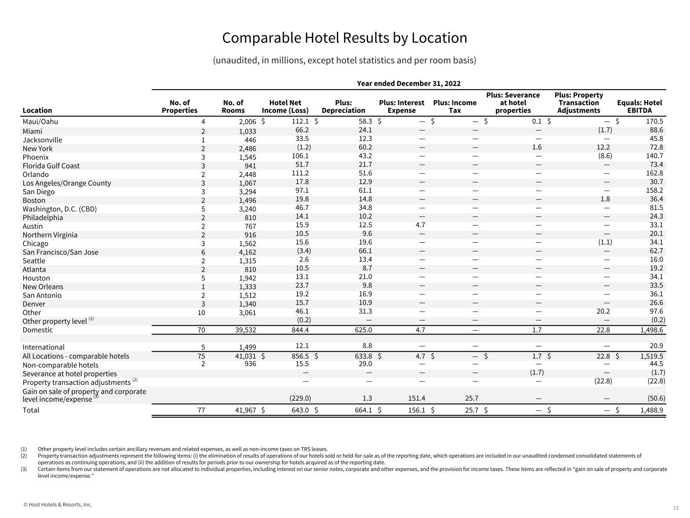 © Host Hotels & Resorts, Inc. Comparable Hotel Results by Location (unaudited, in millions, except hotel statistics and per room basis) 14 Year ended December 31, 2022 Location No. of Properties No. of Rooms Average Room Rate Average Occupancy Percentage RevPAR Total revenues Total Revenues per Available Room Hotel Net Income (Loss) Hotel EBITDA Maui/Oahu 4 2,006 $ 560.86 74.7% $ 418.70 $ 473.4 $ 646.24 $ 112.1 $ 170.5 Miami 2 1,033 621.56 61.3% 380.89 248.0 635.56 66.2 88.6 Jacksonville 1 446 527.16 65.3% 344.37 122.1 749.99 33.5 45.8 New York 2 2,486 333.65 72.8% 242.88 313.9 345.93 (1.2) 72.8 Phoenix 3 1,545 392.52 70.3% 275.96 352.8 625.68 106.1 140.7 Florida Gulf Coast 3 941 394.84 73.7% 291.11 198.5 577.93 51.7 73.4 Orlando 2 2,448 410.76 63.8% 262.20 454.6 508.78 111.2 162.8 Los Angeles/Orange County 3 1,067 288.81 79.4% 229.44 131.5 337.54 17.8 30.7 San Diego 3 3,294 272.28 74.6% 203.24 445.6 371.28 97.1 158.2 Boston 2 1,496 244.35 58.5% 142.90 105.7 193.67 19.8 36.4 Washington, D.C. (CBD) 5 3,240 259.57 61.7% 160.13 272.7 230.71 46.7 81.5 Philadelphia 2 810 218.52 80.6% 176.19 79.8 270.04 14.1 24.3 Austin 2 767 271.65 69.5% 188.91 90.8 324.19 15.9 33.1 Northern Virginia 2 916 219.41 65.6% 143.96 76.0 227.21 10.5 20.1 Chicago 3 1,562 240.66 65.1% 156.57 123.9 217.31 15.6 34.1 San Francisco/San Jose 6 4,162 230.88 63.0% 145.42 321.9 211.87 (3.4) 62.7 Seattle 2 1,315 229.92 62.4% 143.52 90.5 188.58 2.6 16.0 Atlanta 2 810 181.81 72.2% 131.35 60.9 205.87 10.5 19.2 Houston 5 1,942 182.97 63.8% 116.73 116.1 163.85 13.1 34.1 New Orleans 1 1,333 200.59 66.2% 132.74 96.4 198.18 23.7 33.5 San Antonio 2 1,512 199.52 66.3% 132.30 113.7 206.09 19.2 36.1 Denver 3 1,340 182.33 61.9% 112.85 80.0 163.64 15.7 26.6 Other 10 3,061 320.85 60.7% 194.89 332.0 294.37 46.1 97.6 Other property level (1) 0.8 (0.2) (0.2) Domestic 70 39,532 299.40 66.8% 199.90 4,701.6 325.31 844.4 1,498.6 International 5 1,499 162.33 55.1% 89.51 71.3 130.24 12.1 20.9 All Locations - comparable hotels 75 41,031 $ 295.24 66.3% $ 195.87 $ 4,772.9 $ 318.25 $ 856.5 $ 1,519.5 Non-comparable hotels 2 936 146.2 15.5 44.5 Severance at hotel properties — — (1.7) Property transaction adjustments (2) (11.7) — (22.8) Gain on sale of property and corporate level income/expense (3) — (229.0) (50.6) Total 77 41,967 — — — $ 4,907.4 — $ 643.0 $ 1,488.9 (1) Other property level includes certain ancillary revenues and related expenses, as well as non-income taxes on TRS leases. (2) Property transaction adjustments represent the following items: (i) the elimination of results of operations of our hotels sold or held-for-sale as of the reporting date, which operations are included in our unaudited condensed consolidated statements of operations as continuing operations, and (ii) the addition of results for periods prior to our ownership for hotels acquired as of the reporting date. (3) Certain Items from our statement of operations are not allocated to individual properties, including interest on our senior notes, corporate and other expenses, and the provision for income taxes. These items are reflected in “gain on sale of property and corporate level income/expense.” Refer to the table below for reconciliation of net income to EBITDA by location.