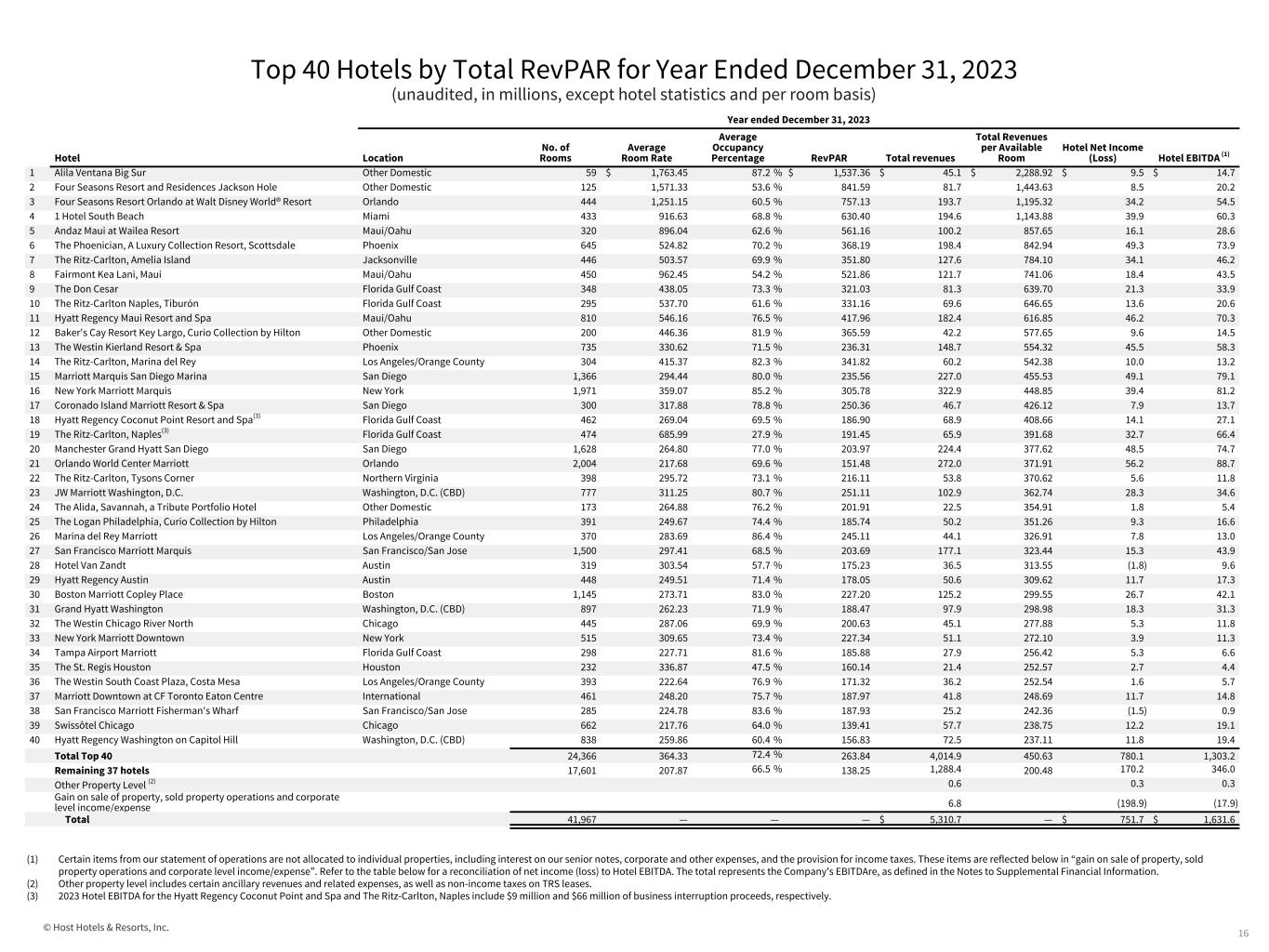 © Host Hotels & Resorts, Inc. Year ended December 31, 2022 Location No. of Properties No. of Rooms Hotel Net Income (Loss) Plus: Depreciation Plus: Interest Expense Plus: Income Tax Plus: Severance at hotel properties Plus: Property Transaction Adjustments Equals: Hotel EBITDA Maui/Oahu 4 2,006 $ 112.1 $ 58.3 $ — $ — $ 0.1 $ — $ 170.5 Miami 2 1,033 66.2 24.1 — — — (1.7) 88.6 Jacksonville 1 446 33.5 12.3 — — — — 45.8 New York 2 2,486 (1.2) 60.2 — — 1.6 12.2 72.8 Phoenix 3 1,545 106.1 43.2 — — — (8.6) 140.7 Florida Gulf Coast 3 941 51.7 21.7 — — — — 73.4 Orlando 2 2,448 111.2 51.6 — — — — 162.8 Los Angeles/Orange County 3 1,067 17.8 12.9 — — — — 30.7 San Diego 3 3,294 97.1 61.1 — — — — 158.2 Boston 2 1,496 19.8 14.8 — — — 1.8 36.4 Washington, D.C. (CBD) 5 3,240 46.7 34.8 — — — — 81.5 Philadelphia 2 810 14.1 10.2 — — — — 24.3 Austin 2 767 15.9 12.5 4.7 — — — 33.1 Northern Virginia 2 916 10.5 9.6 — — — — 20.1 Chicago 3 1,562 15.6 19.6 — — — (1.1) 34.1 San Francisco/San Jose 6 4,162 (3.4) 66.1 — — — — 62.7 Seattle 2 1,315 2.6 13.4 — — — — 16.0 Atlanta 2 810 10.5 8.7 — — — — 19.2 Houston 5 1,942 13.1 21.0 — — — — 34.1 New Orleans 1 1,333 23.7 9.8 — — — — 33.5 San Antonio 2 1,512 19.2 16.9 — — — — 36.1 Denver 3 1,340 15.7 10.9 — — — — 26.6 Other 10 3,061 46.1 31.3 — — — 20.2 97.6 Other property level (1) (0.2) — — — — — (0.2) Domestic 70 39,532 844.4 625.0 4.7 — 1.7 22.8 1,498.6 International 5 1,499 12.1 8.8 — — — — 20.9 All Locations - comparable hotels 75 41,031 $ 856.5 $ 633.8 $ 4.7 $ — $ 1.7 $ 22.8 $ 1,519.5 Non-comparable hotels 2 936 15.5 29.0 — — — — 44.5 Severance at hotel properties — — — — (1.7) — (1.7) Property transaction adjustments (2) — — — — — (22.8) (22.8) Gain on sale of property and corporate level income/expense (3) (229.0) 1.3 151.4 25.7 — — (50.6) Total 77 41,967 $ 643.0 $ 664.1 $ 156.1 $ 25.7 $ — $ — $ 1,488.9 Comparable Hotel Results by Location (unaudited, in millions, except hotel statistics and per room basis) 15 (1) Other property level includes certain ancillary revenues and related expenses, as well as non-income taxes on TRS leases. (2) Property transaction adjustments represent the following items: (i) the elimination of results of operations of our hotels sold or held-for-sale as of the reporting date, which operations are included in our unaudited condensed consolidated statements of operations as continuing operations, and (ii) the addition of results for periods prior to our ownership for hotels acquired as of the reporting date. (3) Certain Items from our statement of operations are not allocated to individual properties, including interest on our senior notes, corporate and other expenses, and the provision for income taxes. These items are reflected in “gain on sale of property and corporate level income/expense.”