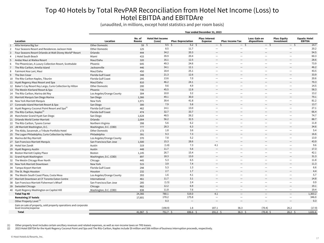 © Host Hotels & Resorts, Inc. Top 40 Hotels by Total RevPAR for Year Ended December 31, 2023 (unaudited, in millions, except hotel statistics and per room basis) 16 Year ended December 31, 2023 Hotel Location No. of Rooms Average Room Rate Average Occupancy Percentage RevPAR Total revenues Total Revenues per Available Room Hotel Net Income (Loss) Hotel EBITDA (1) 1 Alila Ventana Big Sur Other Domestic 59 $ 1,763.45 87.2 % $ 1,537.36 $ 45.1 $ 2,288.92 $ 9.5 $ 14.7 2 Four Seasons Resort and Residences Jackson Hole Other Domestic 125 1,571.33 53.6 % 841.59 81.7 1,443.63 8.5 20.2 3 Four Seasons Resort Orlando at Walt Disney World® Resort Orlando 444 1,251.15 60.5 % 757.13 193.7 1,195.32 34.2 54.5 4 1 Hotel South Beach Miami 433 916.63 68.8 % 630.40 194.6 1,143.88 39.9 60.3 5 Andaz Maui at Wailea Resort Maui/Oahu 320 896.04 62.6 % 561.16 100.2 857.65 16.1 28.6 6 The Phoenician, A Luxury Collection Resort, Scottsdale Phoenix 645 524.82 70.2 % 368.19 198.4 842.94 49.3 73.9 7 The Ritz-Carlton, Amelia Island Jacksonville 446 503.57 69.9 % 351.80 127.6 784.10 34.1 46.2 8 Fairmont Kea Lani, Maui Maui/Oahu 450 962.45 54.2 % 521.86 121.7 741.06 18.4 43.5 9 The Don Cesar Florida Gulf Coast 348 438.05 73.3 % 321.03 81.3 639.70 21.3 33.9 10 The Ritz-Carlton Naples, Tiburón Florida Gulf Coast 295 537.70 61.6 % 331.16 69.6 646.65 13.6 20.6 11 Hyatt Regency Maui Resort and Spa Maui/Oahu 810 546.16 76.5 % 417.96 182.4 616.85 46.2 70.3 12 Baker's Cay Resort Key Largo, Curio Collection by Hilton Other Domestic 200 446.36 81.9 % 365.59 42.2 577.65 9.6 14.5 13 The Westin Kierland Resort & Spa Phoenix 735 330.62 71.5 % 236.31 148.7 554.32 45.5 58.3 14 The Ritz-Carlton, Marina del Rey Los Angeles/Orange County 304 415.37 82.3 % 341.82 60.2 542.38 10.0 13.2 15 Marriott Marquis San Diego Marina San Diego 1,366 294.44 80.0 % 235.56 227.0 455.53 49.1 79.1 16 New York Marriott Marquis New York 1,971 359.07 85.2 % 305.78 322.9 448.85 39.4 81.2 17 Coronado Island Marriott Resort & Spa San Diego 300 317.88 78.8 % 250.36 46.7 426.12 7.9 13.7 18 Hyatt Regency Coconut Point Resort and Spa(3) Florida Gulf Coast 462 269.04 69.5 % 186.90 68.9 408.66 14.1 27.1 19 The Ritz-Carlton, Naples(3) Florida Gulf Coast 474 685.99 27.9 % 191.45 65.9 391.68 32.7 66.4 20 Manchester Grand Hyatt San Diego San Diego 1,628 264.80 77.0 % 203.97 224.4 377.62 48.5 74.7 21 Orlando World Center Marriott Orlando 2,004 217.68 69.6 % 151.48 272.0 371.91 56.2 88.7 22 The Ritz-Carlton, Tysons Corner Northern Virginia 398 295.72 73.1 % 216.11 53.8 370.62 5.6 11.8 23 JW Marriott Washington, D.C. Washington, D.C. (CBD) 777 311.25 80.7 % 251.11 102.9 362.74 28.3 34.6 24 The Alida, Savannah, a Tribute Portfolio Hotel Other Domestic 173 264.88 76.2 % 201.91 22.5 354.91 1.8 5.4 25 The Logan Philadelphia, Curio Collection by Hilton Philadelphia 391 249.67 74.4 % 185.74 50.2 351.26 9.3 16.6 26 Marina del Rey Marriott Los Angeles/Orange County 370 283.69 86.4 % 245.11 44.1 326.91 7.8 13.0 27 San Francisco Marriott Marquis San Francisco/San Jose 1,500 297.41 68.5 % 203.69 177.1 323.44 15.3 43.9 28 Hotel Van Zandt Austin 319 303.54 57.7 % 175.23 36.5 313.55 (1.8) 9.6 29 Hyatt Regency Austin Austin 448 249.51 71.4 % 178.05 50.6 309.62 11.7 17.3 30 Boston Marriott Copley Place Boston 1,145 273.71 83.0 % 227.20 125.2 299.55 26.7 42.1 31 Grand Hyatt Washington Washington, D.C. (CBD) 897 262.23 71.9 % 188.47 97.9 298.98 18.3 31.3 32 The Westin Chicago River North Chicago 445 287.06 69.9 % 200.63 45.1 277.88 5.3 11.8 33 New York Marriott Downtown New York 515 309.65 73.4 % 227.34 51.1 272.10 3.9 11.3 34 Tampa Airport Marriott Florida Gulf Coast 298 227.71 81.6 % 185.88 27.9 256.42 5.3 6.6 35 The St. Regis Houston Houston 232 336.87 47.5 % 160.14 21.4 252.57 2.7 4.4 36 The Westin South Coast Plaza, Costa Mesa Los Angeles/Orange County 393 222.64 76.9 % 171.32 36.2 252.54 1.6 5.7 37 Marriott Downtown at CF Toronto Eaton Centre International 461 248.20 75.7 % 187.97 41.8 248.69 11.7 14.8 38 San Francisco Marriott Fisherman's Wharf San Francisco/San Jose 285 224.78 83.6 % 187.93 25.2 242.36 (1.5) 0.9 39 Swissôtel Chicago Chicago 662 217.76 64.0 % 139.41 57.7 238.75 12.2 19.1 40 Hyatt Regency Washington on Capitol Hill Washington, D.C. (CBD) 838 259.86 60.4 % 156.83 72.5 237.11 11.8 19.4 Total Top 40 24,366 364.33 72.4 % 263.84 4,014.9 450.63 780.1 1,303.2 Remaining 37 hotels 17,601 207.87 66.5 % 138.25 1,288.4 200.48 170.2 346.0 Other Property Level (2) 0.6 0.3 0.3 Gain on sale of property, sold property operations and corporate level income/expense 6.8 (198.9) (17.9) Total 41,967 — — — $ 5,310.7 — $ 751.7 $ 1,631.6 (1) Certain items from our statement of operations are not allocated to individual properties, including interest on our senior notes, corporate and other expenses, and the provision for income taxes. These items are reflected below in “gain on sale of property, sold property operations and corporate level income/expense”. Refer to the table below for a reconciliation of net income (loss) to Hotel EBITDA. The total represents the Company's EBITDAre, as defined in the Notes to Supplemental Financial Information. (2) Other property level includes certain ancillary revenues and related expenses, as well as non-income taxes on TRS leases. (3) 2023 Hotel EBITDA for the Hyatt Regency Coconut Point and Spa and The Ritz-Carlton, Naples include $9 million and $66 million of business interruption proceeds, respectively.