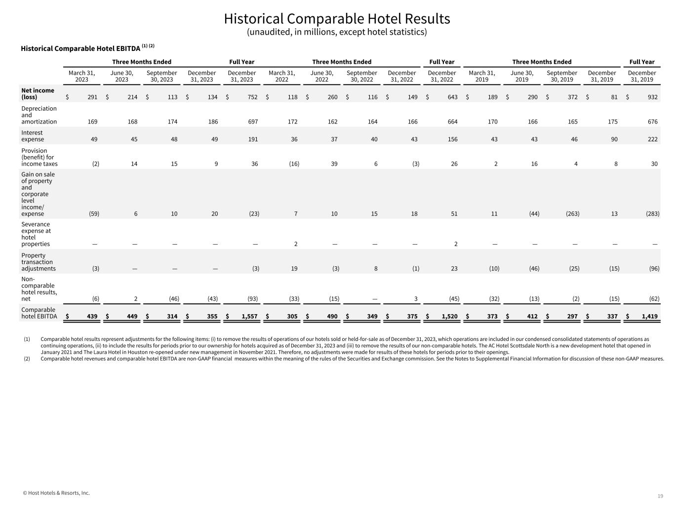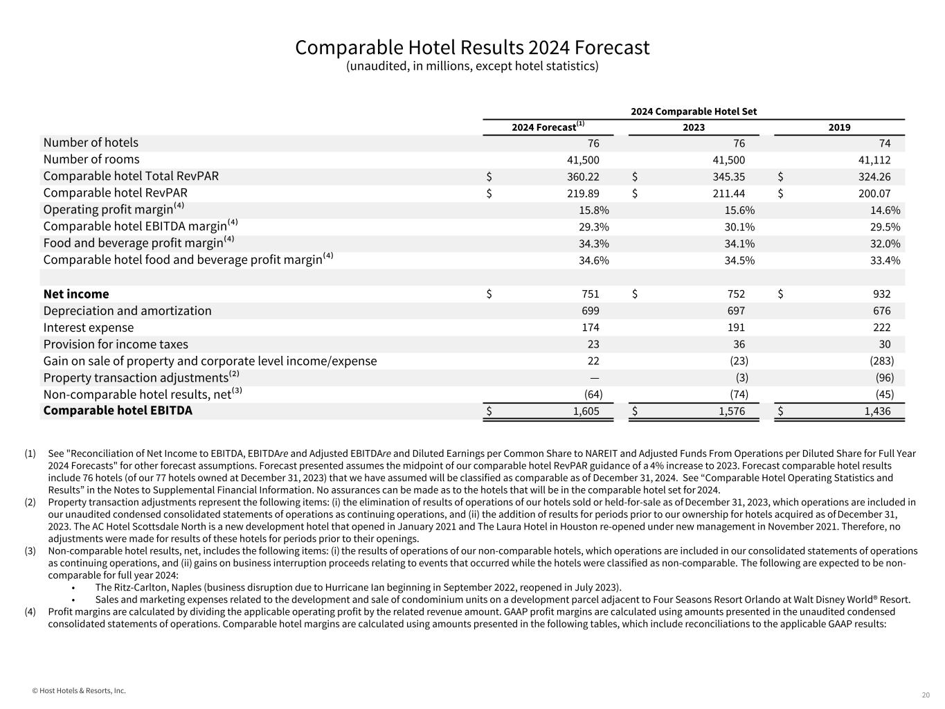 © Host Hotels & Resorts, Inc. Historical Comparable Hotel Results (unaudited, in millions, except hotel statistics) 19 Three Months Ended Full Year Three Months Ended Full Year Three Months Ended Full Year March 31, 2023 June 30, 2023 September 30, 2023 December 31, 2023 December 31, 2023 March 31, 2022 June 30, 2022 September 30, 2022 December 31, 2022 December 31, 2022 March 31, 2019 June 30, 2019 September 30, 2019 December 31, 2019 December 31, 2019 Net income (loss) $ 291 $ 214 $ 113 $ 134 $ 752 $ 118 $ 260 $ 116 $ 149 $ 643 $ 189 $ 290 $ 372 $ 81 $ 932 Depreciation and amortization 169 168 174 186 697 172 162 164 166 664 170 166 165 175 676 Interest expense 49 45 48 49 191 36 37 40 43 156 43 43 46 90 222 Provision (benefit) for income taxes (2) 14 15 9 36 (16) 39 6 (3) 26 2 16 4 8 30 Gain on sale of property and corporate level income/ expense (59) 6 10 20 (23) 7 10 15 18 51 11 (44) (263) 13 (283) Severance expense at hotel properties — — — — — 2 — — — 2 — — — — — Property transaction adjustments (3) — — — (3) 19 (3) 8 (1) 23 (10) (46) (25) (15) (96) Non- comparable hotel results, net (6) 2 (46) (43) (93) (33) (15) — 3 (45) (32) (13) (2) (15) (62) Comparable hotel EBITDA $ 439 $ 449 $ 314 $ 355 $ 1,557 $ 305 $ 490 $ 349 $ 375 $ 1,520 $ 373 $ 412 $ 297 $ 337 $ 1,419 Historical Comparable Hotel EBITDA (1) (2) (1) Comparable hotel results represent adjustments for the following items: (i) to remove the results of operations of our hotels sold or held-for-sale as of December 31, 2023, which operations are included in our condensed consolidated statements of operations as continuing operations, (ii) to include the results for periods prior to our ownership for hotels acquired as of December 31, 2023 and (iii) to remove the results of our non-comparable hotels. The AC Hotel Scottsdale North is a new development hotel that opened in January 2021 and The Laura Hotel in Houston re-opened under new management in November 2021. Therefore, no adjustments were made for results of these hotels for periods prior to their openings.  (2) Comparable hotel revenues and comparable hotel EBITDA are non-GAAP financial  measures within the meaning of the rules of the Securities and Exchange commission. See the Notes to Supplemental Financial Information for discussion of these non-GAAP measures.
