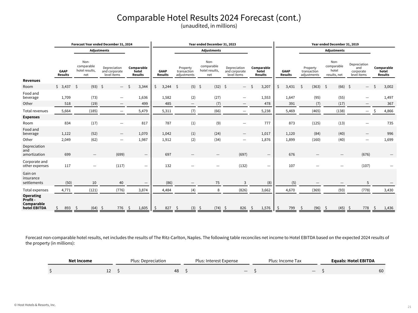 © Host Hotels & Resorts, Inc. Comparable Hotel Results 2024 Forecast (unaudited, in millions, except hotel statistics) 20 (1) See "Reconciliation of Net Income to EBITDA, EBITDAre and Adjusted EBITDAre and Diluted Earnings per Common Share to NAREIT and Adjusted Funds From Operations per Diluted Share for Full Year 2024 Forecasts" for other forecast assumptions. Forecast presented assumes the midpoint of our comparable hotel RevPAR guidance of a 4% increase to 2023. Forecast comparable hotel results include 76 hotels (of our 77 hotels owned at December 31, 2023) that we have assumed will be classified as comparable as of December 31, 2024. See “Comparable Hotel Operating Statistics and Results” in the Notes to Supplemental Financial Information. No assurances can be made as to the hotels that will be in the comparable hotel set for 2024. (2) Property transaction adjustments represent the following items: (i) the elimination of results of operations of our hotels sold or held-for-sale as of December 31, 2023, which operations are included in our unaudited condensed consolidated statements of operations as continuing operations, and (ii) the addition of results for periods prior to our ownership for hotels acquired as of December 31, 2023. The AC Hotel Scottsdale North is a new development hotel that opened in January 2021 and The Laura Hotel in Houston re-opened under new management in November 2021. Therefore, no adjustments were made for results of these hotels for periods prior to their openings. (3) Non-comparable hotel results, net, includes the following items: (i) the results of operations of our non-comparable hotels, which operations are included in our consolidated statements of operations as continuing operations, and (ii) gains on business interruption proceeds relating to events that occurred while the hotels were classified as non-comparable.  The following are expected to be non- comparable for full year 2024: • The Ritz-Carlton, Naples (business disruption due to Hurricane Ian beginning in September 2022, reopened in July 2023). • Sales and marketing expenses related to the development and sale of condominium units on a development parcel adjacent to Four Seasons Resort Orlando at Walt Disney World® Resort. (4) Profit margins are calculated by dividing the applicable operating profit by the related revenue amount. GAAP profit margins are calculated using amounts presented in the unaudited condensed consolidated statements of operations. Comparable hotel margins are calculated using amounts presented in the following tables, which include reconciliations to the applicable GAAP results: 2024 Comparable Hotel Set 2024 Forecast(1) 2023 2019 Number of hotels 76 76 74 Number of rooms 41,500 41,500 41,112 Comparable hotel Total RevPAR $ 360.22 $ 345.35 $ 324.26 Comparable hotel RevPAR $ 219.89 $ 211.44 $ 200.07 Operating profit margin⁽⁴⁾ 15.8% 15.6% 14.6% Comparable hotel EBITDA margin⁽⁴⁾ 29.3% 30.1% 29.5% Food and beverage profit margin⁽⁴⁾ 34.3% 34.1% 32.0% Comparable hotel food and beverage profit margin⁽⁴⁾ 34.6% 34.5% 33.4% Net income $ 751 $ 752 $ 932 Depreciation and amortization 699 697 676 Interest expense 174 191 222 Provision for income taxes 23 36 30 Gain on sale of property and corporate level income/expense 22 (23) (283) Property transaction adjustments⁽²⁾ — (3) (96) Non-comparable hotel results, net⁽³⁾ (64) (74) (45) Comparable hotel EBITDA $ 1,605 $ 1,576 $ 1,436