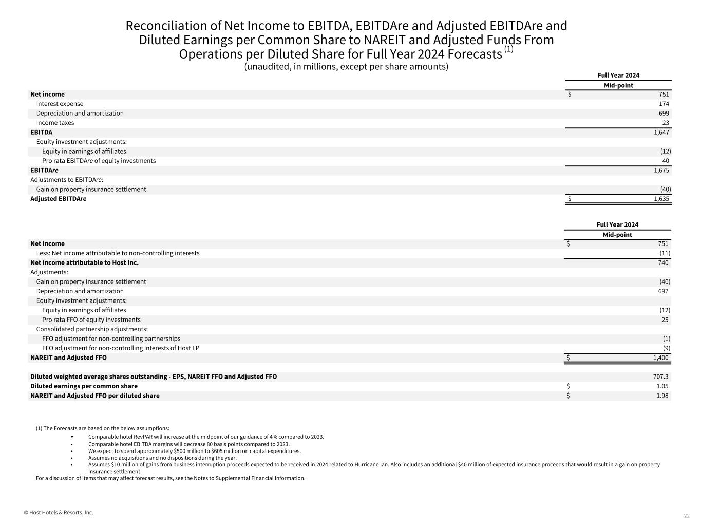© Host Hotels & Resorts, Inc. Comparable Hotel Results 2024 Forecast (cont.) (unaudited, in millions) 21 Forecast Year ended December 31, 2024 Year ended December 31, 2023 Year ended December 31, 2019 Adjustments Adjustments Adjustments GAAP Results Non- comparable hotel results, net Depreciation and corporate level items Comparable hotel Results GAAP Results Property transaction adjustments Non- comparable hotel results, net Depreciation and corporate level items Comparable hotel Results GAAP Results Property transaction adjustments Non- comparable hotel results, net Depreciation and corporate level items Comparable hotel Results Revenues Room $ 3,437 $ (93) $ — $ 3,344 $ 3,244 $ (5) $ (32) $ — $ 3,207 $ 3,431 $ (363) $ (66) $ — $ 3,002 Food and beverage 1,709 (73) — 1,636 1,582 (2) (27) — 1,553 1,647 (95) (55) — 1,497 Other 518 (19) — 499 485 — (7) — 478 391 (7) (17) — 367 Total revenues 5,664 (185) — 5,479 5,311 (7) (66) — 5,238 5,469 (465) (138) — $ 4,866 Expenses Room 834 (17) — 817 787 (1) (9) — 777 873 (125) (13) — 735 Food and beverage 1,122 (52) — 1,070 1,042 (1) (24) — 1,017 1,120 (84) (40) — 996 Other 2,049 (62) — 1,987 1,912 (2) (34) — 1,876 1,899 (160) (40) — 1,699 Depreciation and amortization 699 — (699) — 697 — — (697) — 676 — — (676) — Corporate and other expenses 117 — (117) — 132 — — (132) — 107 — — (107) — Gain on insurance settlements (50) 10 40 — (86) — 75 3 (8) (5) — — 5 — Total expenses 4,771 (121) (776) 3,874 4,484 (4) 8 (826) 3,662 4,670 (369) (93) (778) 3,430 Operating Profit - Comparable hotel EBITDA $ 893 $ (64) $ 776 $ 1,605 $ 827 $ (3) $ (74) $ 826 $ 1,576 $ 799 $ (96) $ (45) $ 778 $ 1,436 Net Income Plus: Depreciation Plus: Interest Expense Plus: Income Tax Equals: Hotel EBITDA $ 12 $ 48 $ — $ — $ 60 Forecast non-comparable hotel results, net includes the results of The Ritz-Carlton, Naples. The following table reconciles net income to Hotel EBITDA based on the expected 2024 results of the property (in millions):