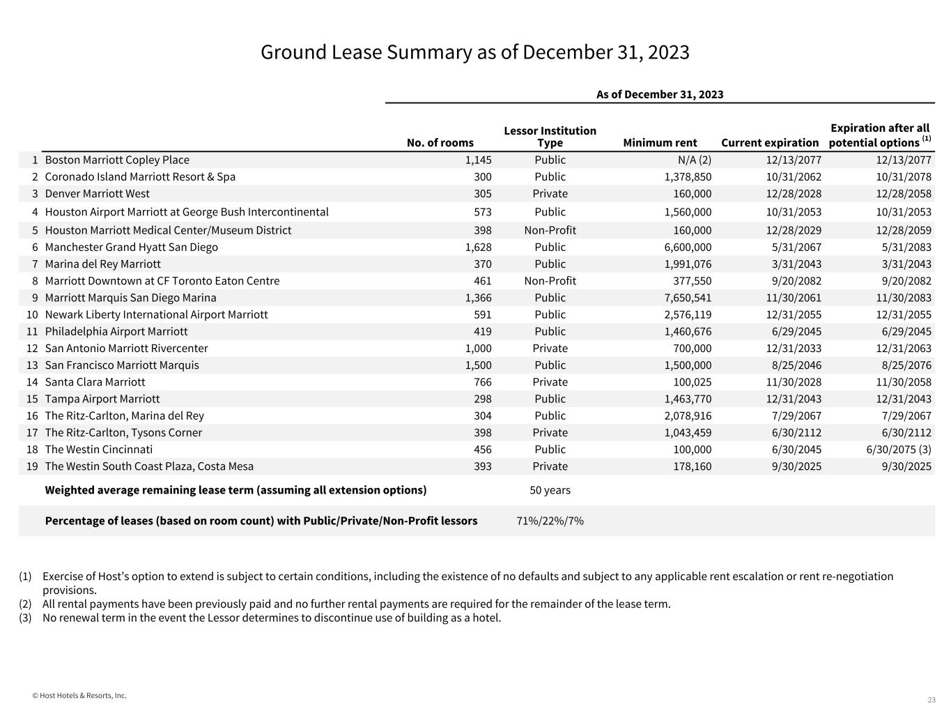 © Host Hotels & Resorts, Inc. Ground Lease Summary as of December 31, 2023 23 As of December 31, 2023 No. of rooms Lessor Institution Type Minimum rent Current expiration Expiration after all potential options (1) 1 Boston Marriott Copley Place 1,145 Public N/A (2) 12/13/2077 12/13/2077 2 Coronado Island Marriott Resort & Spa 300 Public 1,378,850 10/31/2062 10/31/2078 3 Denver Marriott West 305 Private 160,000 12/28/2028 12/28/2058 4 Houston Airport Marriott at George Bush Intercontinental 573 Public 1,560,000 10/31/2053 10/31/2053 5 Houston Marriott Medical Center/Museum District 398 Non-Profit 160,000 12/28/2029 12/28/2059 6 Manchester Grand Hyatt San Diego 1,628 Public 6,600,000 5/31/2067 5/31/2083 7 Marina del Rey Marriott 370 Public 1,991,076 3/31/2043 3/31/2043 8 Marriott Downtown at CF Toronto Eaton Centre 461 Non-Profit 377,550 9/20/2082 9/20/2082 9 Marriott Marquis San Diego Marina 1,366 Public 7,650,541 11/30/2061 11/30/2083 10 Newark Liberty International Airport Marriott 591 Public 2,576,119 12/31/2055 12/31/2055 11 Philadelphia Airport Marriott 419 Public 1,460,676 6/29/2045 6/29/2045 12 San Antonio Marriott Rivercenter 1,000 Private 700,000 12/31/2033 12/31/2063 13 San Francisco Marriott Marquis 1,500 Public 1,500,000 8/25/2046 8/25/2076 14 Santa Clara Marriott 766 Private 100,025 11/30/2028 11/30/2058 15 Tampa Airport Marriott 298 Public 1,463,770 12/31/2043 12/31/2043 16 The Ritz-Carlton, Marina del Rey 304 Public 2,078,916 7/29/2067 7/29/2067 17 The Ritz-Carlton, Tysons Corner 398 Private 1,043,459 6/30/2112 6/30/2112 18 The Westin Cincinnati 456 Public 100,000 6/30/2045 6/30/2075 (3) 19 The Westin South Coast Plaza, Costa Mesa 393 Private 178,160 9/30/2025 9/30/2025 Weighted average remaining lease term (assuming all extension options) 50 years Percentage of leases (based on room count) with Public/Private/Non-Profit lessors 71%/22%/7% (1) Exercise of Host’s option to extend is subject to certain conditions, including the existence of no defaults and subject to any applicable rent escalation or rent re-negotiation provisions. (2) All rental payments have been previously paid and no further rental payments are required for the remainder of the lease term.  (3) No renewal term in the event the Lessor determines to discontinue use of building as a hotel.