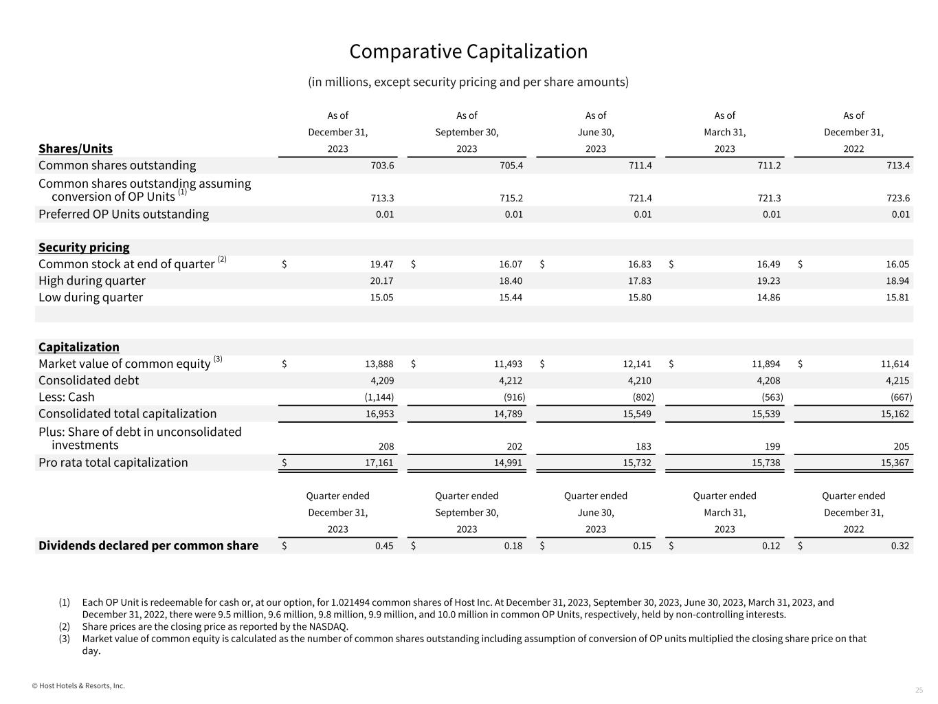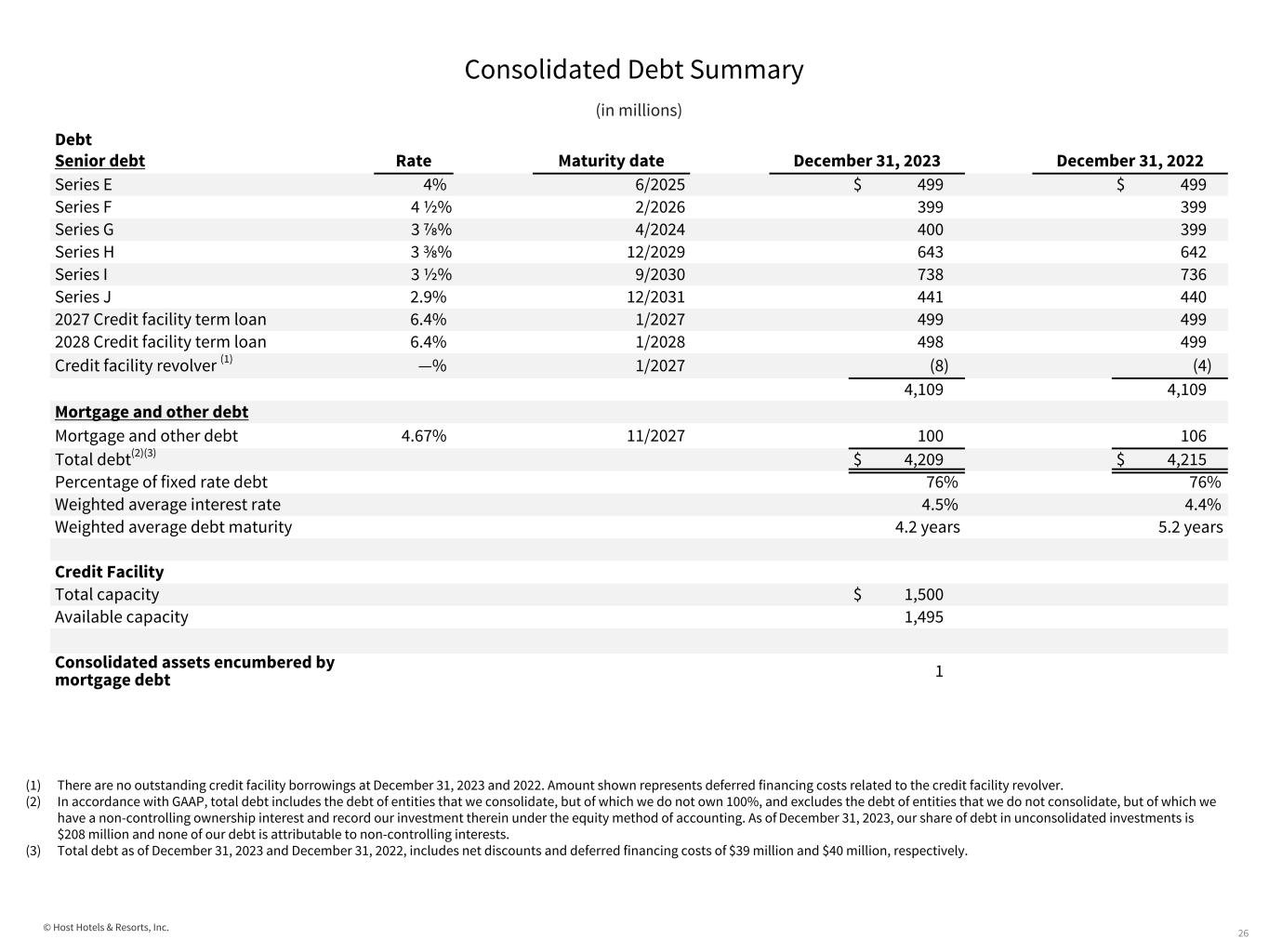 © Host Hotels & Resorts, Inc. Comparative Capitalization (in millions, except security pricing and per share amounts) 25 (1) Each OP Unit is redeemable for cash or, at our option, for 1.021494 common shares of Host Inc. At December 31, 2023, September 30, 2023, June 30, 2023, March 31, 2023, and December 31, 2022, there were 9.5 million, 9.6 million, 9.8 million, 9.9 million, and 10.0 million in common OP Units, respectively, held by non-controlling interests. (2) Share prices are the closing price as reported by the NASDAQ. (3) Market value of common equity is calculated as the number of common shares outstanding including assumption of conversion of OP units multiplied the closing share price on that day. As of As of As of As of As of December 31, September 30, June 30, March 31, December 31, Shares/Units 2023 2023 2023 2023 2022 Common shares outstanding 703.6 705.4 711.4 711.2 713.4 Common shares outstanding assuming conversion of OP Units (1) 713.3 715.2 721.4 721.3 723.6 Preferred OP Units outstanding 0.01 0.01 0.01 0.01 0.01 Security pricing Common stock at end of quarter (2) $ 19.47 $ 16.07 $ 16.83 $ 16.49 $ 16.05 High during quarter 20.17 18.40 17.83 19.23 18.94 Low during quarter 15.05 15.44 15.80 14.86 15.81 Capitalization Market value of common equity (3) $ 13,888 $ 11,493 $ 12,141 $ 11,894 $ 11,614 Consolidated debt 4,209 4,212 4,210 4,208 4,215 Less: Cash (1,144) (916) (802) (563) (667) Consolidated total capitalization 16,953 14,789 15,549 15,539 15,162 Plus: Share of debt in unconsolidated investments 208 202 183 199 205 Pro rata total capitalization $ 17,161 14,991 15,732 15,738 15,367 Quarter ended Quarter ended Quarter ended Quarter ended Quarter ended December 31, September 30, June 30, March 31, December 31, 2023 2023 2023 2023 2022 Dividends declared per common share $ 0.45 $ 0.18 $ 0.15 $ 0.12 $ 0.32