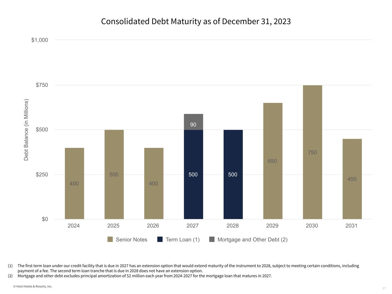 © Host Hotels & Resorts, Inc. Consolidated Debt Summary 26 (in millions) (1) There are no outstanding credit facility borrowings at December 31, 2023 and 2022. Amount shown represents deferred financing costs related to the credit facility revolver. (2) In accordance with GAAP, total debt includes the debt of entities that we consolidate, but of which we do not own 100%, and excludes the debt of entities that we do not consolidate, but of which we have a non-controlling ownership interest and record our investment therein under the equity method of accounting. As of December 31, 2023, our share of debt in unconsolidated investments is $208 million and none of our debt is attributable to non-controlling interests. (3) Total debt as of December 31, 2023 and December 31, 2022, includes net discounts and deferred financing costs of $39 million and $40 million, respectively. Debt Senior debt Rate Maturity date December 31, 2023 December 31, 2022 Series E 4% 6/2025 $ 499 $ 499 Series F 4 ½% 2/2026 399 399 Series G 3 ⅞% 4/2024 400 399 Series H 3 ⅜% 12/2029 643 642 Series I 3 ½% 9/2030 738 736 Series J 2.9% 12/2031 441 440 2027 Credit facility term loan 6.4% 1/2027 499 499 2028 Credit facility term loan 6.4% 1/2028 498 499 Credit facility revolver (1) —% 1/2027 (8) (4) 4,109 4,109 Mortgage and other debt Mortgage and other debt 4.67% 11/2027 100 106 Total debt(2)(3) $ 4,209 $ 4,215 Percentage of fixed rate debt 76% 76% Weighted average interest rate 4.5% 4.4% Weighted average debt maturity 4.2 years 5.2 years Credit Facility Total capacity $ 1,500 Available capacity 1,495 Consolidated assets encumbered by mortgage debt 1
