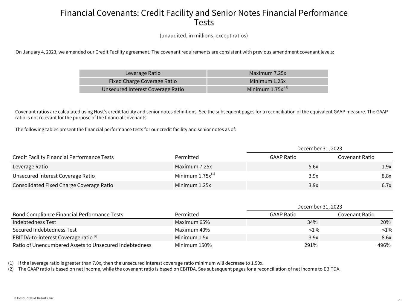 © Host Hotels & Resorts, Inc. Financial Covenants: Reconciliation of GAAP Interest Coverage Ratio to Credit Facility Fixed Charge Coverage Ratio 32 (unaudited, in millions, except ratios) The following tables present the calculation of our GAAP Interest coverage ratio and our fixed charge coverage ratio as used in the financial covenants of the credit facility: (2) The following table calculates the fixed charges per our credit facility definition. See Reconciliation of GAAP Interest Coverage Ratio to Credit Facility Unsecured Interest Coverage Ratio for reconciliation of GAAP interest expense to adjusted unsecured interest expense per our credit facility definition: (1) The following reconciles Adjusted Credit Facility EBITDA to Credit Facility Fixed Charge Coverage Ratio EBITDA. See Reconciliation of GAAP Leverage Ratio to Credit Facility Leverage Ratio for calculation and reconciliation of Adjusted Credit Facility EBITDA: GAAP Fixed Charge Coverage Ratio Year ended December 31, 2023 Net income $ 752 Interest expense 191 GAAP Fixed Charge Coverage Ratio 3.9x Credit Facility Fixed Charge Coverage Ratio Year ended December 31, 2023 Credit Facility Fixed Charge Coverage Ratio EBITDA (1) $ 1,360 Fixed charges (2) 202 Credit Facility Fixed Charge Coverage Ratio 6.7x Year ended December 31, 2023 Adjusted Credit Facility EBITDA $ 1,629 Less: 5% of hotel property gross revenue (268) Less: 3% of revenues from other real estate (1) Credit Facility Fixed Charge Coverage Ratio EBITDA $ 1,360 Year ended December 31, 2023 Adjusted Credit Facility Unsecured Interest Expense $ 184 Interest on secured debt 4 Adjusted Credit Facility Interest Expense 188 Scheduled principal payments 2 Cash taxes on ordinary income 12 Fixed Charges $ 202