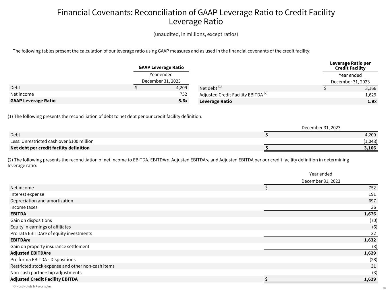 © Host Hotels & Resorts, Inc. Financial Covenants: Credit Facility and Senior Notes Financial Performance Tests 29 (unaudited, in millions, except ratios) Covenant ratios are calculated using Host’s credit facility and senior notes definitions. See the subsequent pages for a reconciliation of the equivalent GAAP measure. The GAAP ratio is not relevant for the purpose of the financial covenants. The following tables present the financial performance tests for our credit facility and senior notes as of: (1) If the leverage ratio is greater than 7.0x, then the unsecured interest coverage ratio minimum will decrease to 1.50x. (2) The GAAP ratio is based on net income, while the covenant ratio is based on EBITDA. See subsequent pages for a reconciliation of net income to EBITDA. On January 4, 2023, we amended our Credit Facility agreement. The covenant requirements are consistent with previous amendment covenant levels: Leverage Ratio Maximum 7.25x Fixed Charge Coverage Ratio Minimum 1.25x Unsecured Interest Coverage Ratio Minimum 1.75x (1) December 31, 2023 Credit Facility Financial Performance Tests Permitted GAAP Ratio Covenant Ratio Leverage Ratio Maximum 7.25x 5.6x 1.9x Unsecured Interest Coverage Ratio Minimum 1.75x(1) 3.9x 8.8x Consolidated Fixed Charge Coverage Ratio Minimum 1.25x 3.9x 6.7x December 31, 2023 Bond Compliance Financial Performance Tests Permitted GAAP Ratio Covenant Ratio Indebtedness Test Maximum 65% 34% 20% Secured Indebtedness Test Maximum 40% <1% <1% EBITDA-to-interest Coverage ratio (2) Minimum 1.5x 3.9x 8.6x Ratio of Unencumbered Assets to Unsecured Indebtedness Minimum 150% 291% 496%