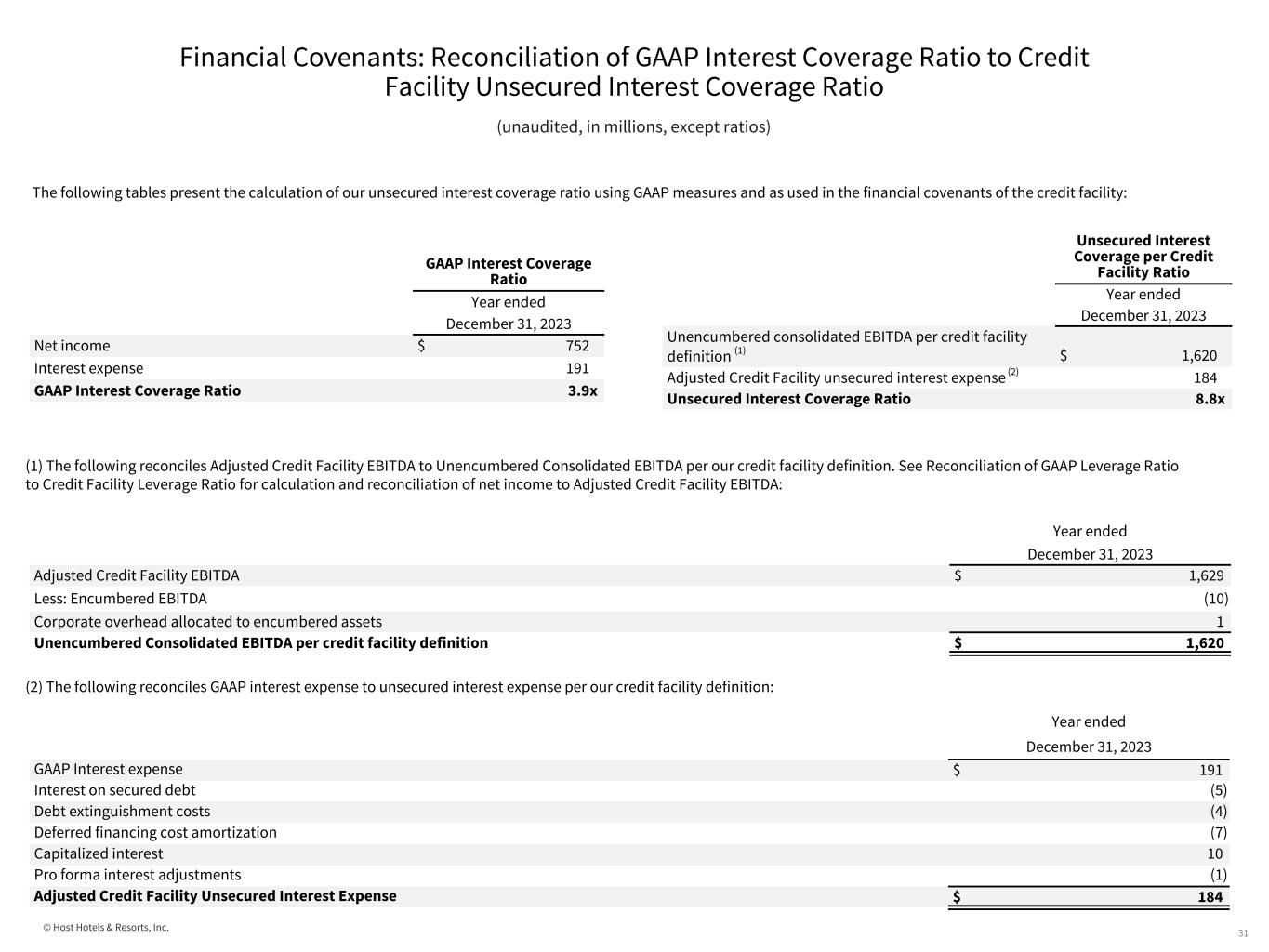 © Host Hotels & Resorts, Inc. Financial Covenants: Reconciliation of GAAP Leverage Ratio to Credit Facility Leverage Ratio 30 (unaudited, in millions, except ratios) (1) The following presents the reconciliation of debt to net debt per our credit facility definition: (2) The following presents the reconciliation of net income to EBITDA, EBITDAre, Adjusted EBITDAre and Adjusted EBITDA per our credit facility definition in determining leverage ratio: The following tables present the calculation of our leverage ratio using GAAP measures and as used in the financial covenants of the credit facility: GAAP Leverage Ratio Year ended December 31, 2023 Debt $ 4,209 Net income 752 GAAP Leverage Ratio 5.6x Leverage Ratio per Credit Facility Year ended December 31, 2023 Net debt (1) $ 3,166 Adjusted Credit Facility EBITDA (2) 1,629 Leverage Ratio 1.9x December 31, 2023 Debt $ 4,209 Less: Unrestricted cash over $100 million (1,043) Net debt per credit facility definition $ 3,166 Year ended December 31, 2023 Net income $ 752 Interest expense 191 Depreciation and amortization 697 Income taxes 36 EBITDA 1,676 Gain on dispositions (70) Equity in earnings of affiliates (6) Pro rata EBITDAre of equity investments 32 EBITDAre 1,632 Gain on property insurance settlement (3) Adjusted EBITDAre 1,629 Pro forma EBITDA - Dispositions (28) Restricted stock expense and other non-cash items 31 Non-cash partnership adjustments (3) Adjusted Credit Facility EBITDA $ 1,629