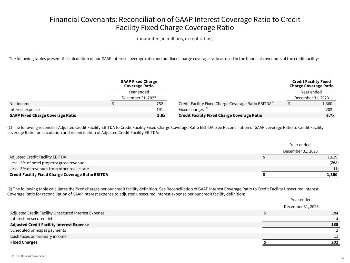 © Host Hotels & Resorts, Inc. Financial Covenants: Reconciliation of GAAP Interest Coverage Ratio to Credit Facility Unsecured Interest Coverage Ratio 31 (unaudited, in millions, except ratios) The following tables present the calculation of our unsecured interest coverage ratio using GAAP measures and as used in the financial covenants of the credit facility: (1) The following reconciles Adjusted Credit Facility EBITDA to Unencumbered Consolidated EBITDA per our credit facility definition. See Reconciliation of GAAP Leverage Ratio to Credit Facility Leverage Ratio for calculation and reconciliation of net income to Adjusted Credit Facility EBITDA: (2) The following reconciles GAAP interest expense to unsecured interest expense per our credit facility definition: GAAP Interest Coverage Ratio Year ended December 31, 2023 Net income $ 752 Interest expense 191 GAAP Interest Coverage Ratio 3.9x Unsecured Interest Coverage per Credit Facility Ratio Year ended December 31, 2023 Unencumbered consolidated EBITDA per credit facility definition (1) $ 1,620 Adjusted Credit Facility unsecured interest expense (2) 184 Unsecured Interest Coverage Ratio 8.8x Year ended December 31, 2023 Adjusted Credit Facility EBITDA $ 1,629 Less: Encumbered EBITDA (10) Corporate overhead allocated to encumbered assets 1 Unencumbered Consolidated EBITDA per credit facility definition $ 1,620 Year ended December 31, 2023 GAAP Interest expense $ 191 Interest on secured debt (5) Debt extinguishment costs (4) Deferred financing cost amortization (7) Capitalized interest 10 Pro forma interest adjustments (1) Adjusted Credit Facility Unsecured Interest Expense $ 184