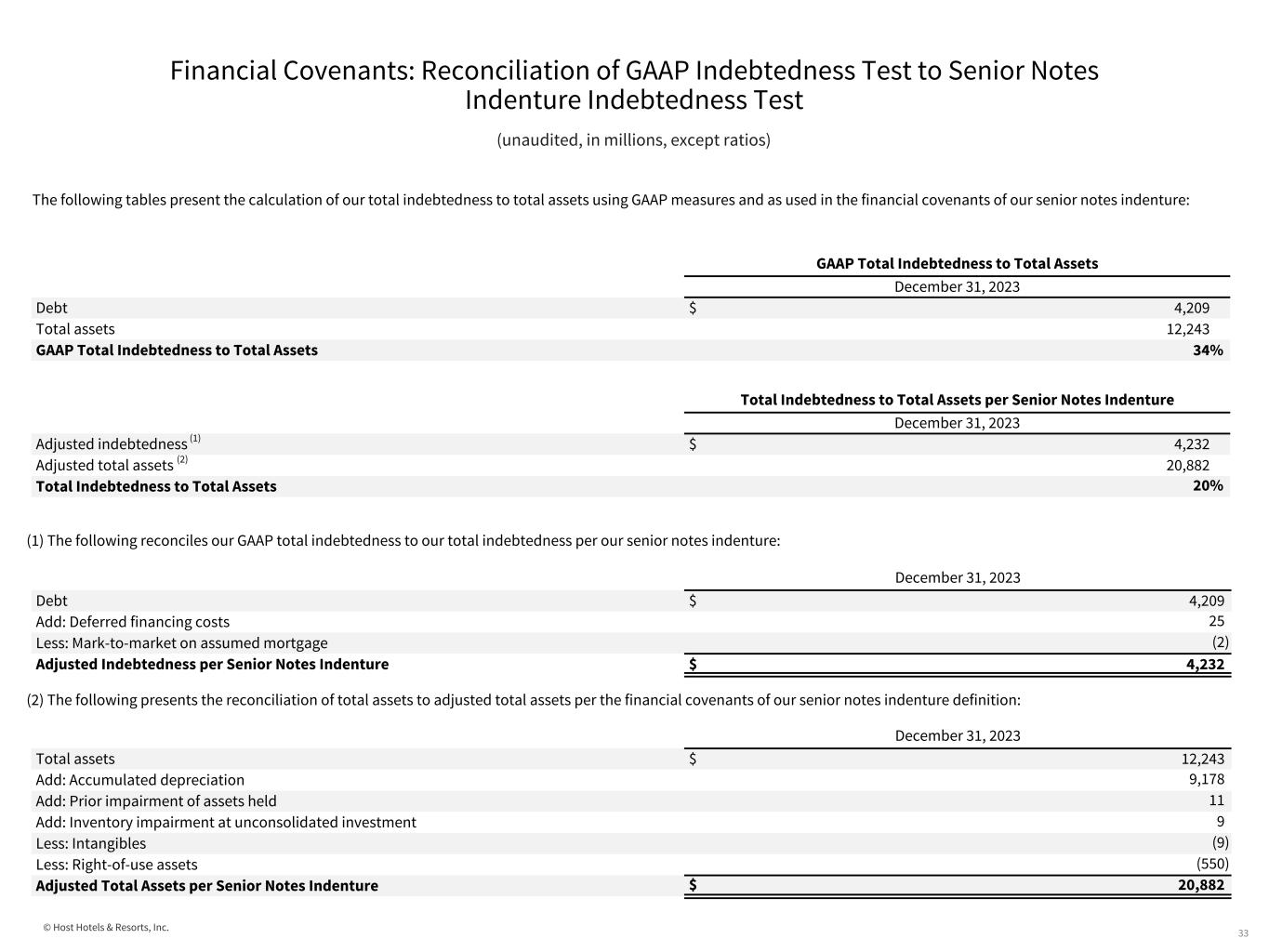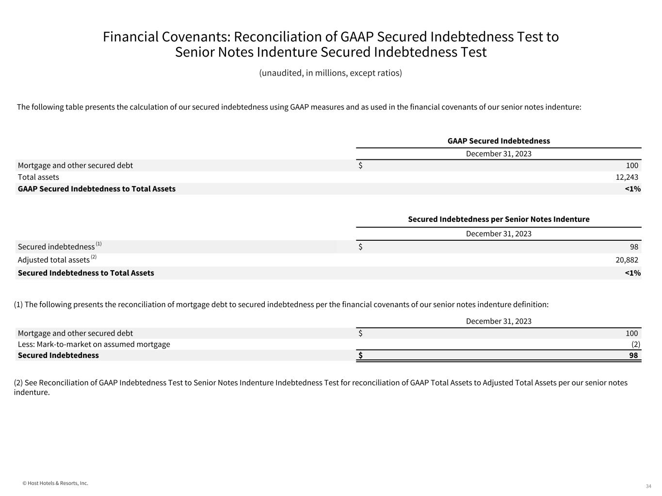 © Host Hotels & Resorts, Inc. Financial Covenants: Reconciliation of GAAP Indebtedness Test to Senior Notes Indenture Indebtedness Test 33 (unaudited, in millions, except ratios) The following tables present the calculation of our total indebtedness to total assets using GAAP measures and as used in the financial covenants of our senior notes indenture: (2) The following presents the reconciliation of total assets to adjusted total assets per the financial covenants of our senior notes indenture definition: (1) The following reconciles our GAAP total indebtedness to our total indebtedness per our senior notes indenture: GAAP Total Indebtedness to Total Assets December 31, 2023 Debt $ 4,209 Total assets 12,243 GAAP Total Indebtedness to Total Assets 34% Total Indebtedness to Total Assets per Senior Notes Indenture December 31, 2023 Adjusted indebtedness (1) $ 4,232 Adjusted total assets (2) 20,882 Total Indebtedness to Total Assets 20% December 31, 2023 Debt $ 4,209 Add: Deferred financing costs 25 Less: Mark-to-market on assumed mortgage (2) Adjusted Indebtedness per Senior Notes Indenture $ 4,232 December 31, 2023 Total assets $ 12,243 Add: Accumulated depreciation 9,178 Add: Prior impairment of assets held 11 Add: Inventory impairment at unconsolidated investment 9 Less: Intangibles (9) Less: Right-of-use assets (550) Adjusted Total Assets per Senior Notes Indenture $ 20,882